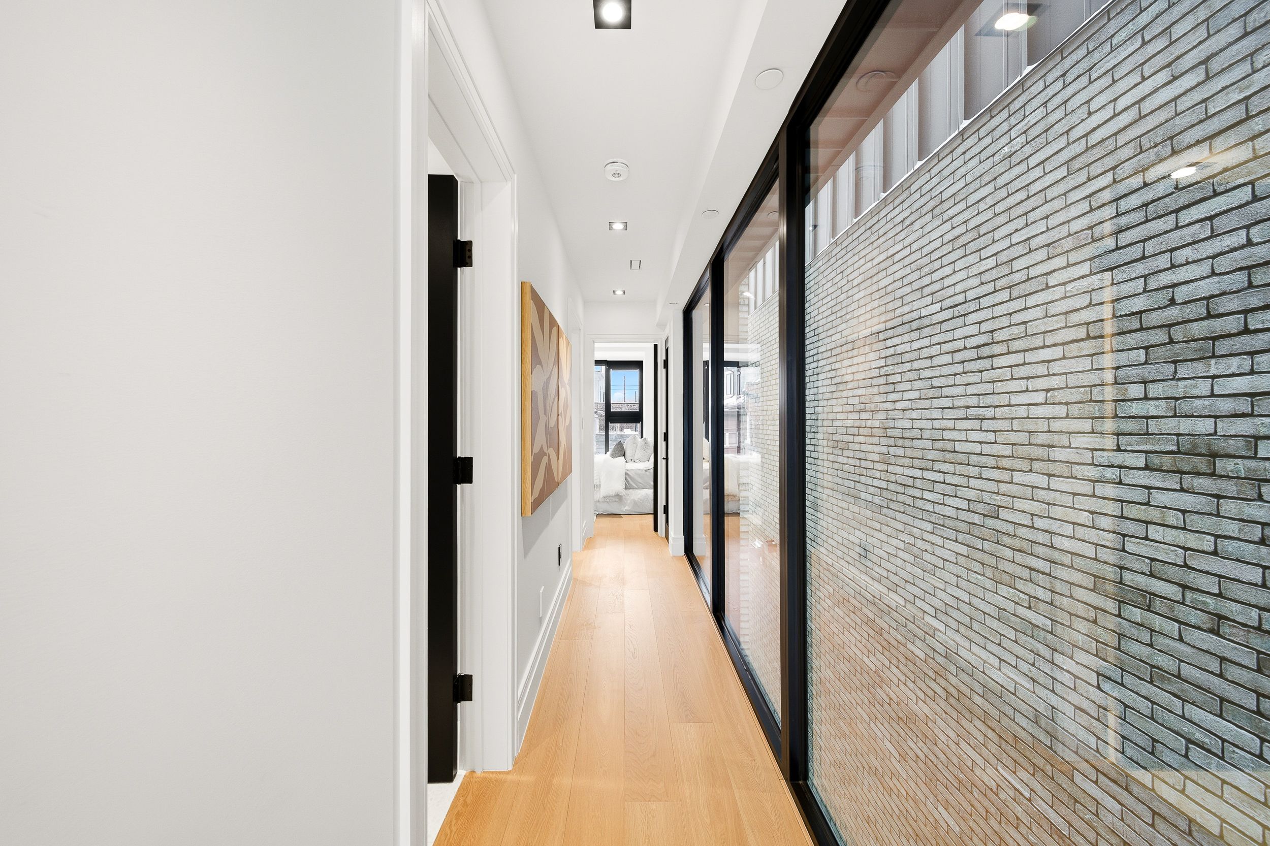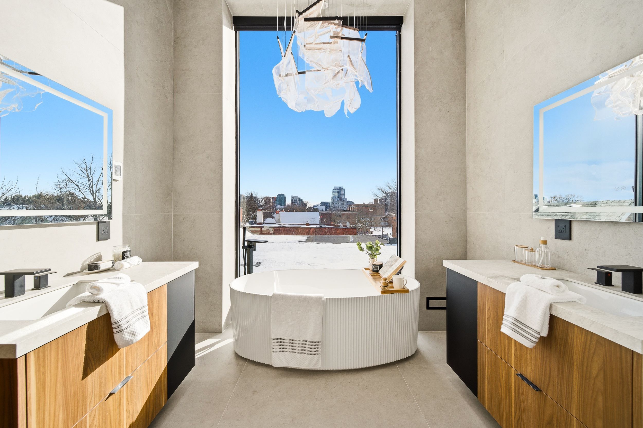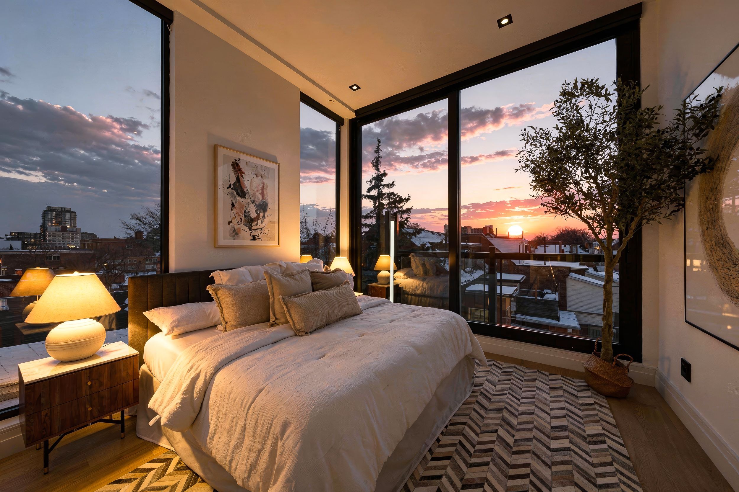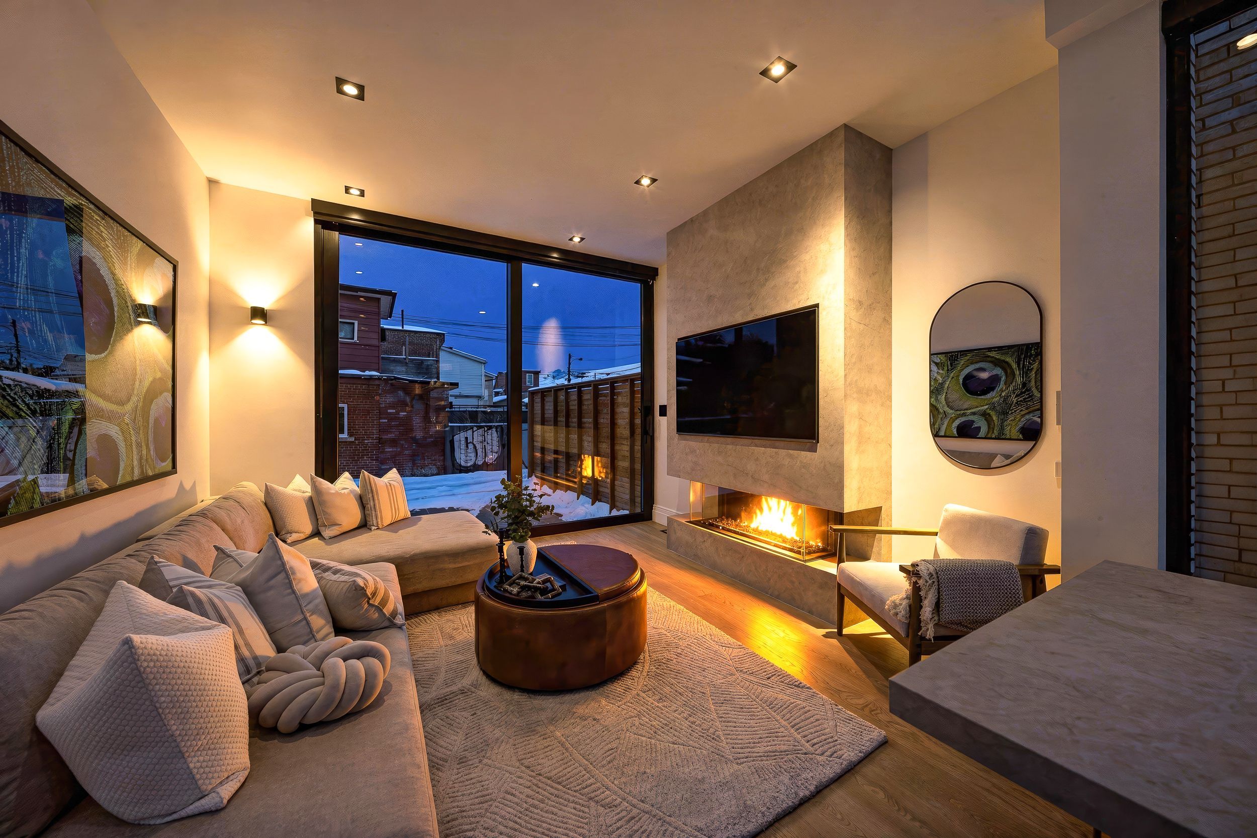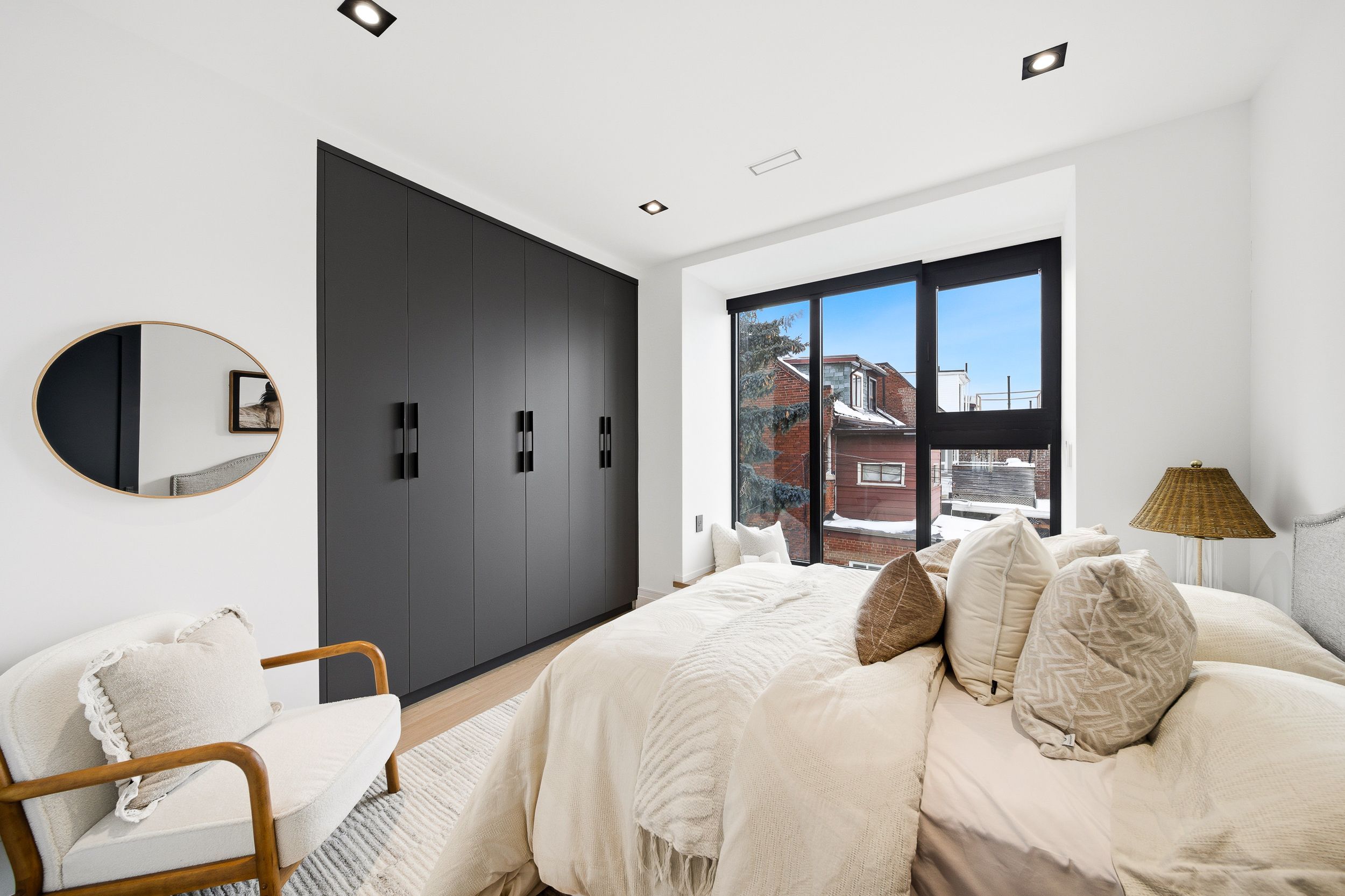 Discover this brand new, custom-built modern home with striking architectural presence, showcasing soaring ceiling heights, walls of glass, and refined detailing throughout. The main level is anchored by an impressive double-height dining area defined by 19-foot ceilings and floor-to-ceiling window walls on two sides. With east and west exposures, natural light pours through the interior from morning to evening. The kitchen features extensive custom cabinetry, taj mahal-inspired porcelain stone surfaces, and a premium integrated appliance package. The adjacent living area features a striking three-sided glass fireplace. A convenient side entrance provides direct access to the kitchen and front closet, offering functional everyday entry into the home. The upper levels continue the home's emphasis on thoughtful design, offering well-proportioned bedroom spaces, custom closets, and beautifully finished bathrooms. The full-floor primary retreat occupies its own level, featuring 11. 6-foot ceilings, and a spa-inspired ensuite with a freestanding tub, double vanity, and walk-in shower, along with extensive custom built-in storage and a built-in coffee bar with integrated beverage fridge, extending directly to a rooftop terrace with cn tower views. The lower level offers impressive ceiling height and a highly functional layout, featuring vinyl flooring throughout, a laundry area with built-in cabinetry, an additional bedroom idea for guests, a home office, or extended living space, and a three-piece bathroom. Additional features include white oak engineered flooring throughout the main and upper levels, reynaers architectural aluminum windows and doors, automated window coverings, and curated designer lighting. Fully landscaped front and rear yards complete the property, featuring turf, steel planters for a polished, low-maintenance outdoor experience. Ideally located in toronto's west end, close to neighbourhood cafes, shops, transit, and everyday conveniences.