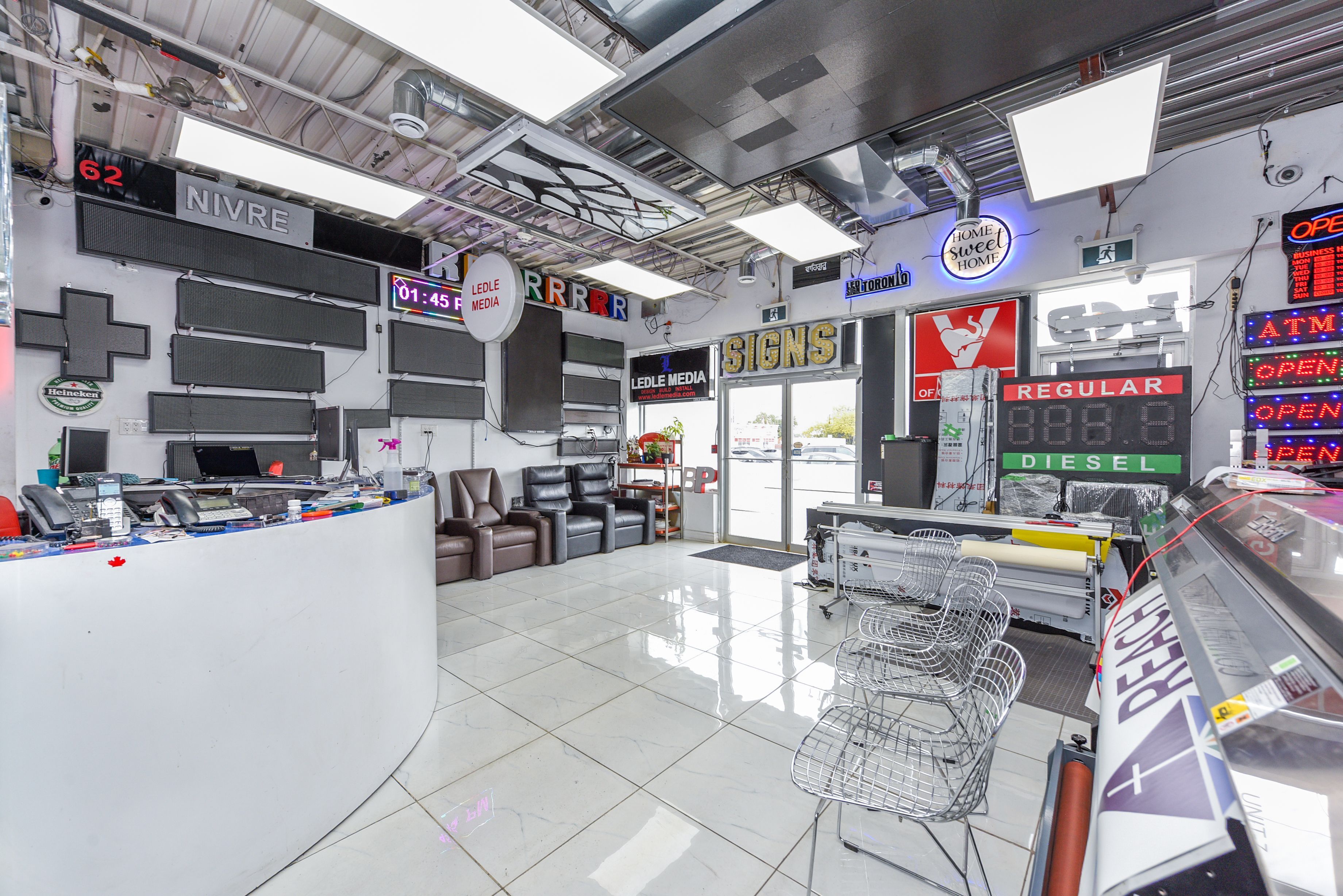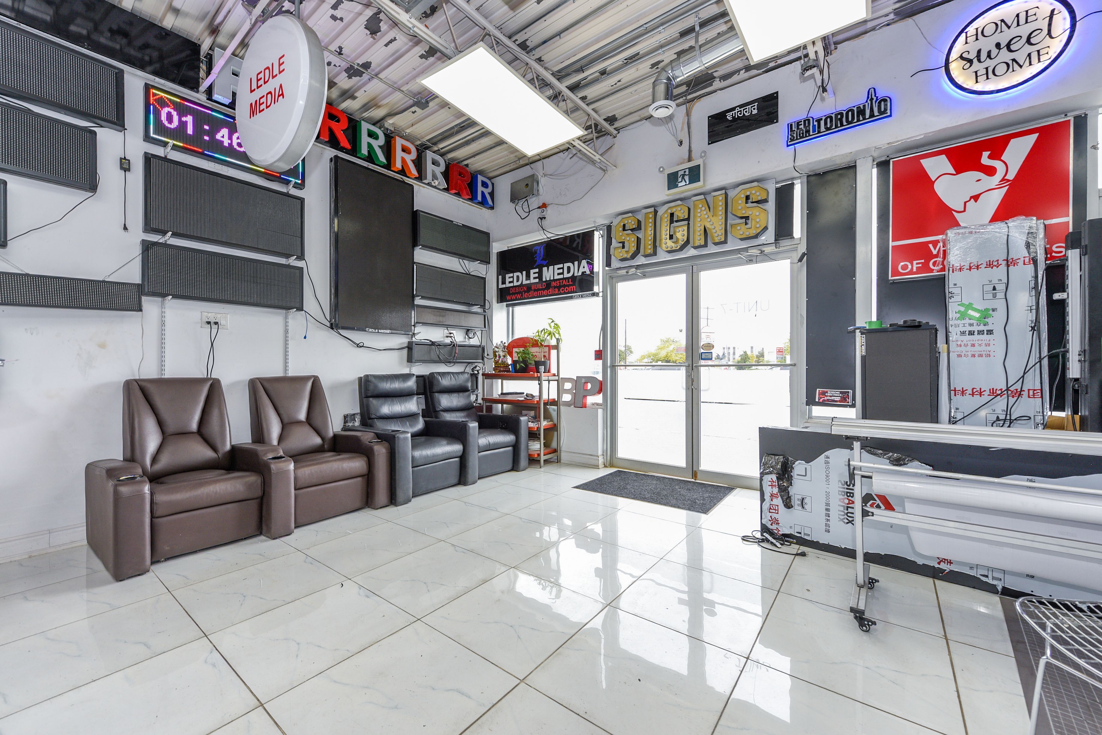 • Includes a showroom, private office, and upgraded office space.