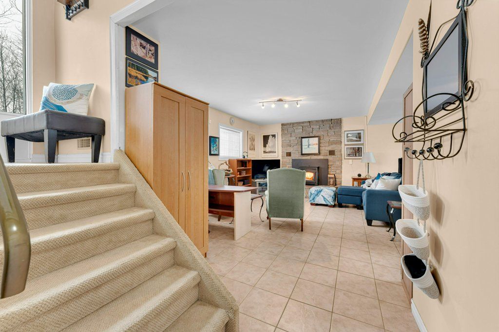 • Large recreation room with pellet stove and patio doors to the backyard.