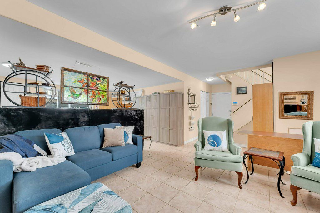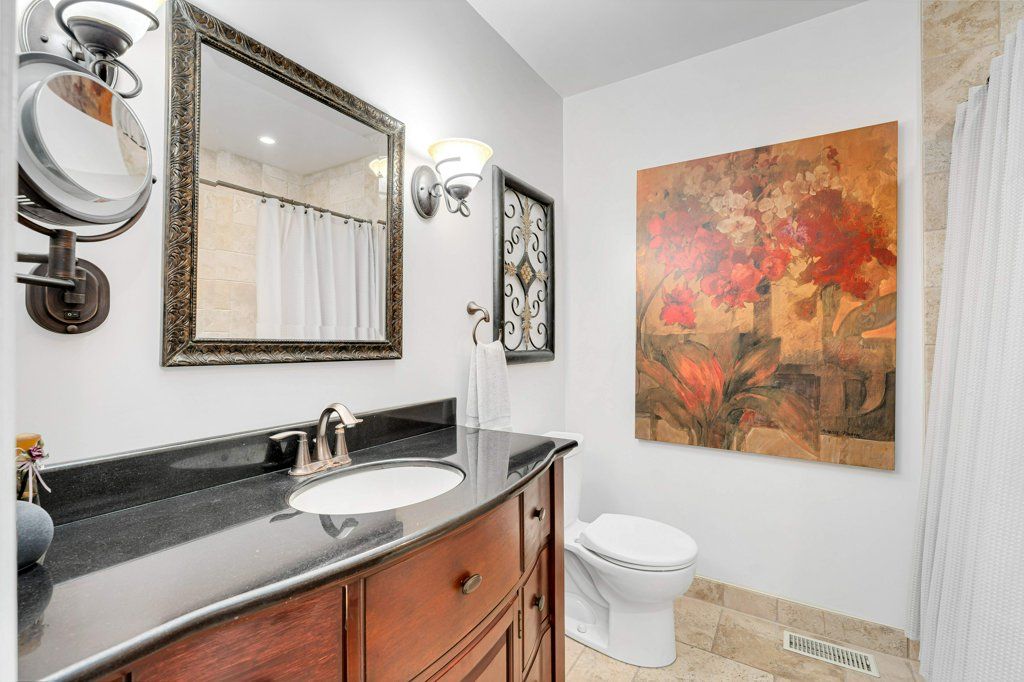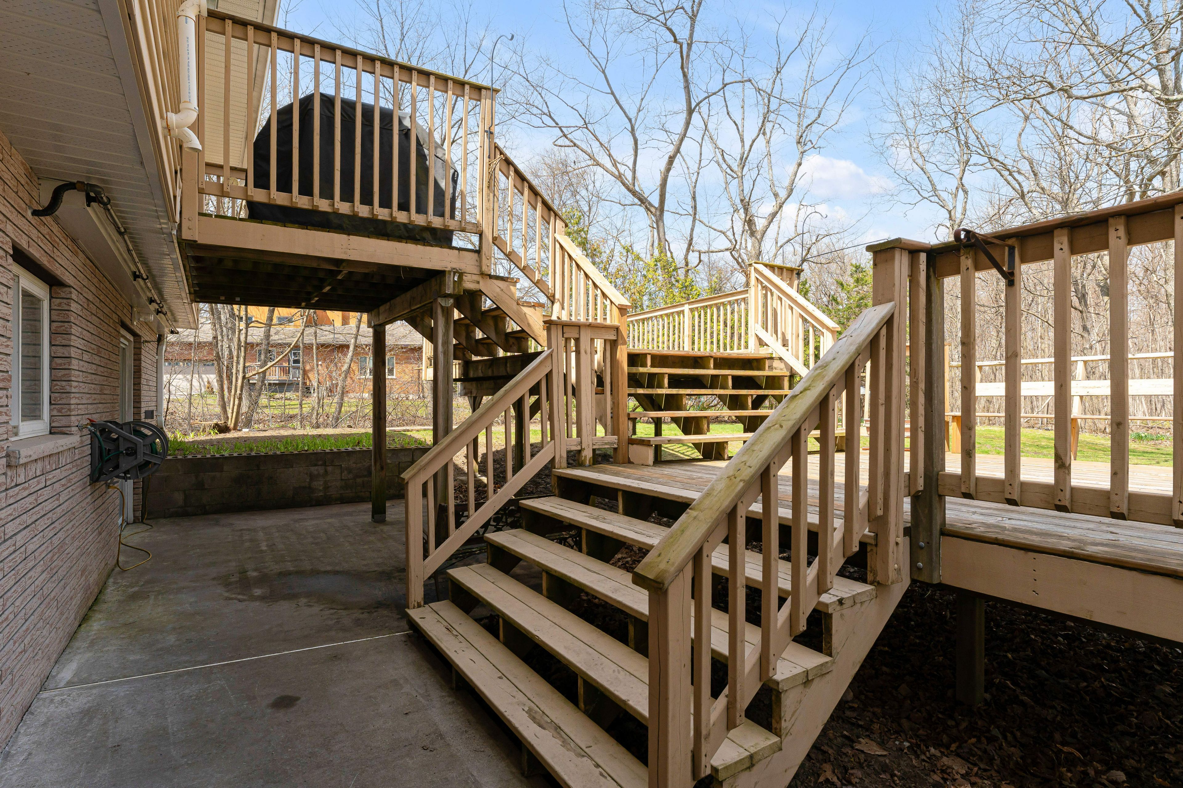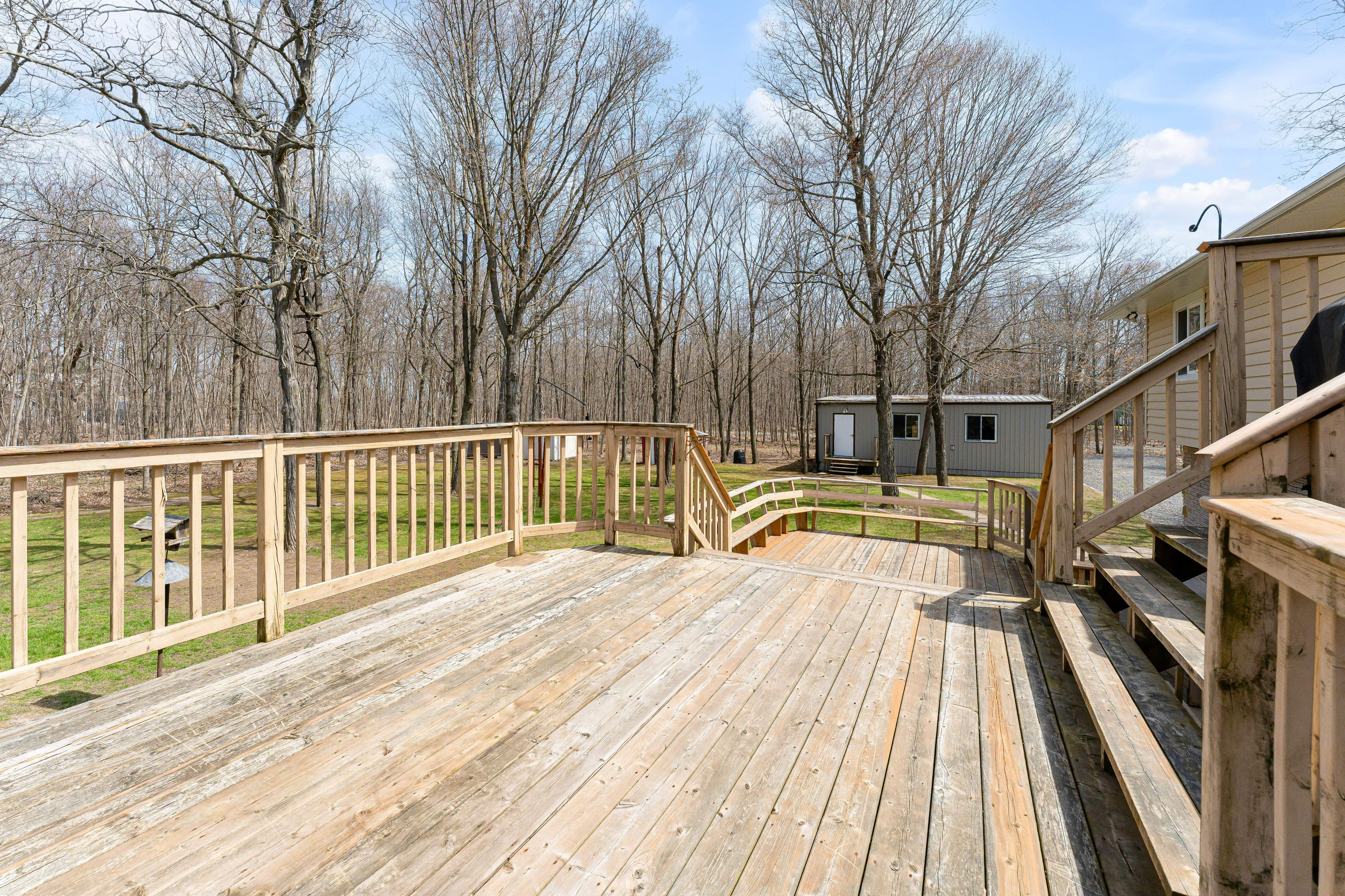 • Updated kitchen with ample workspace and access to a three-tiered deck.