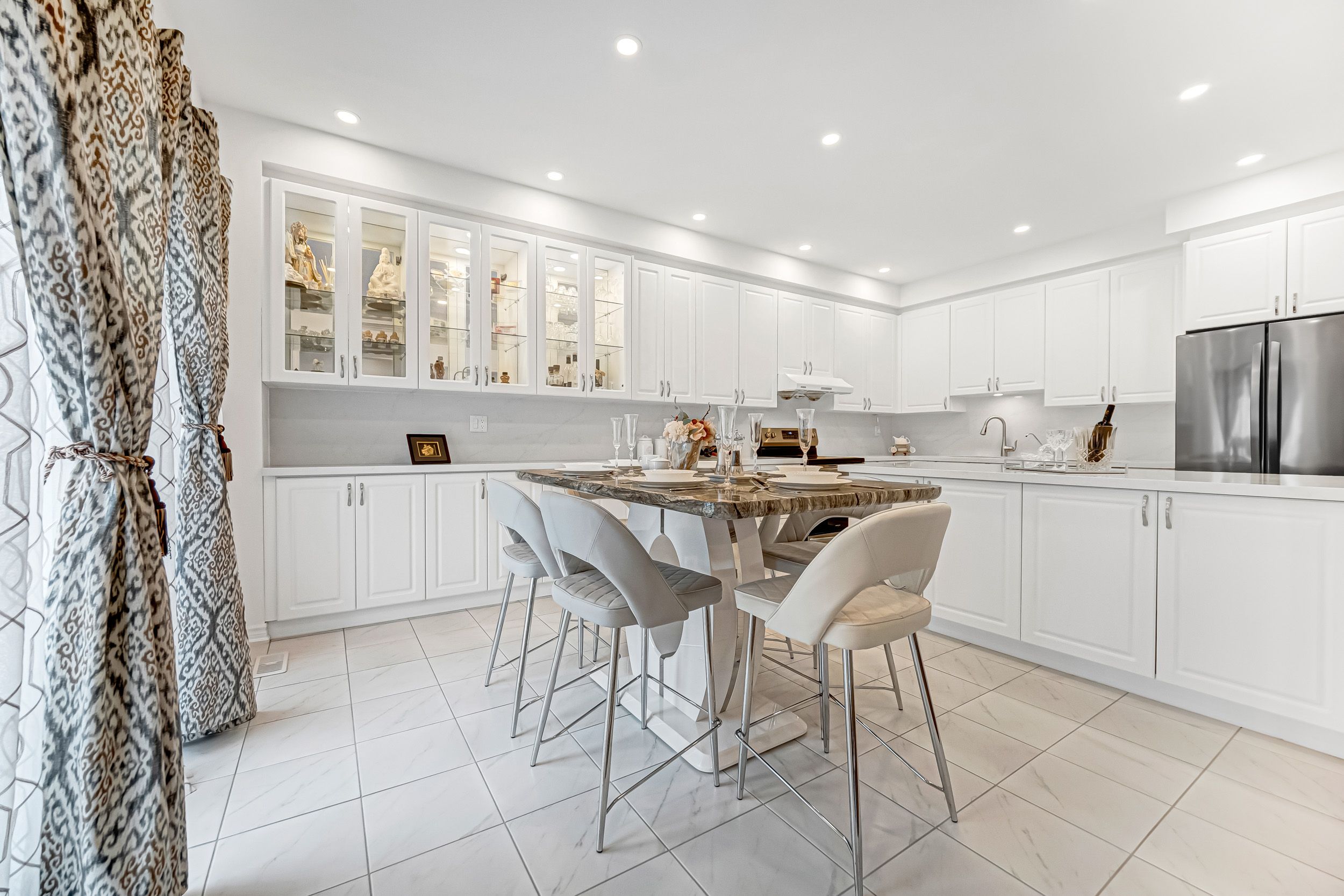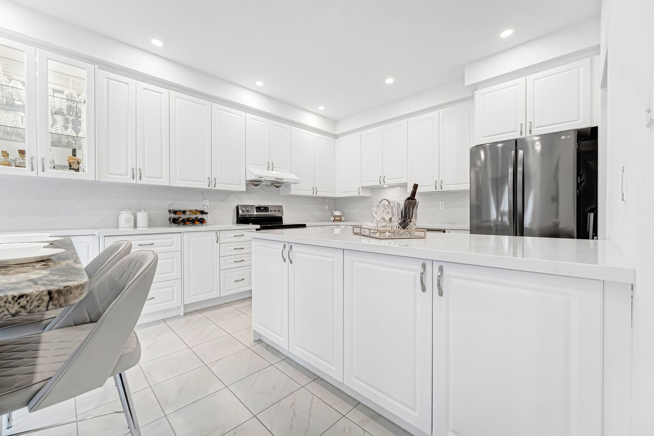 • Custom kitchen with marble countertops and built-in lighting.