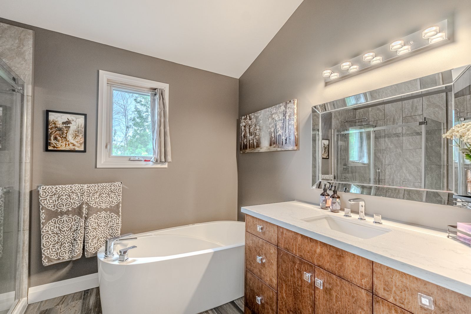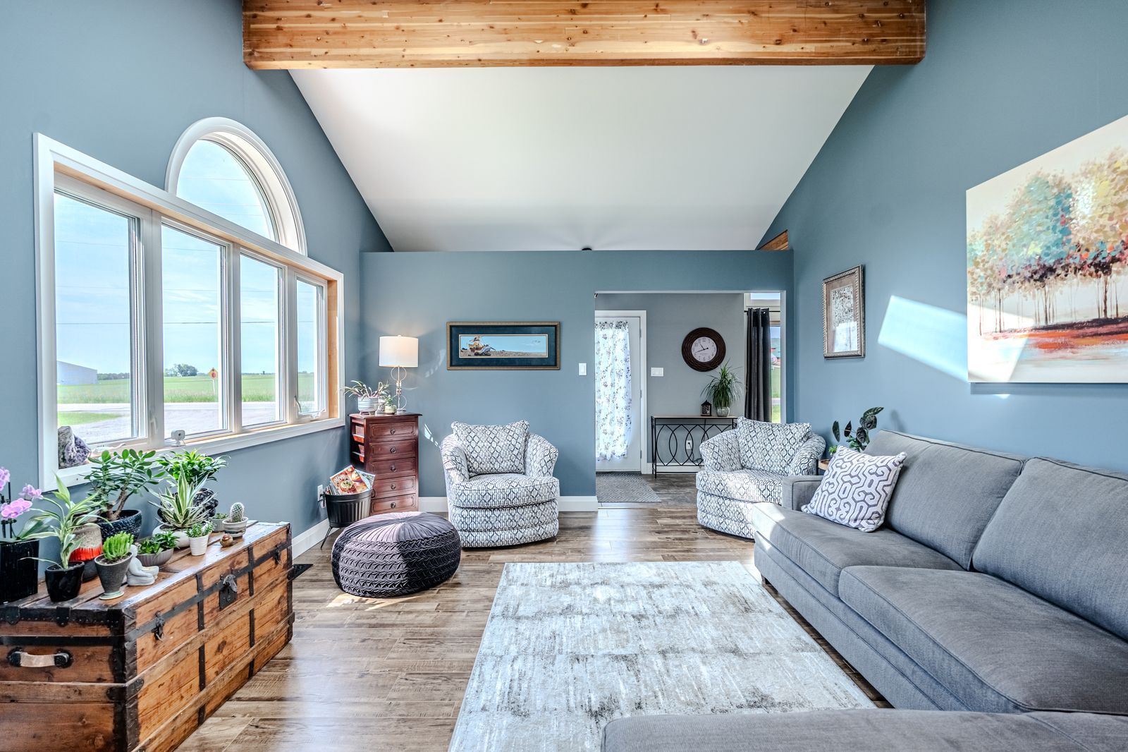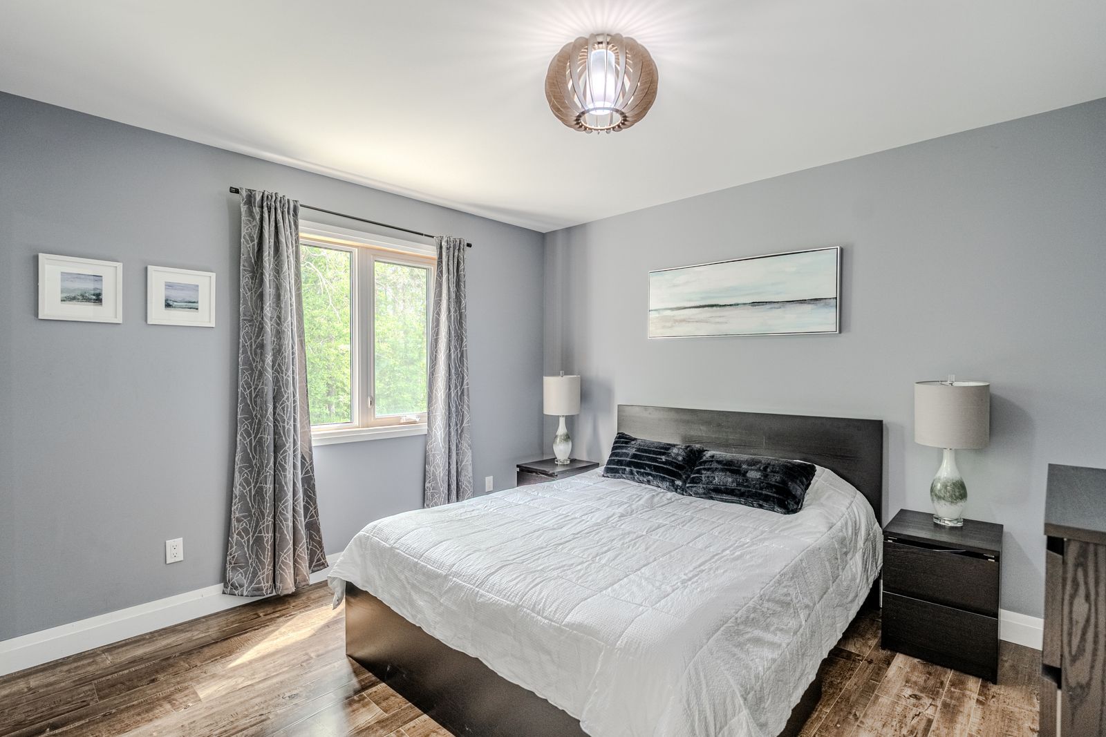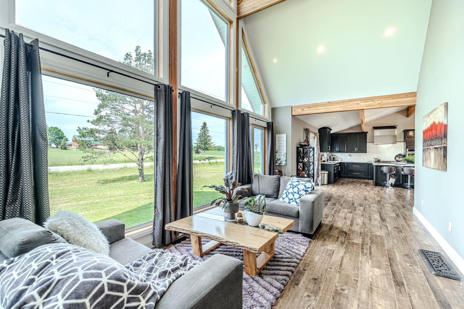 Bold architecture, luxury upgrades, a heated 3-bay shop, & separate 200 amp service to both the house & the shop on over half an acre of country living! Step into this 2019 linwood home offering over 3,300 sq ft of finished living space on a beautifully landscaped half-acre lot, just minutes from downtown elmvale. Enjoy an unmatched lifestyle close to wasaga beach, the elmvale jungle zoo, tiny marsh, parks, schools, a library, an arena, and beloved community events like the maple syrup festival and fall fair. This property is designed to impress, with a striking a-frame roofline, oversized triple-pane windows, double-door entry, manicured gardens, a stone patio, gazebo, and full landscape lighting with built-in irrigation. The heated and insulated detached shop with 3 garage doors, a commercial-grade liftmaster opener, and dedicated 200 amp service is a dream for hobbyists and professionals alike. Inside, vaulted ceilings with exposed douglas fir beams, floor-to-ceiling windows, skylights, and designer led lighting create an unforgettable interior. The modern kitchen boasts quartz counters, dark shaker cabinets, tile backsplash, an under-mount sink, island seating, and premium jennair appliances, opening to a stylish dining space with wide patio doors, and a breathtaking living room. A skylit family room and two main floor bedrooms served by a 4-piece bath elevate everyday comfort, while a custom maple staircase with an engineered steel mono stringer leads to a loft-style primary suite with a custom walk-in closet and an ensuite with an air jet tub and imported italian glass shower. The partially finished basement adds a rec room, bedroom, full bath, and a utility room with a tankless water heater, softener, uv system, and 4-filter water treatment. With a generac and blown-in insulation for added efficiency, every detail is thoughtfully crafted to create an extraordinary lifestyle, and a truly rare opportunity to live and entertain in style!