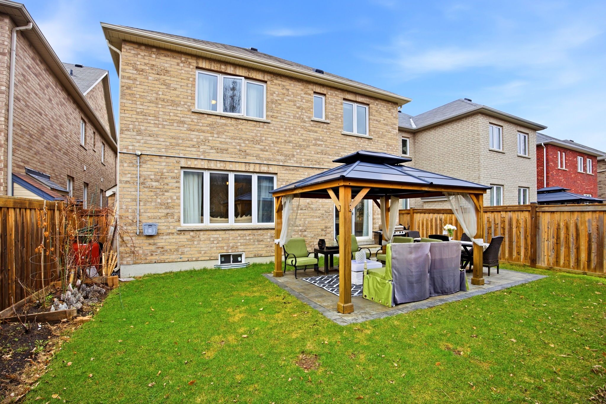 • Meticulously landscaped backyard oasis with a patio and gazebo.