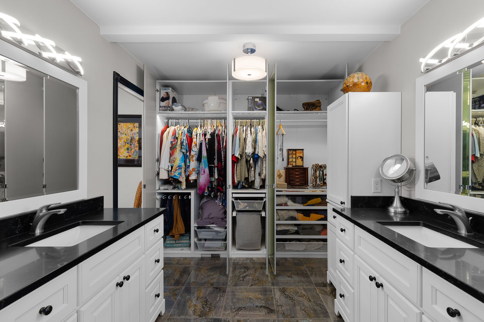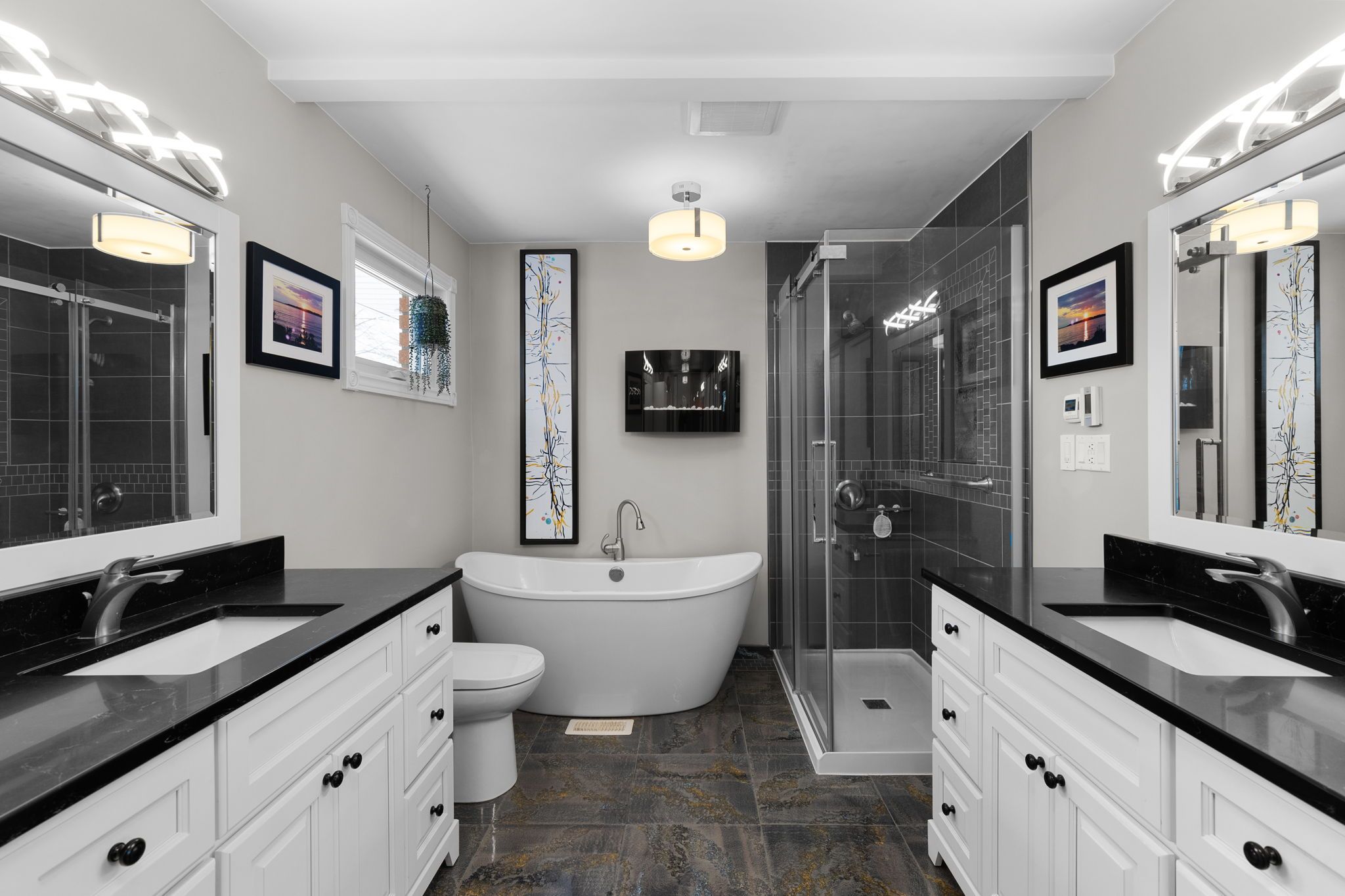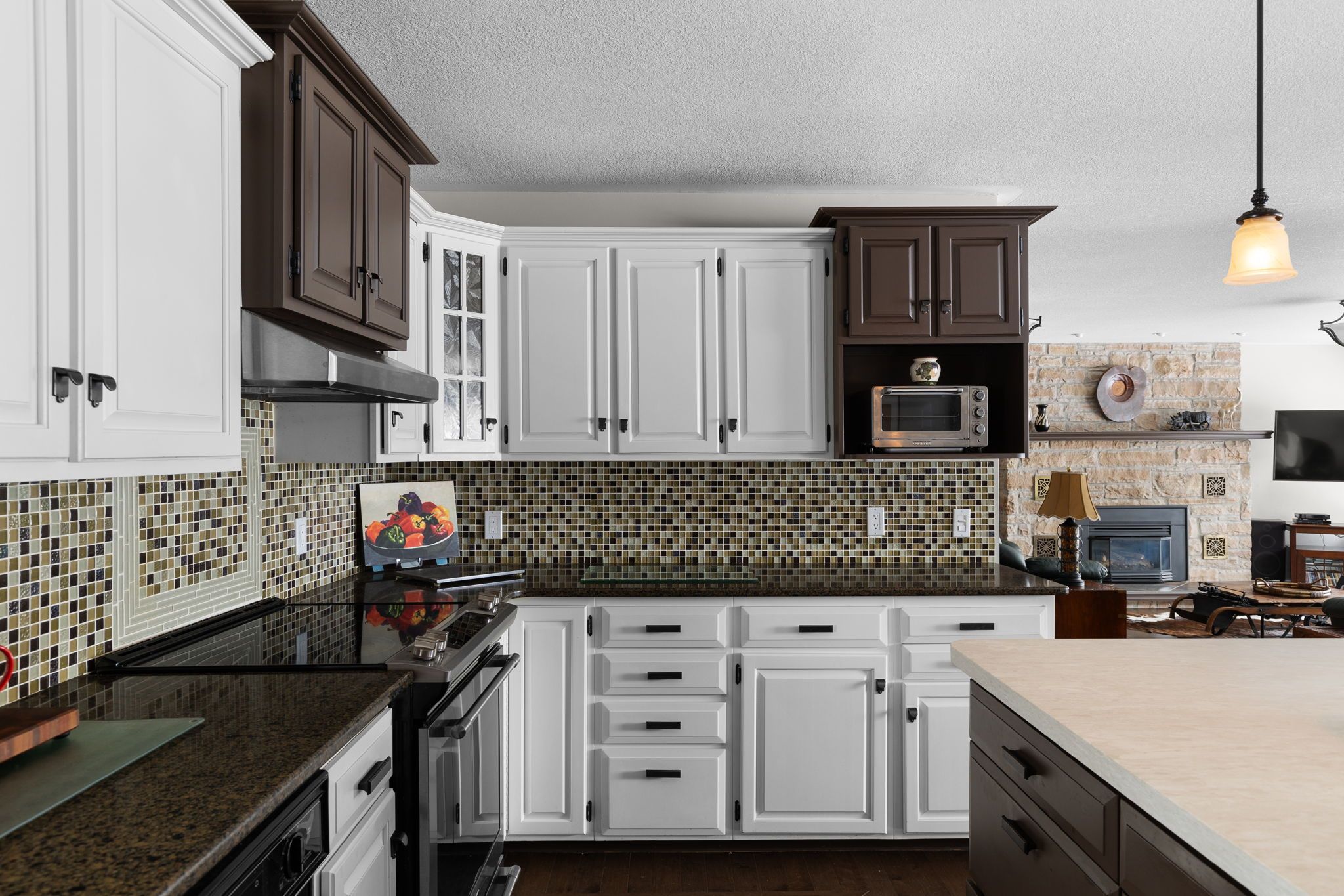 • Quartz kitchen with custom island and heated tile floors for comfort.