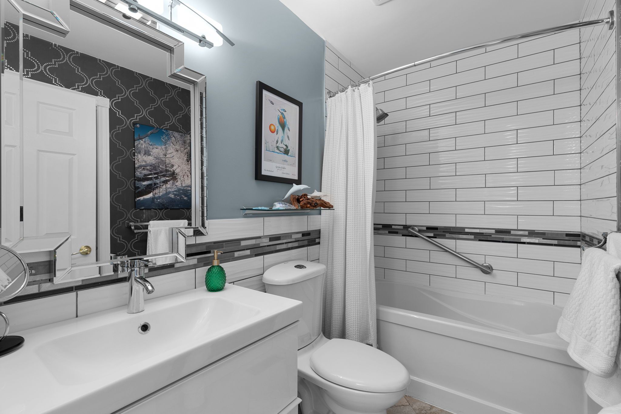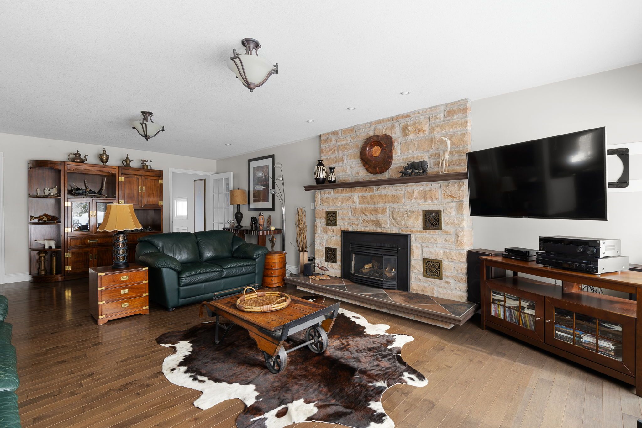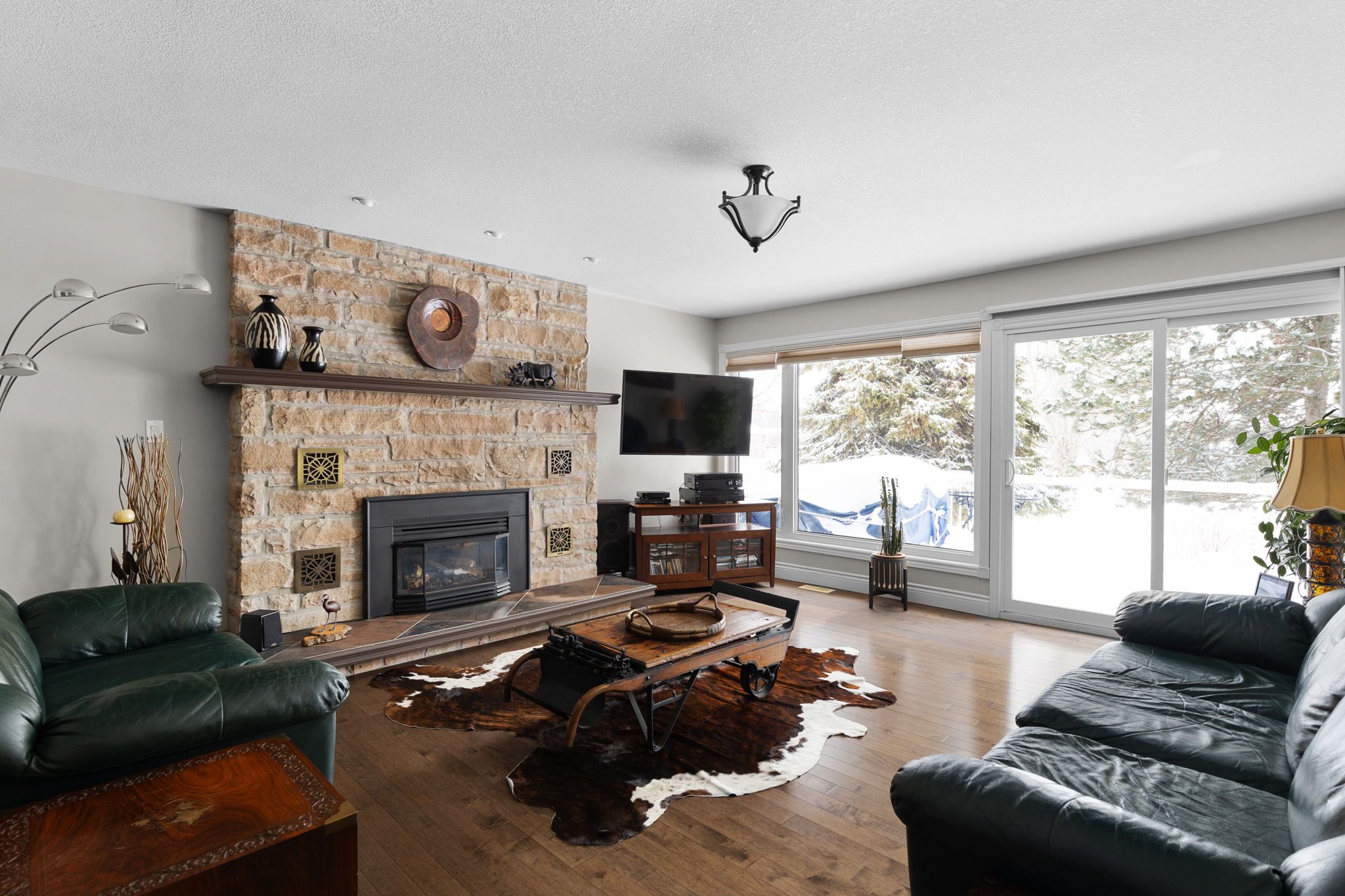 • Quartz kitchen with custom island and heated tile floors for comfort.