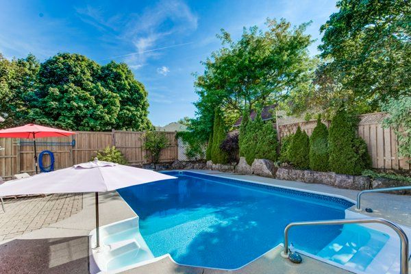 • Private backyard oasis featuring an in-ground pool and covered deck for lounging.