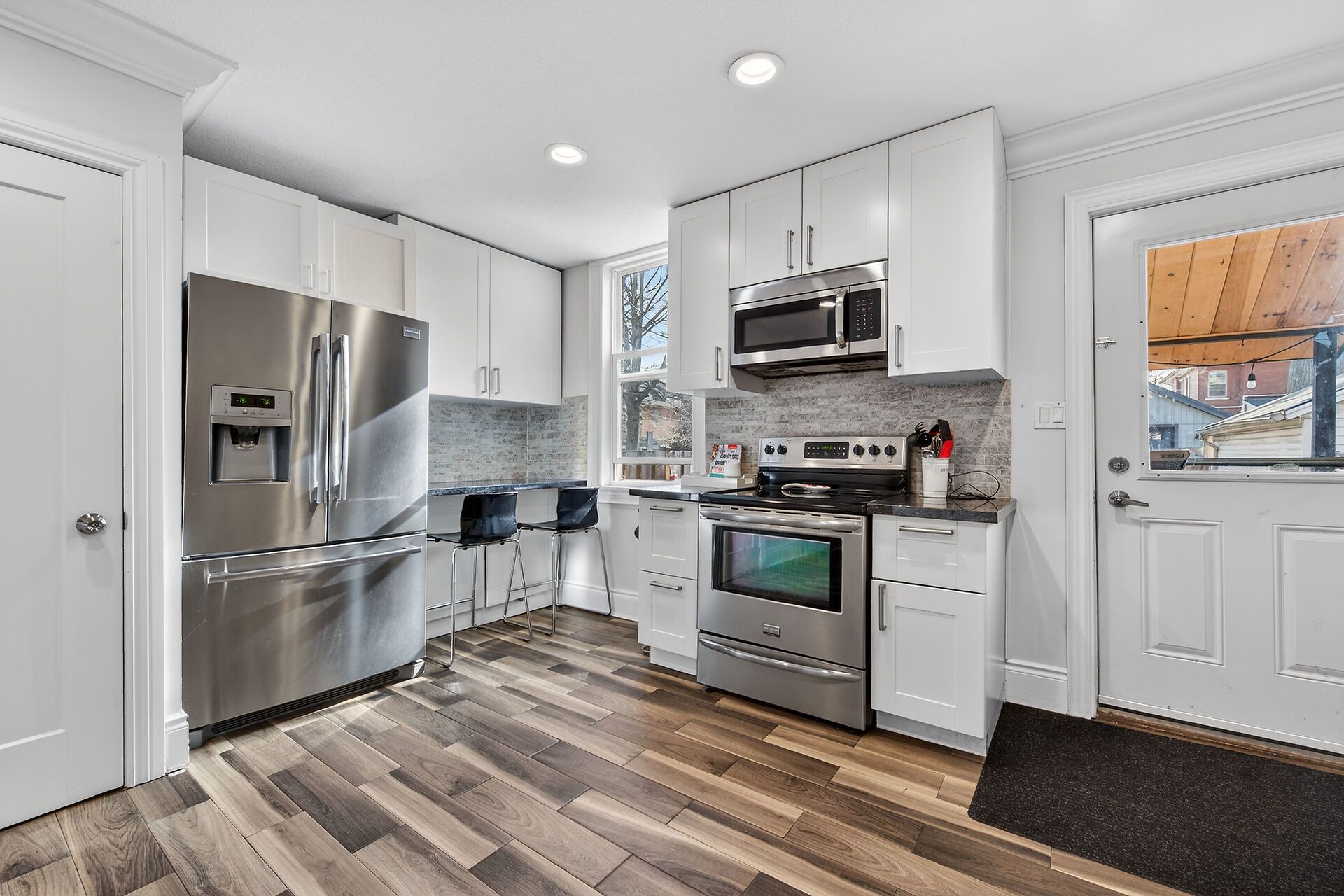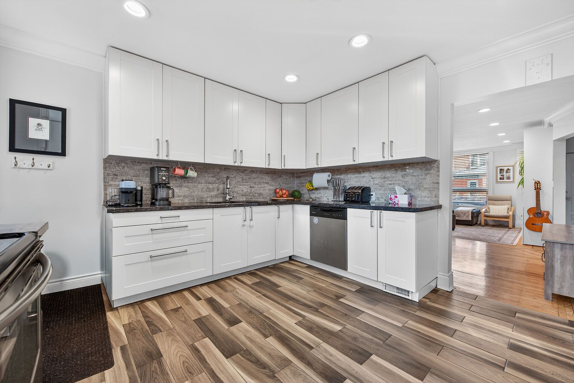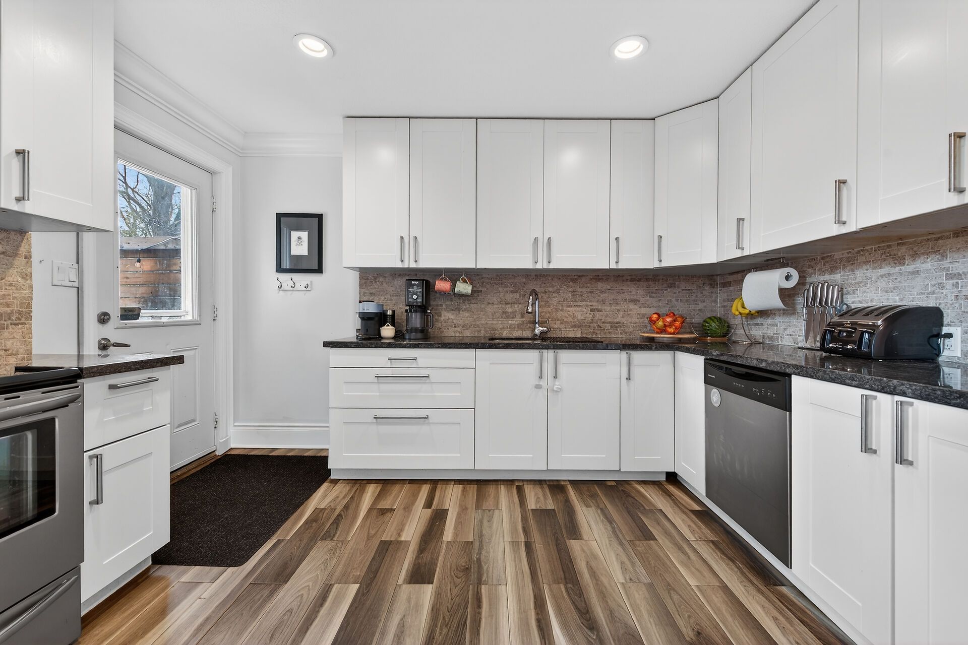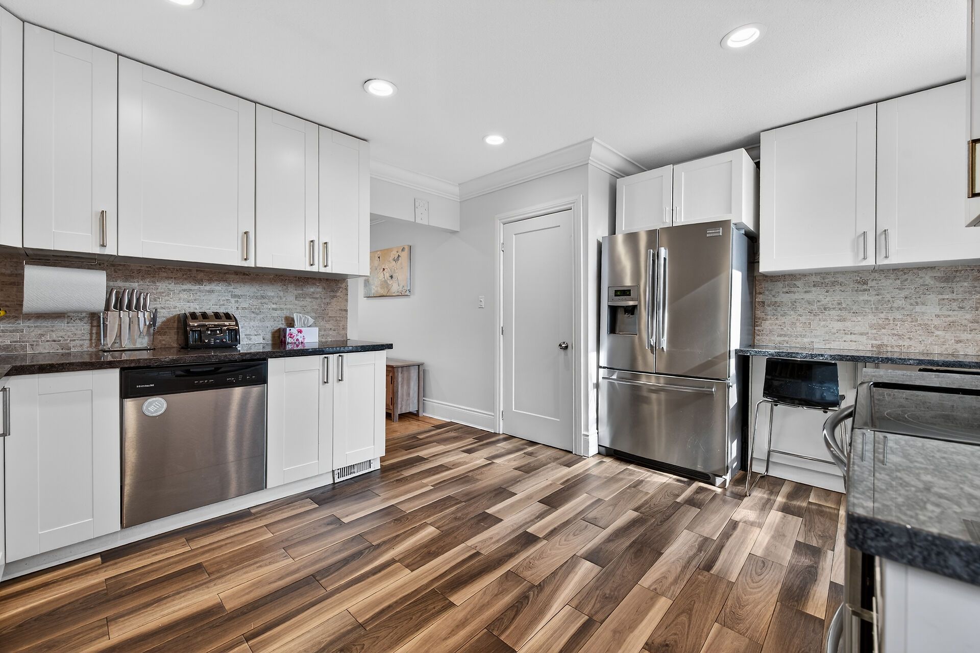 • Modern kitchen with plenty of cupboard space and granite counters.