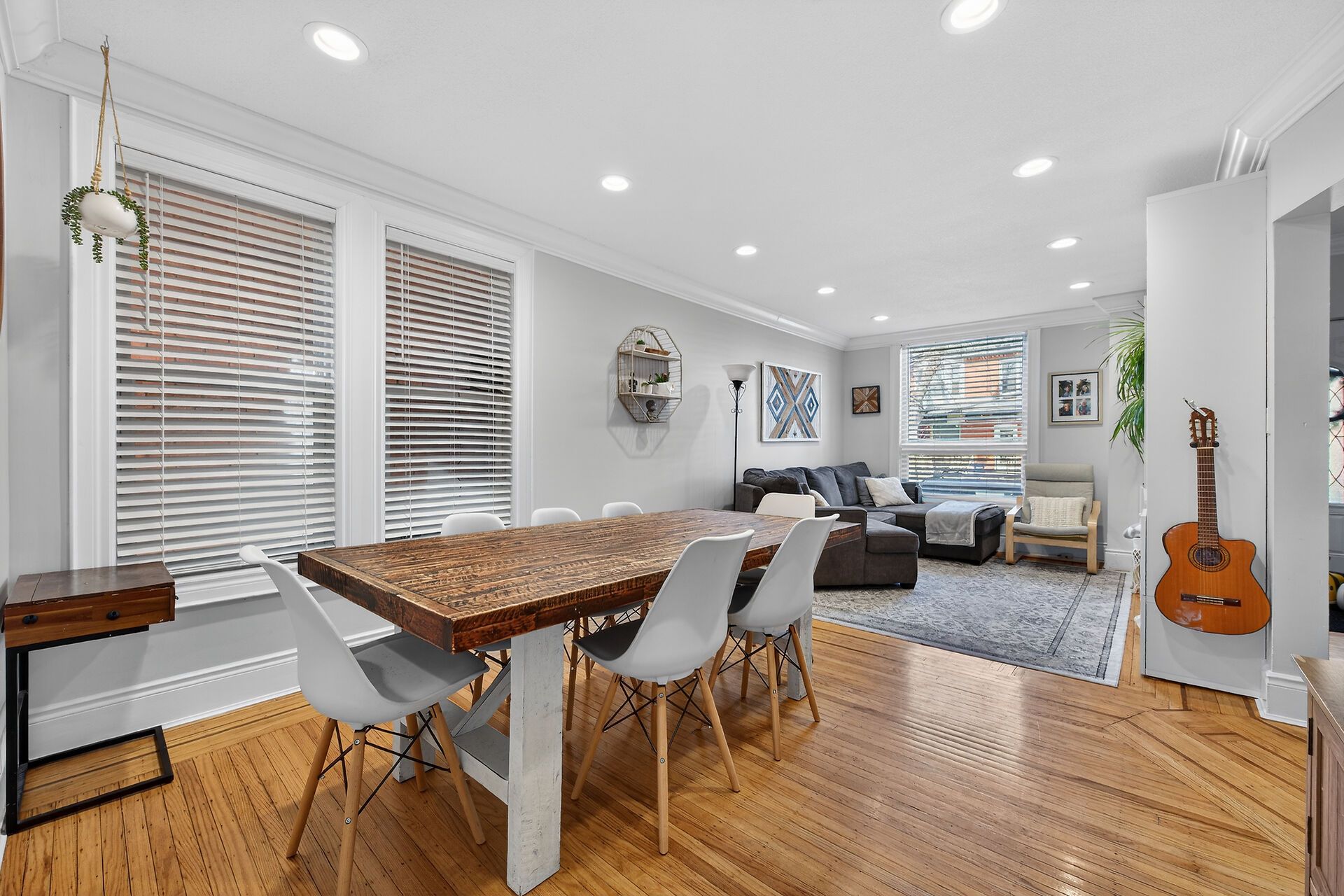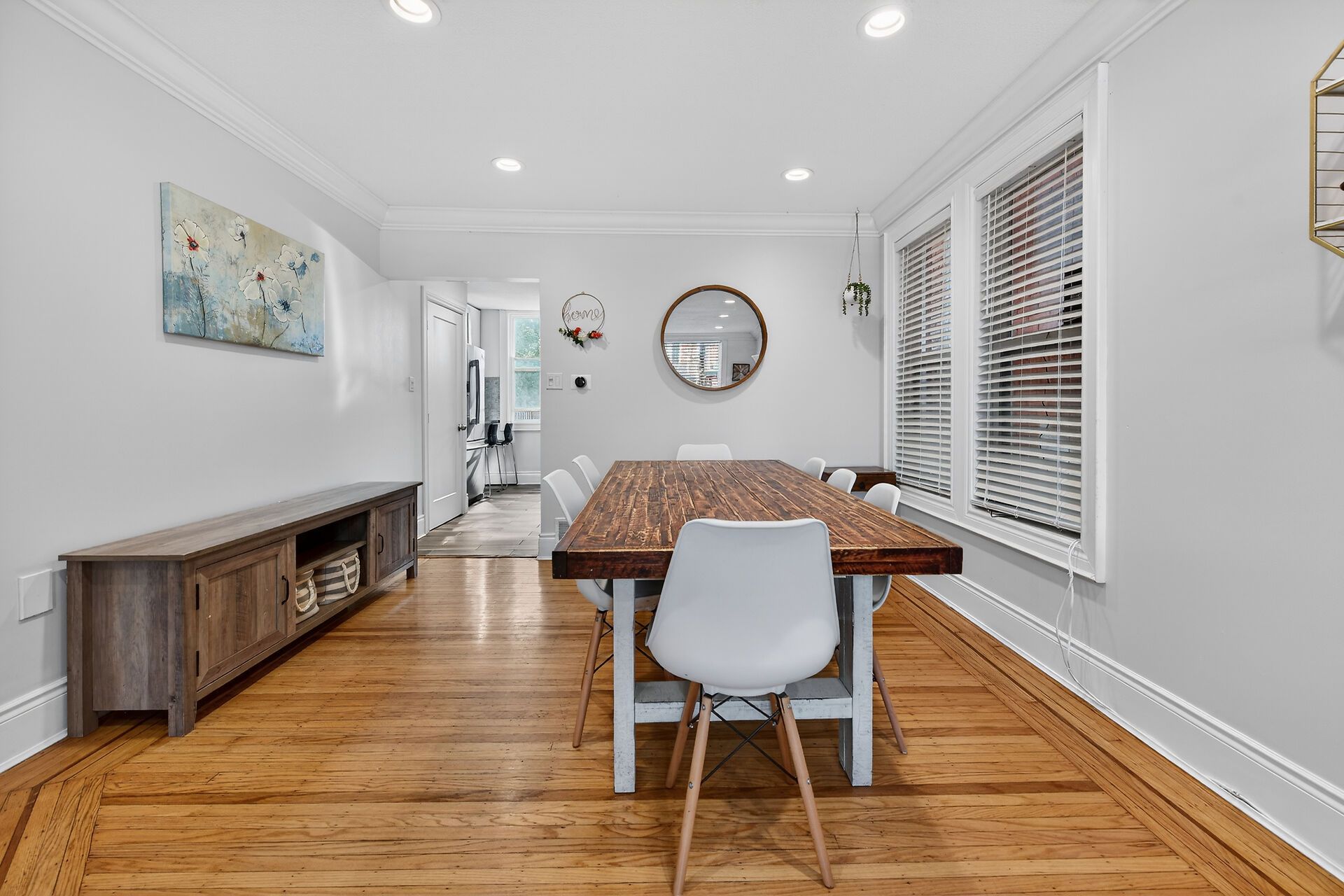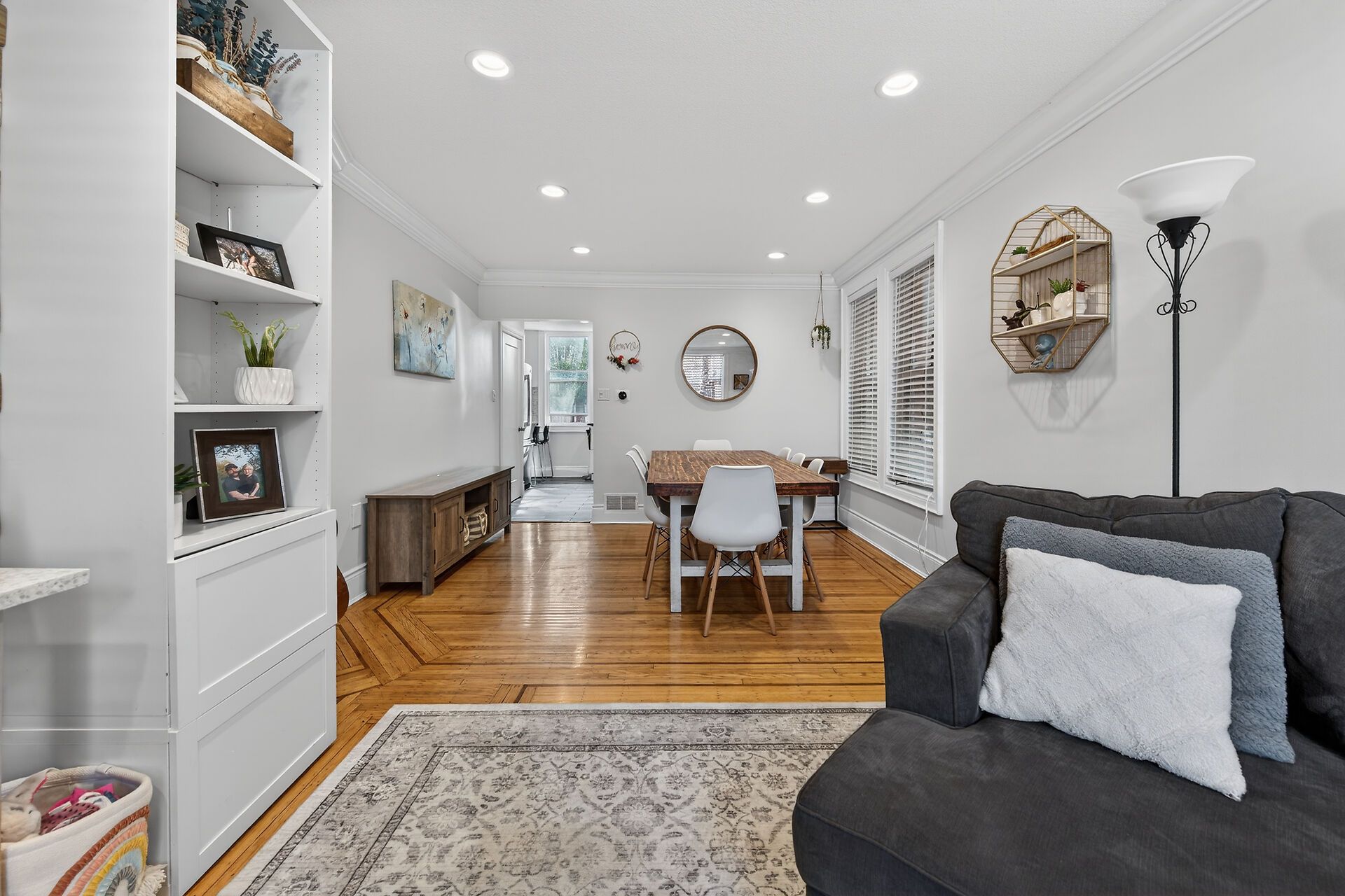 • Spacious dining room flows into a bright living area with built-ins.