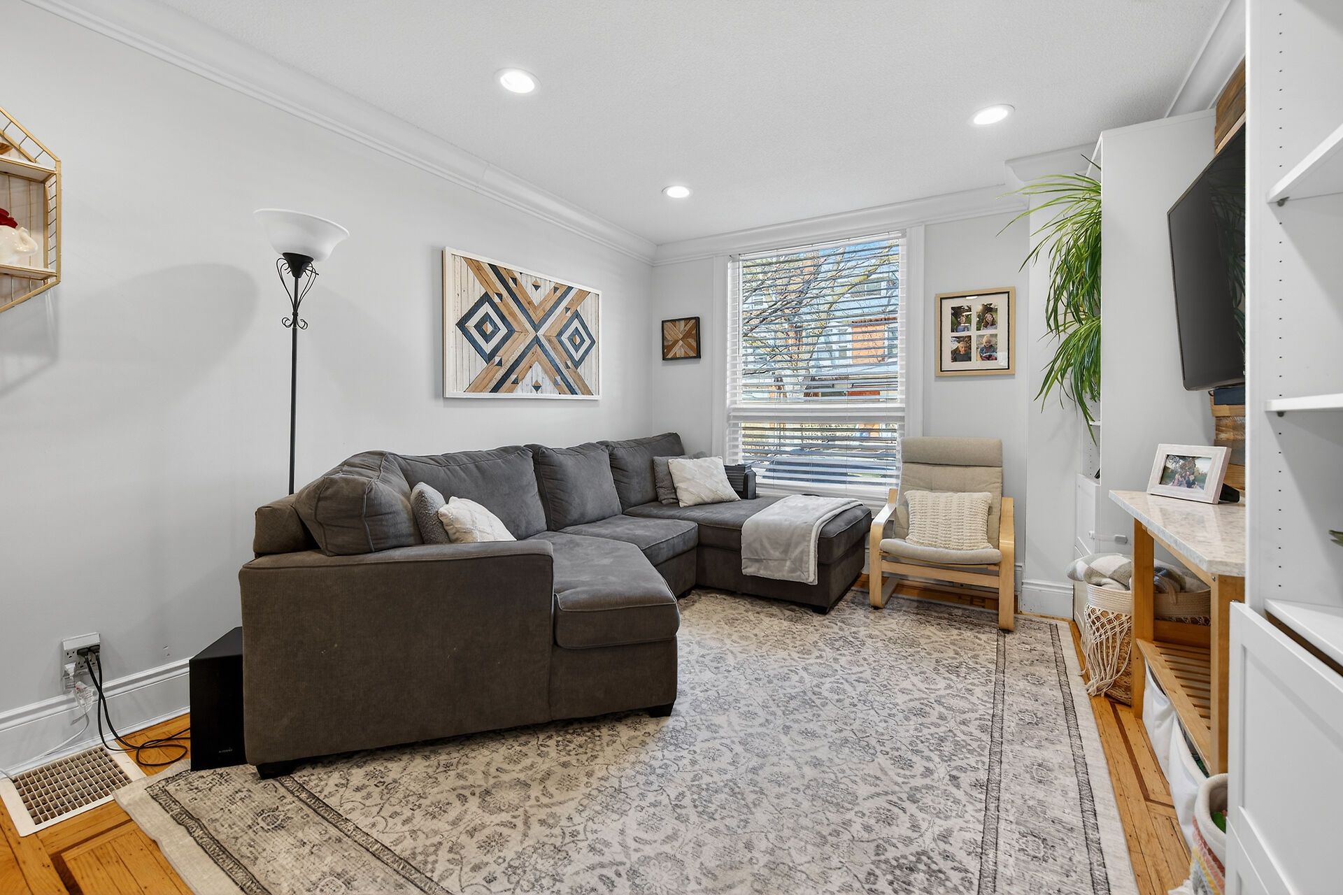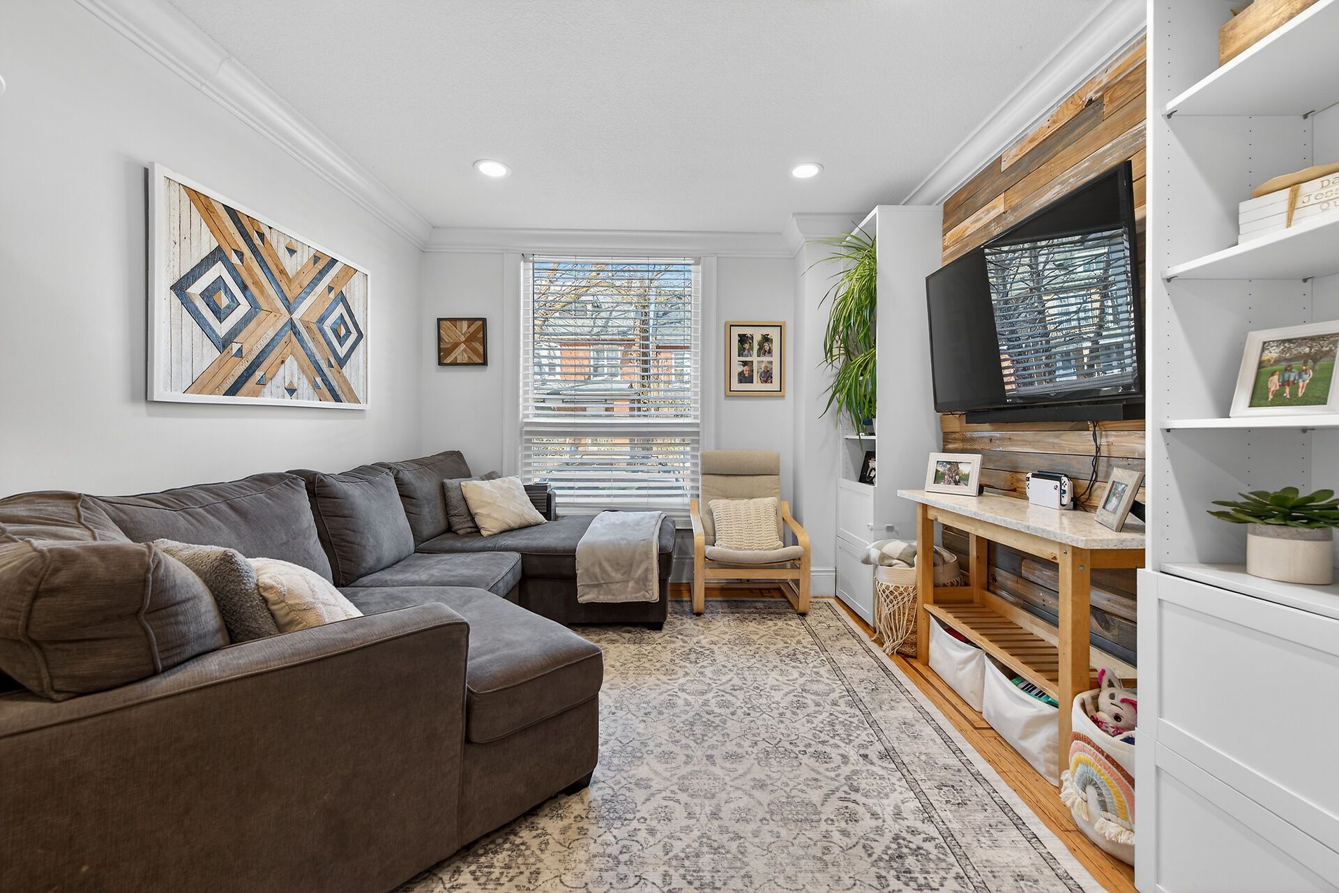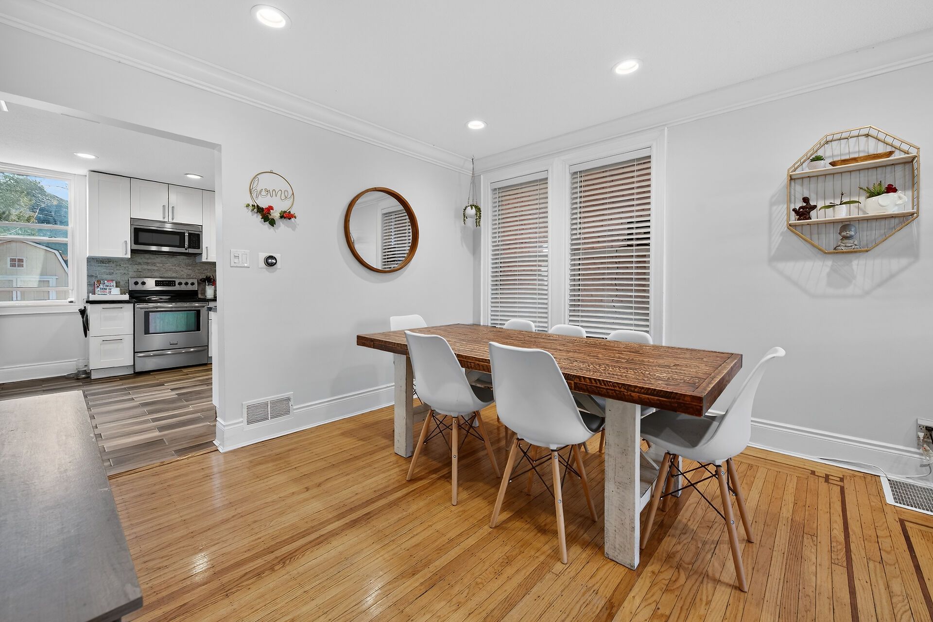• Spacious dining room flows into a bright living area with built-ins.