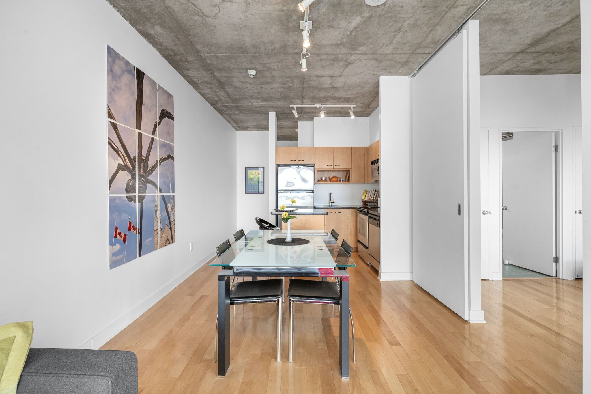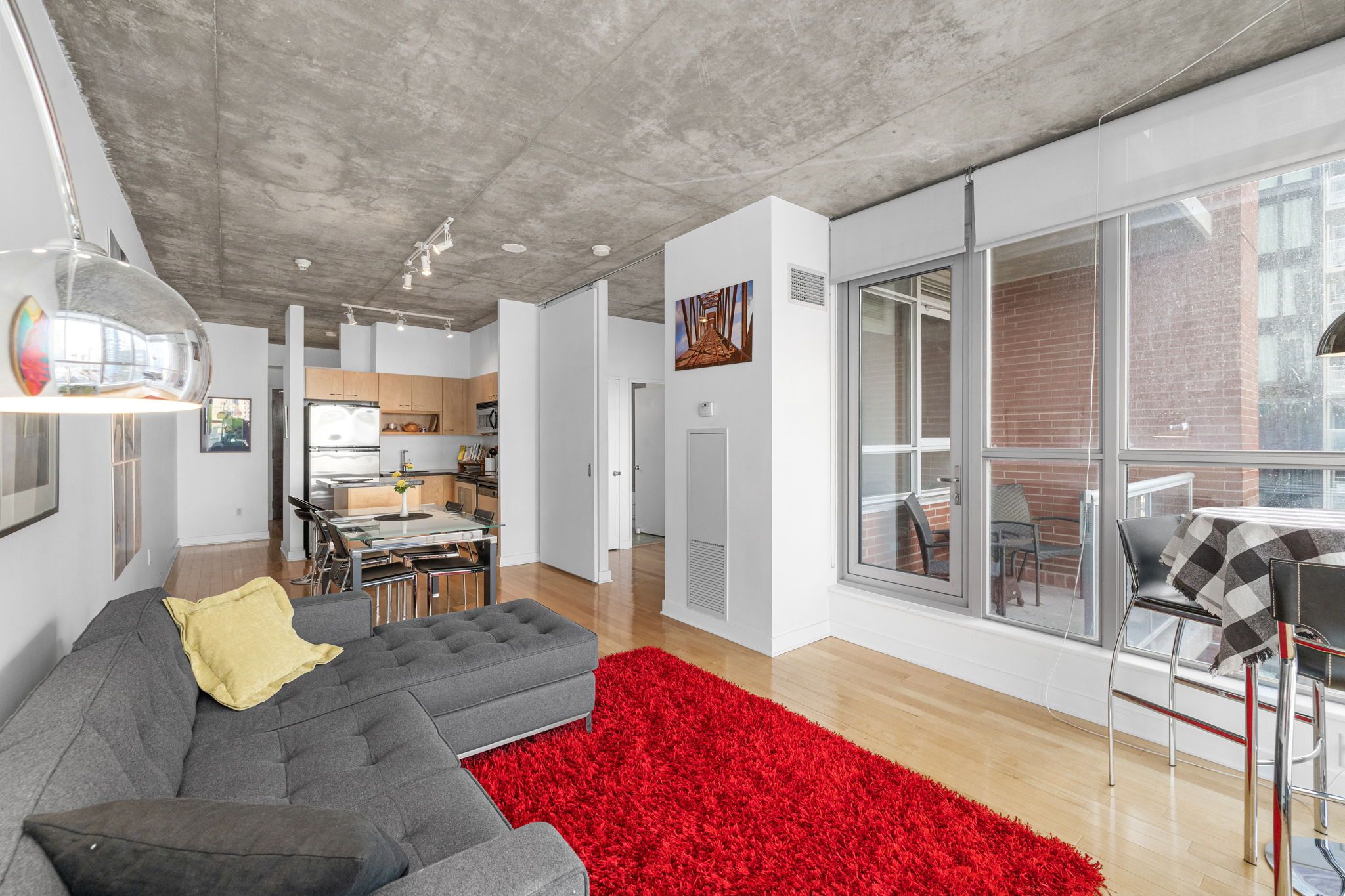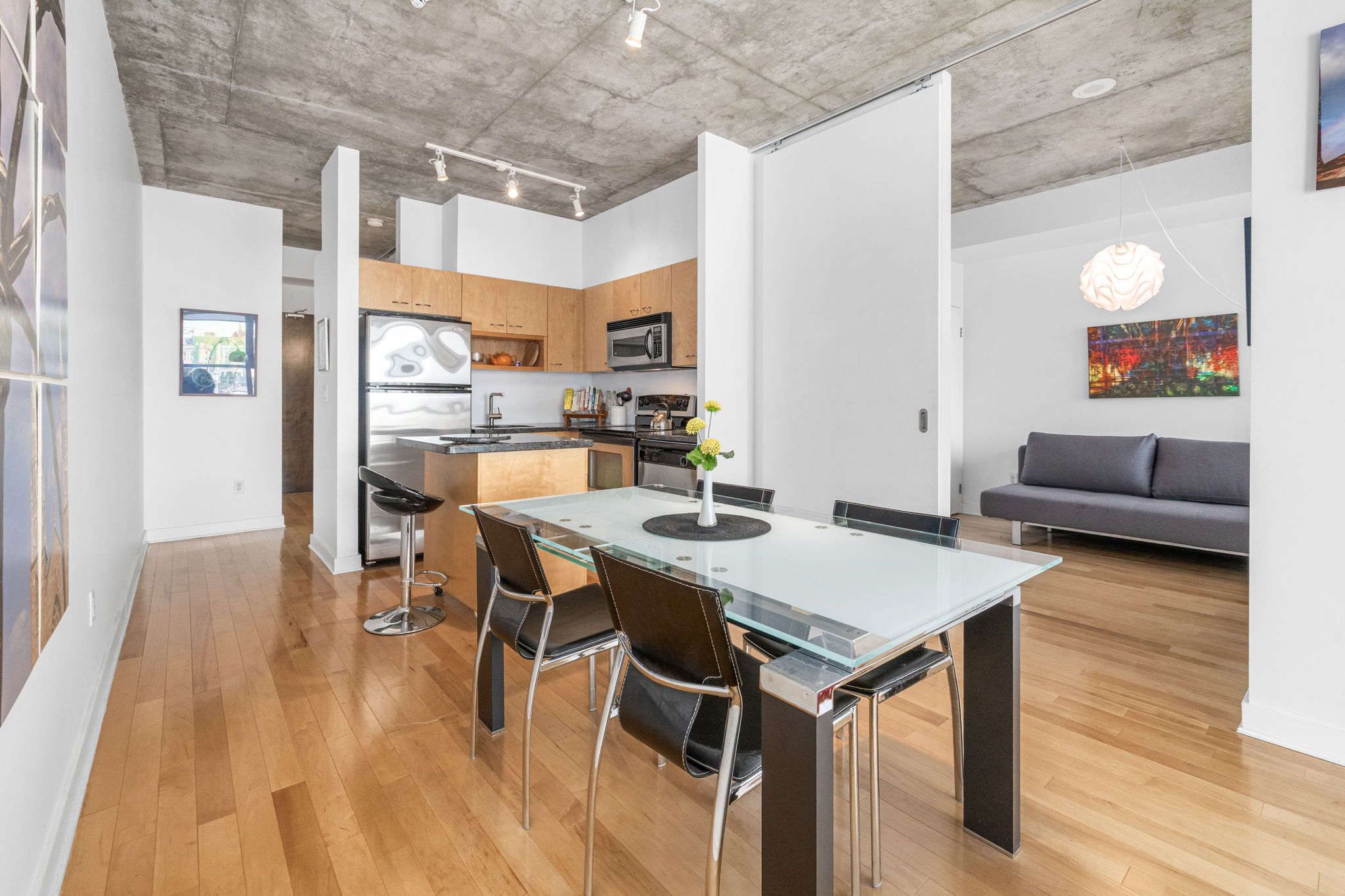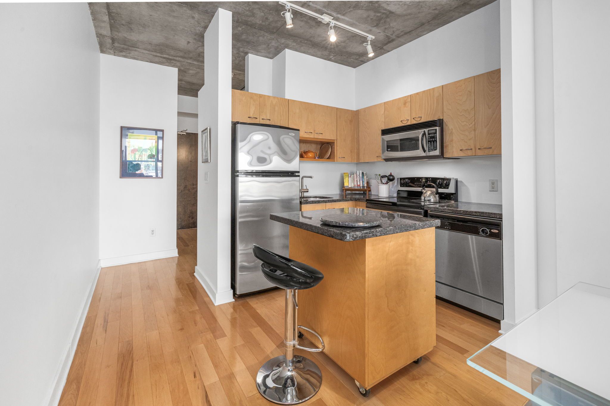 • Open concept layout with high ceilings and hardwood floors.