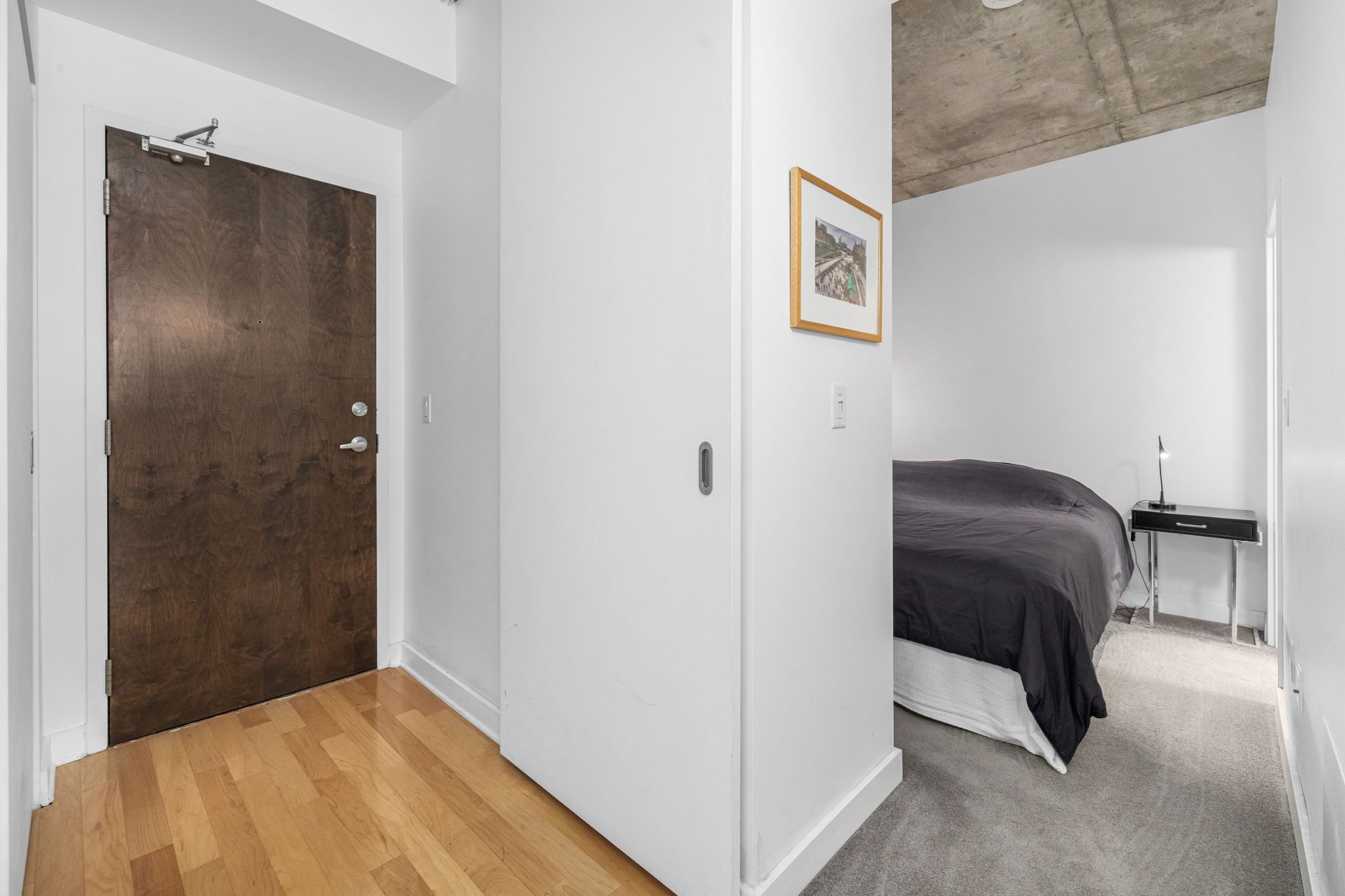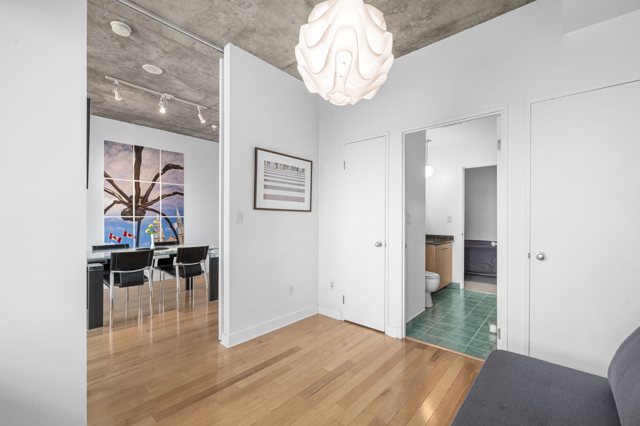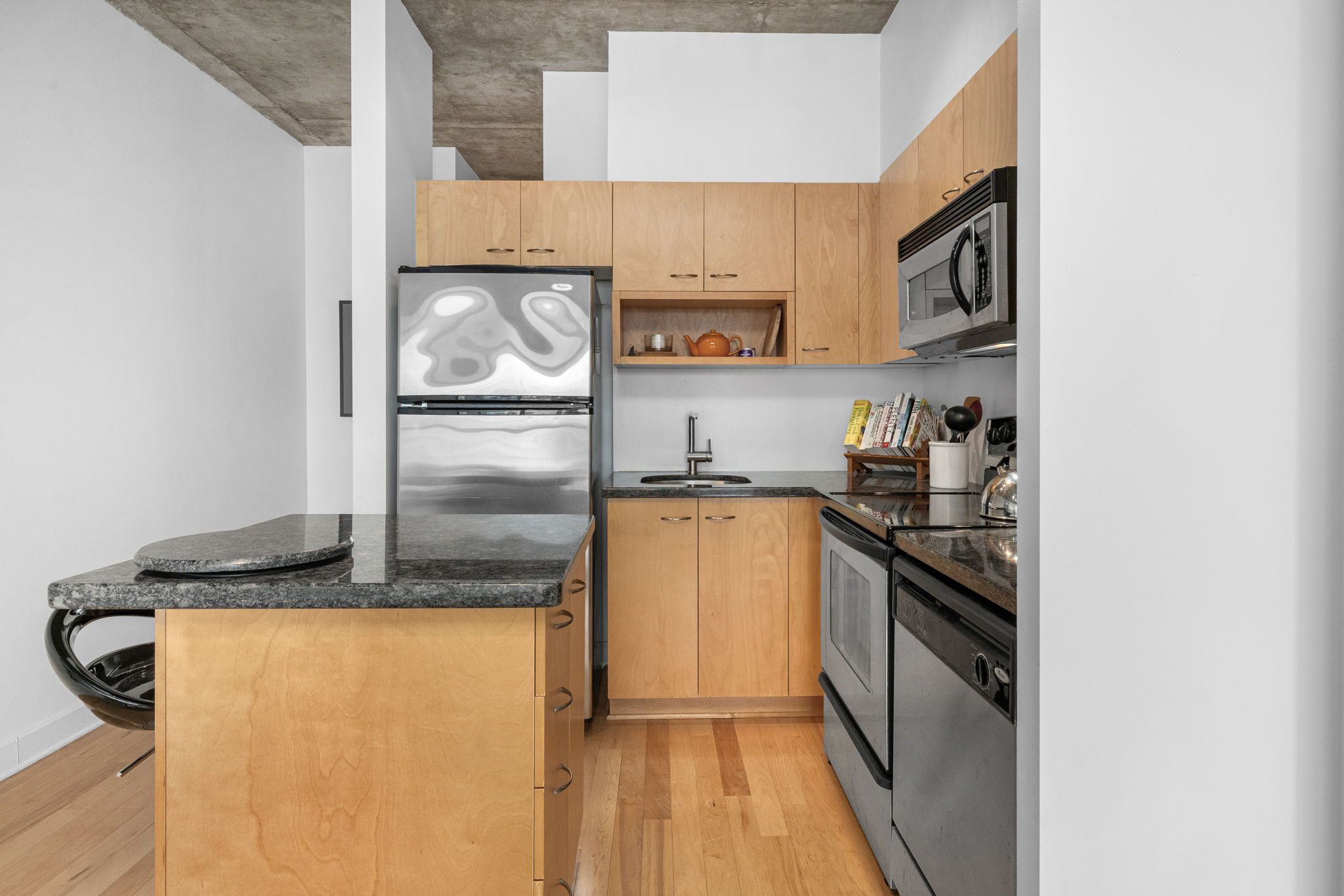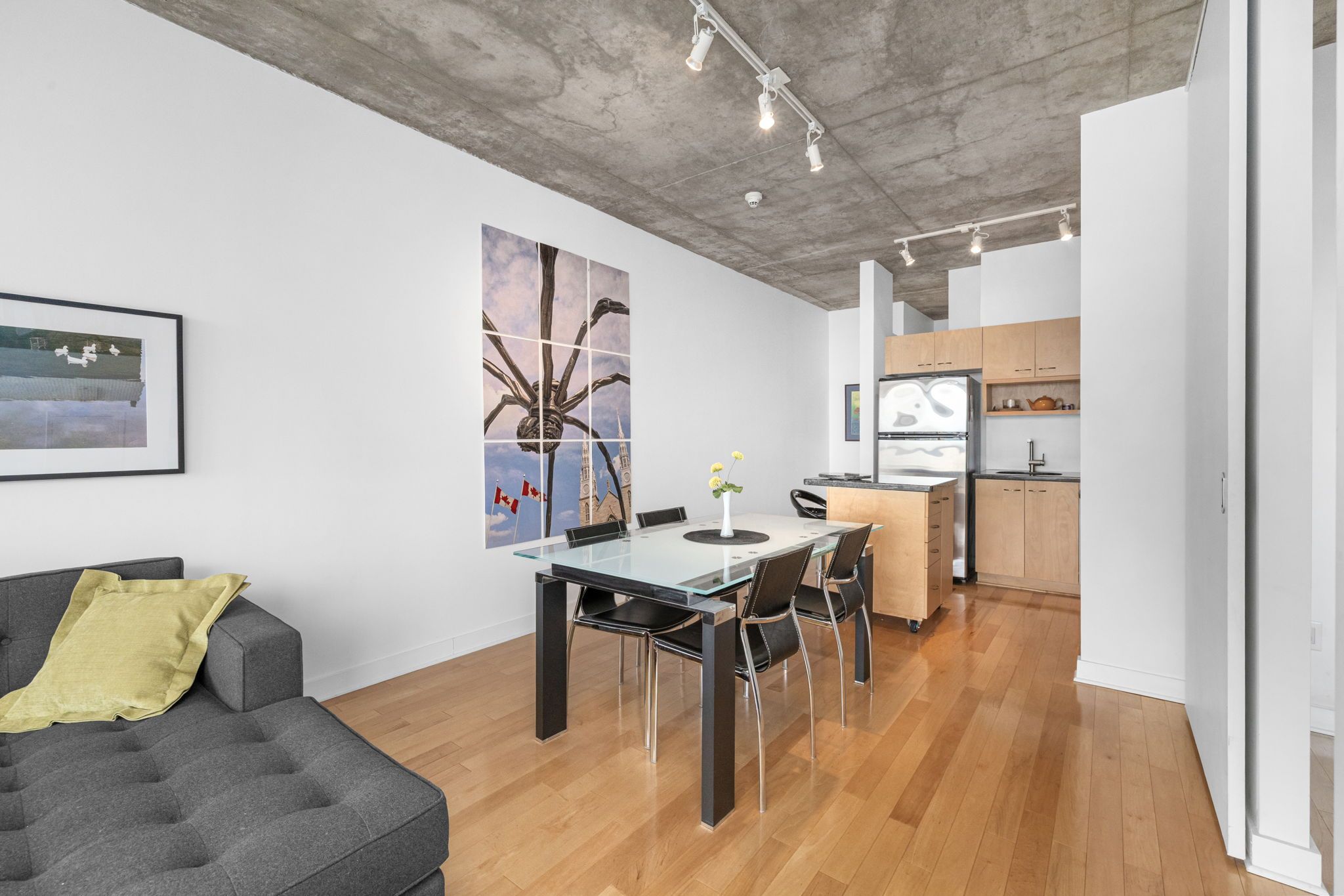 • Open concept layout with high ceilings and hardwood floors.