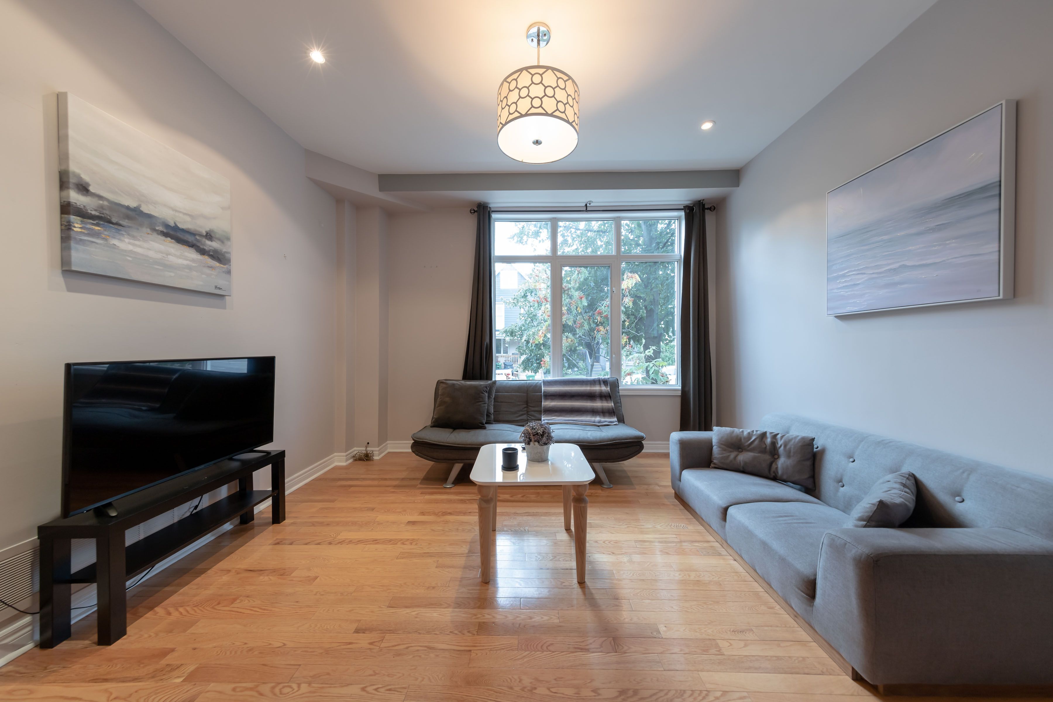 • Bright open-concept living area with large windows overlooking the yard.