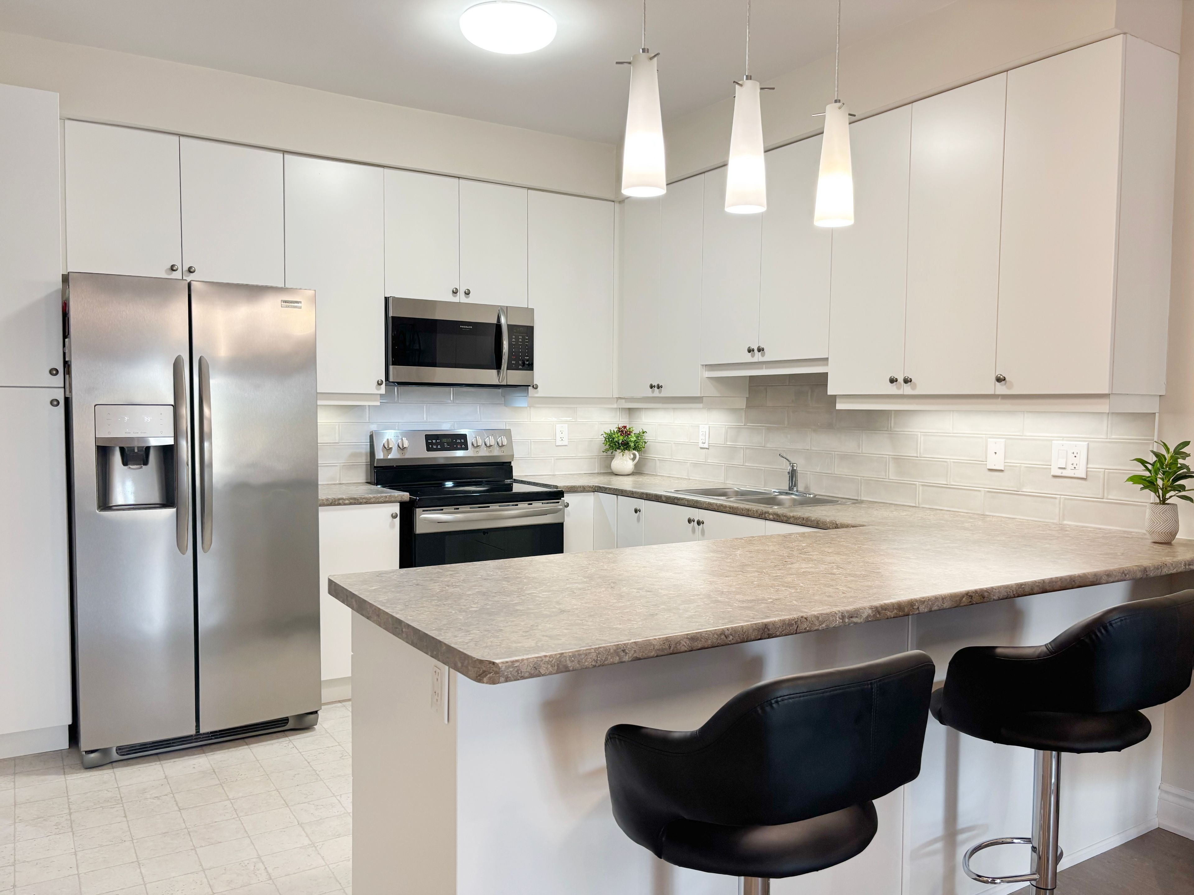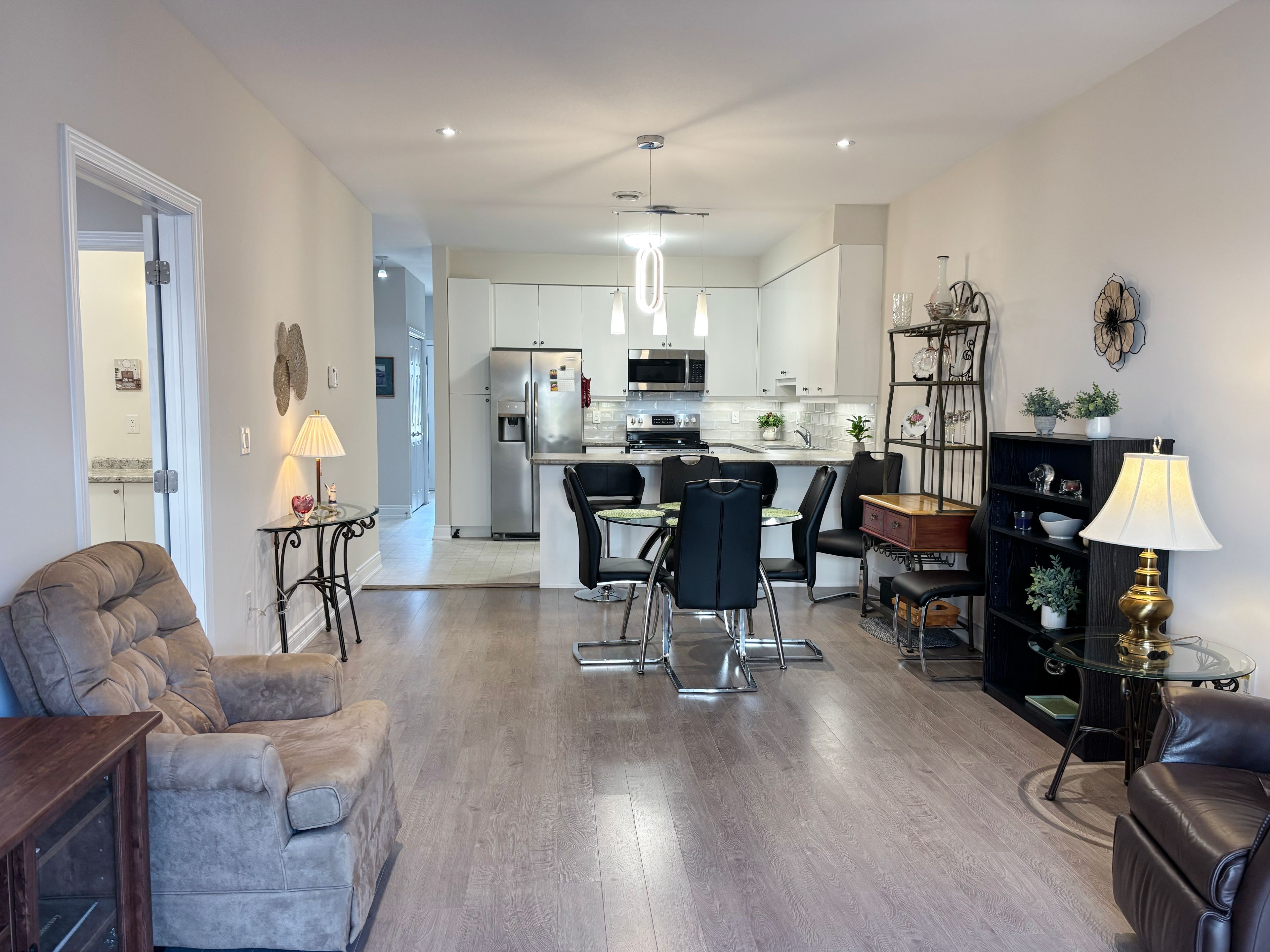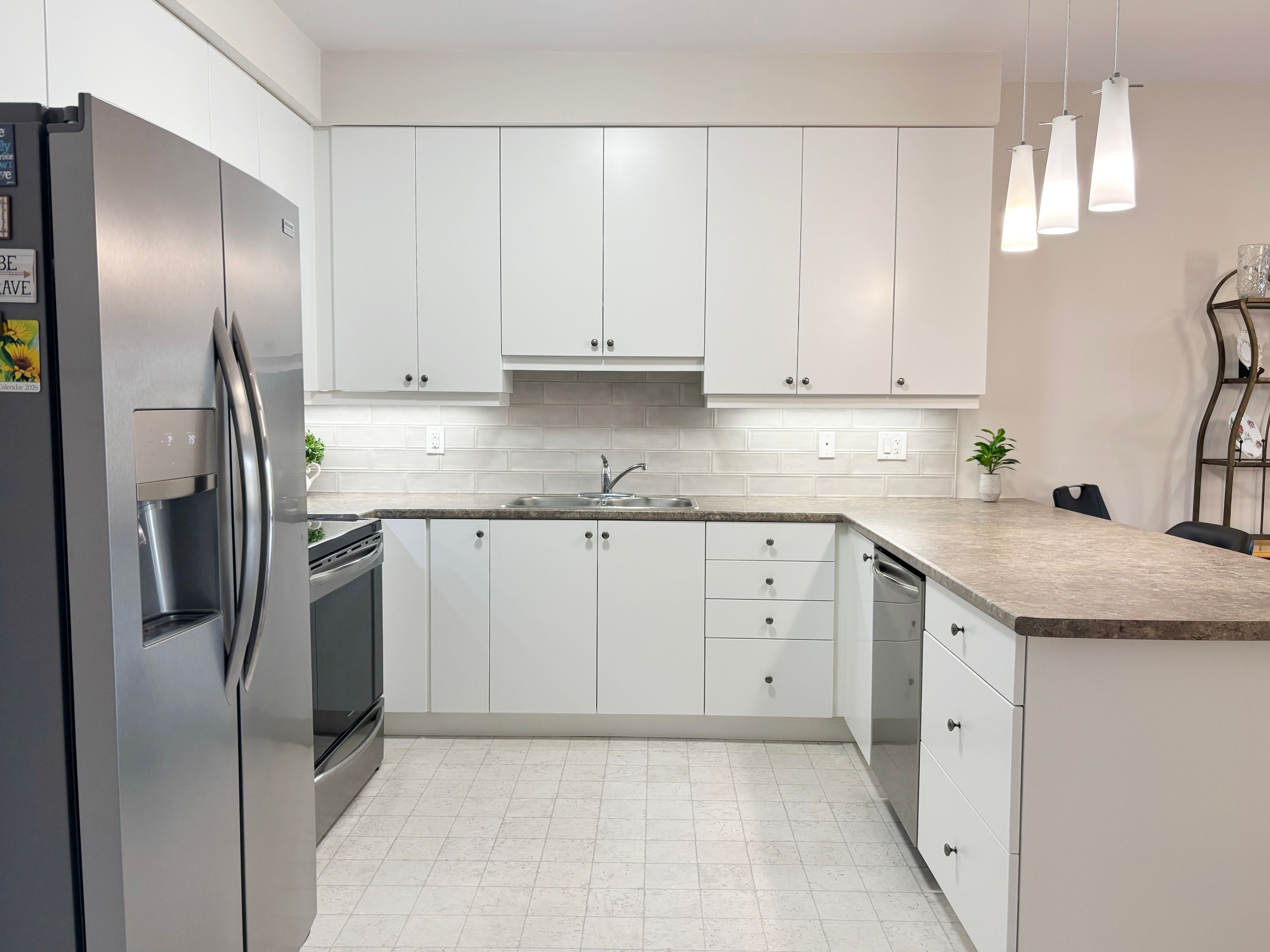 If you've been thinking about simplifying your space without giving anything up, this one might surprise you. Set in north lake village in orillia, this bungalow freehold townhome offers the kind of layout that just makes everyday living easier-everything on one level, no stairs to think about, and a floor plan that actually feels spacious. An open concept design and 9-foot ceilings, pot lighting, really opens things up, giving the whole home a bright, easygoing feel. The kitchen sits right at the heart of it, laid out in a practical u-shape with a generous breakfast bar, tiled backsplash, under-mount lighting, and an upgraded fridge with water and ice-perfect for both quiet mornings and casual get-togethers. There's also a pantry for added storage, something you'll appreciate more than you expect. Built on a slab, it's a great option for anyone looking to avoid stairs, and while not fully accessible, the 36-inch interior doors offer added flexibility for mobility. The primary bedroom is genuinely roomy, with a walk-in closet and a comfortable 3-piece ensuite, and a second 4-piece bath is conveniently located near the guest bedroom-ideal for visitors or everyday use. There's even a murphy bed ready for guests when they visit. Storage is practical throughout, including a spacious laundry room with a large linen closet-so everything has its place without feeling cramped. Out back through the patio doors the composite deck, bbq gas line & fully fenced yard give you just enough outdoor space to enjoy-without the usual upkeep. No grass means no lawn maintenance, so you can spend more time relaxing and less time working. Add in inside entry from the garage, a paved driveway, and it all comes together in a way that simply works. For first-time buyers or anyone tired of apartment living, this is a chance to have your own space, your own yard, and the ease of single-level living-all in a quiet, established community.