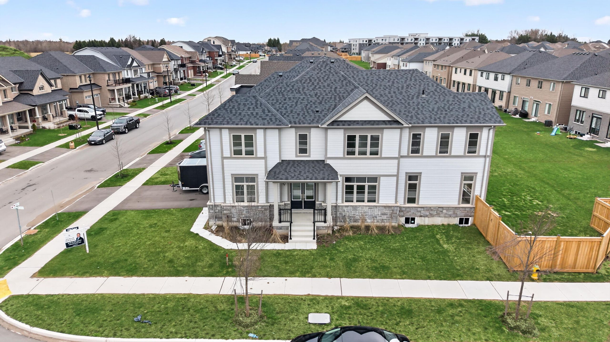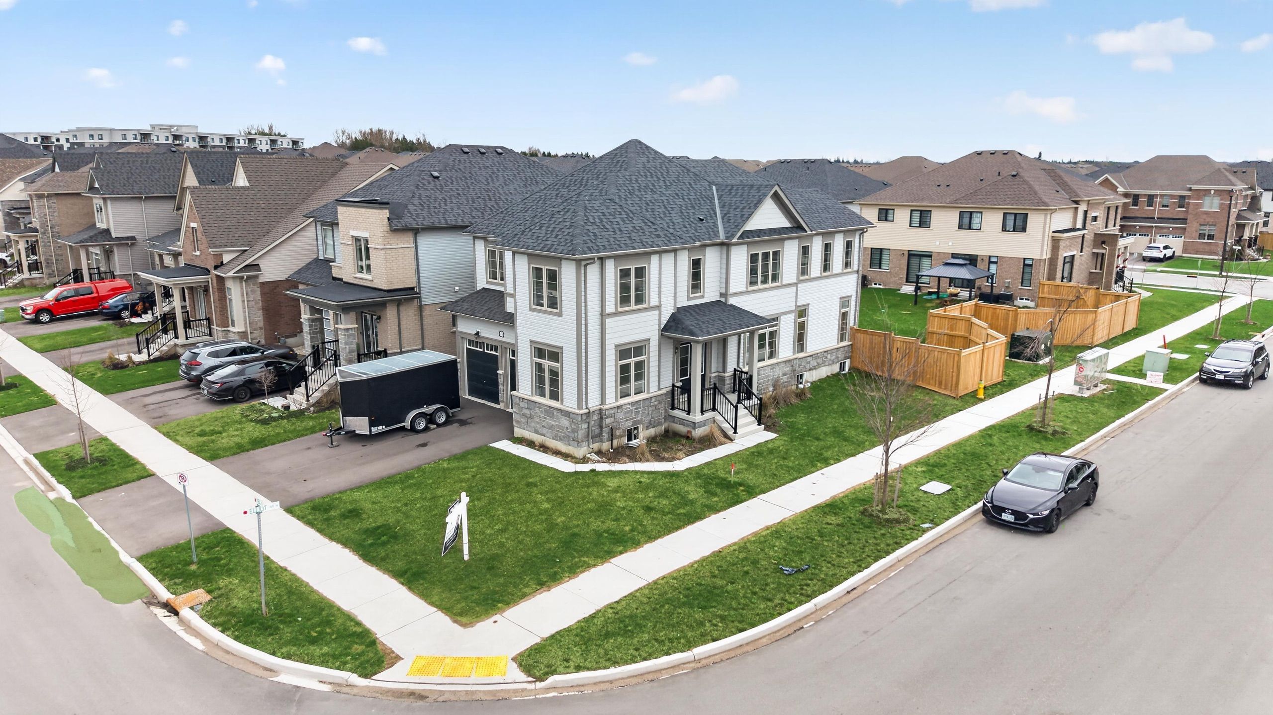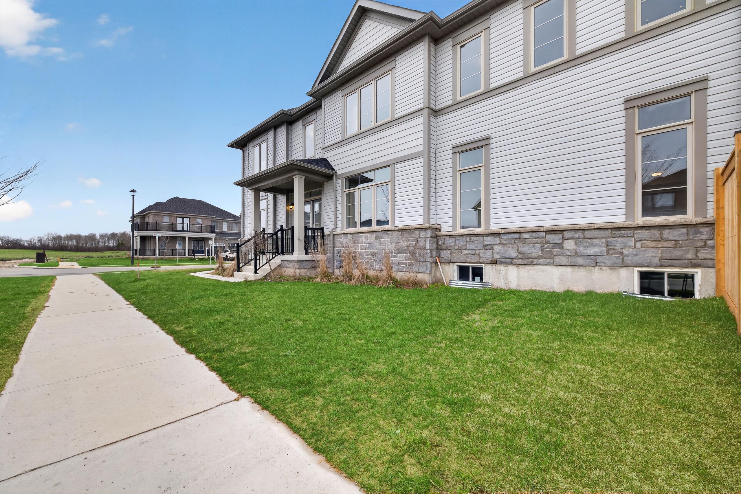 Beautiful 5-bedroom, 4-bathroom home in the heart of fergus, offering approximately 2,700 sq ft of living space on a premium corner lot. Features a double door entry leading to a bright foyer and main floor den/office. Functional layout with formal dining room, spacious great room, and modern kitchen designed for seamless living and entertaining. Second floor includes 5 generously sized bedrooms and 3 full bathrooms. Primary bedroom features a walk-in closet with double racks and a 5-piece ensuite with double sinks, glass shower, and separate soaker tub. One bedroom includes a private ensuite, while others share a jack & jill bathroom. Unfinished basement with builder-provided separate side entrance offers excellent potential for future development or in-law suite. Located across from a future park, providing added privacy and long-term value. Ideal for families seeking space and functionality.