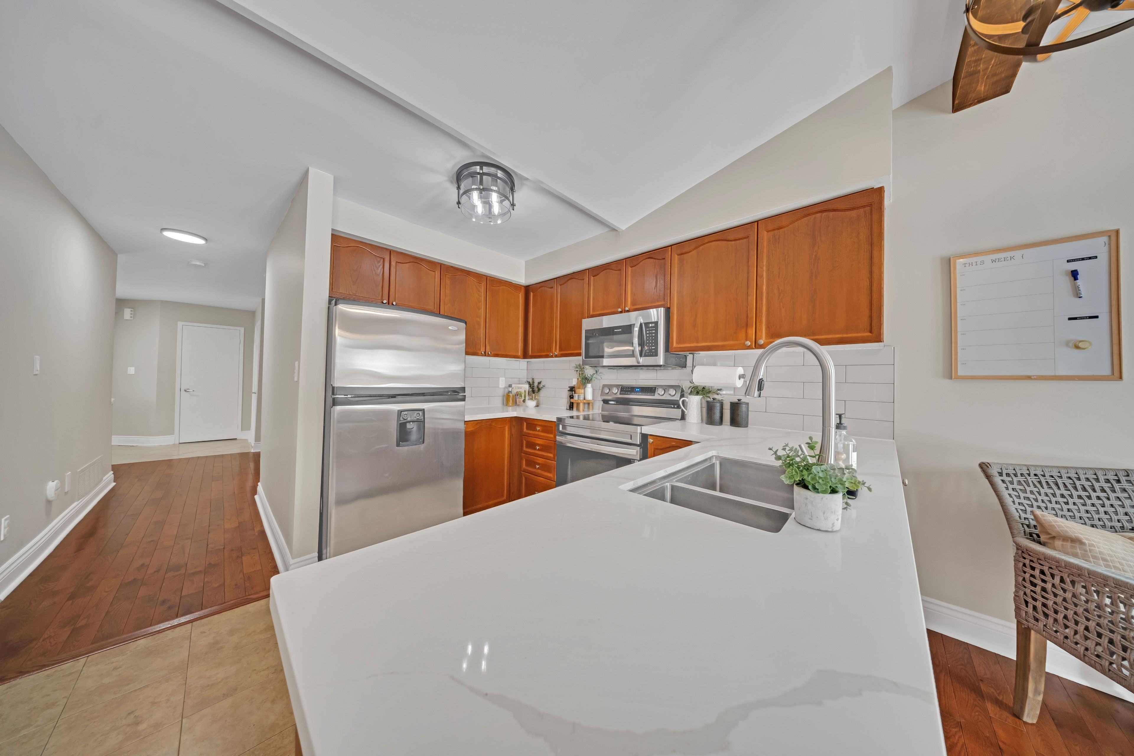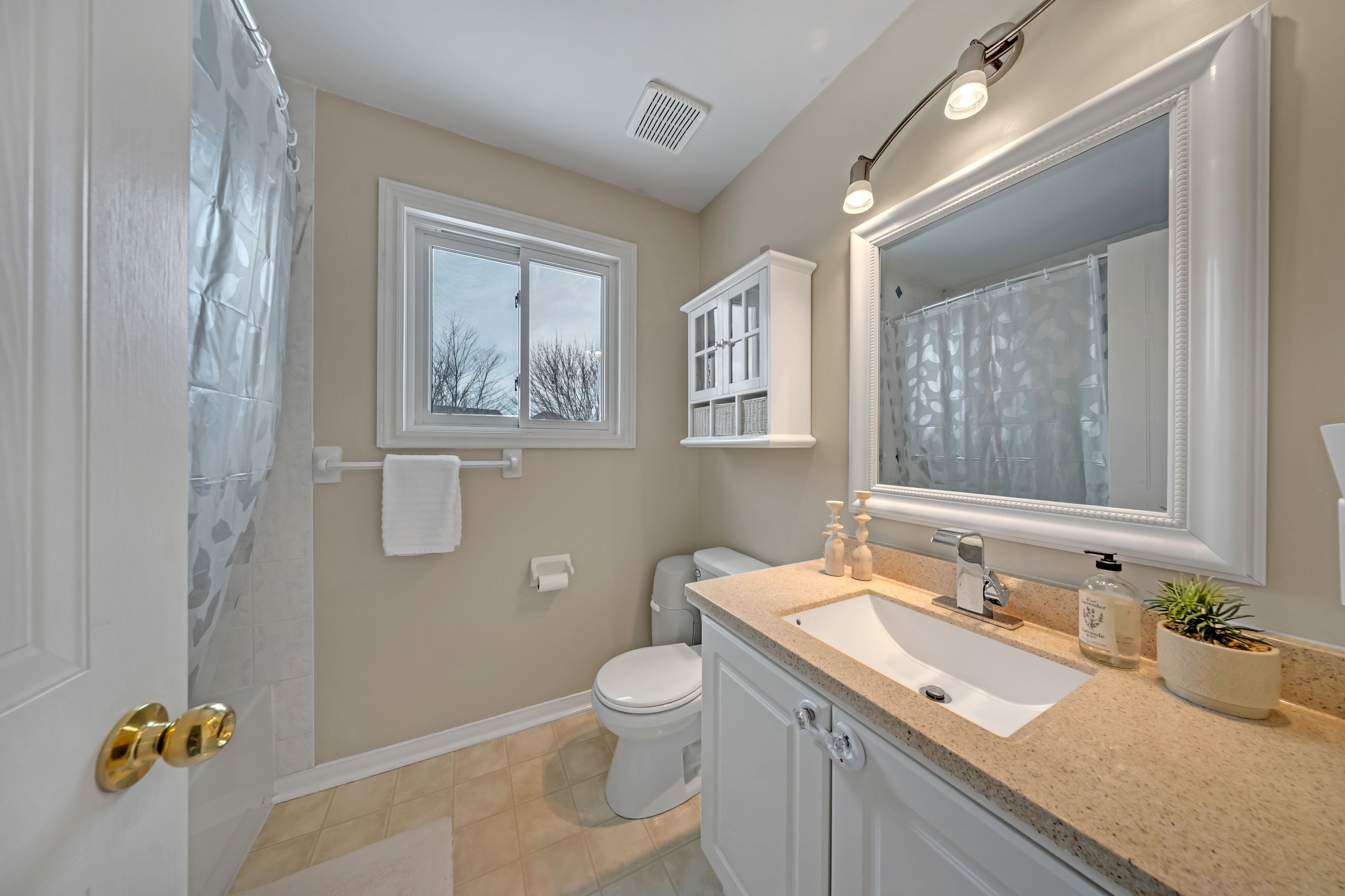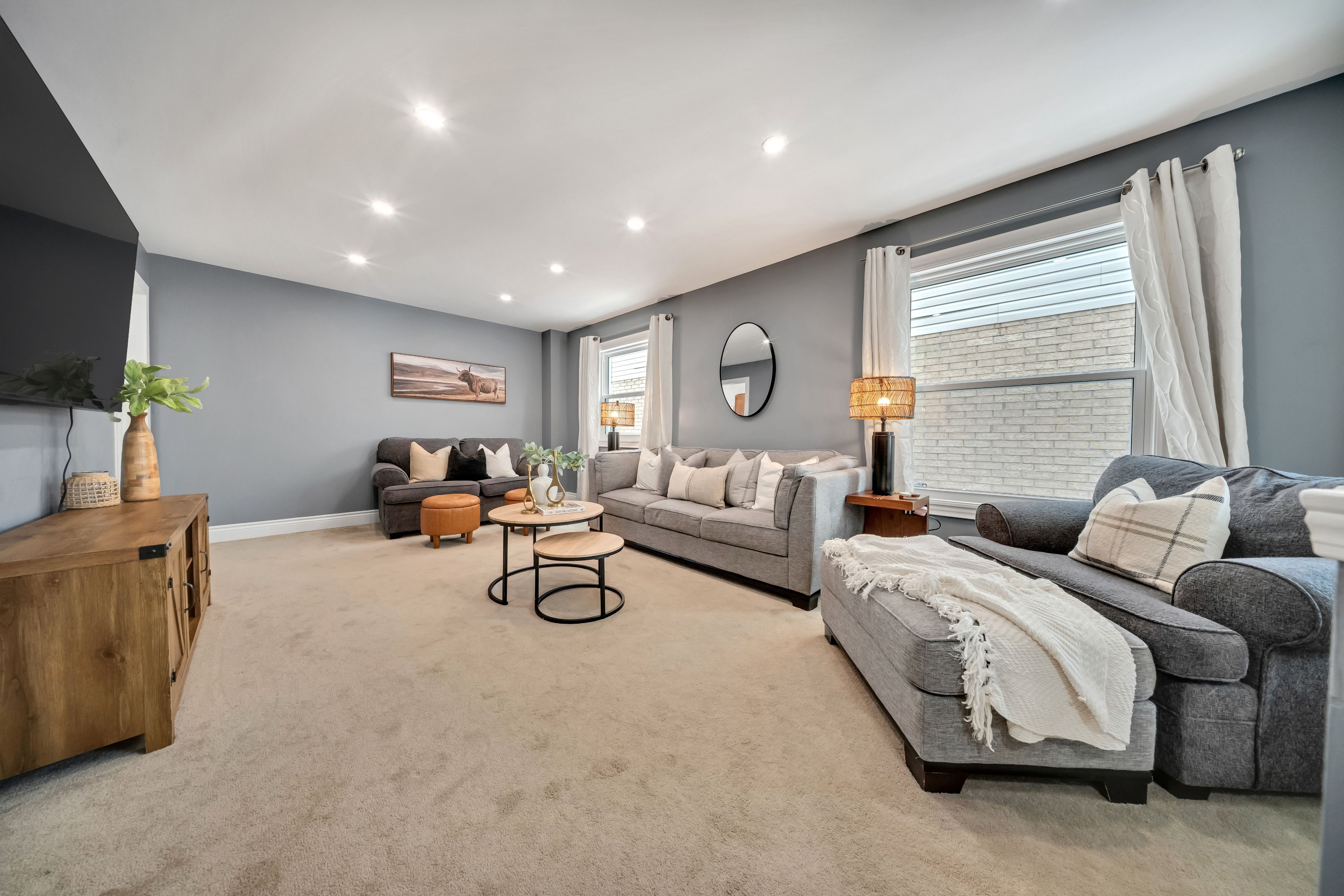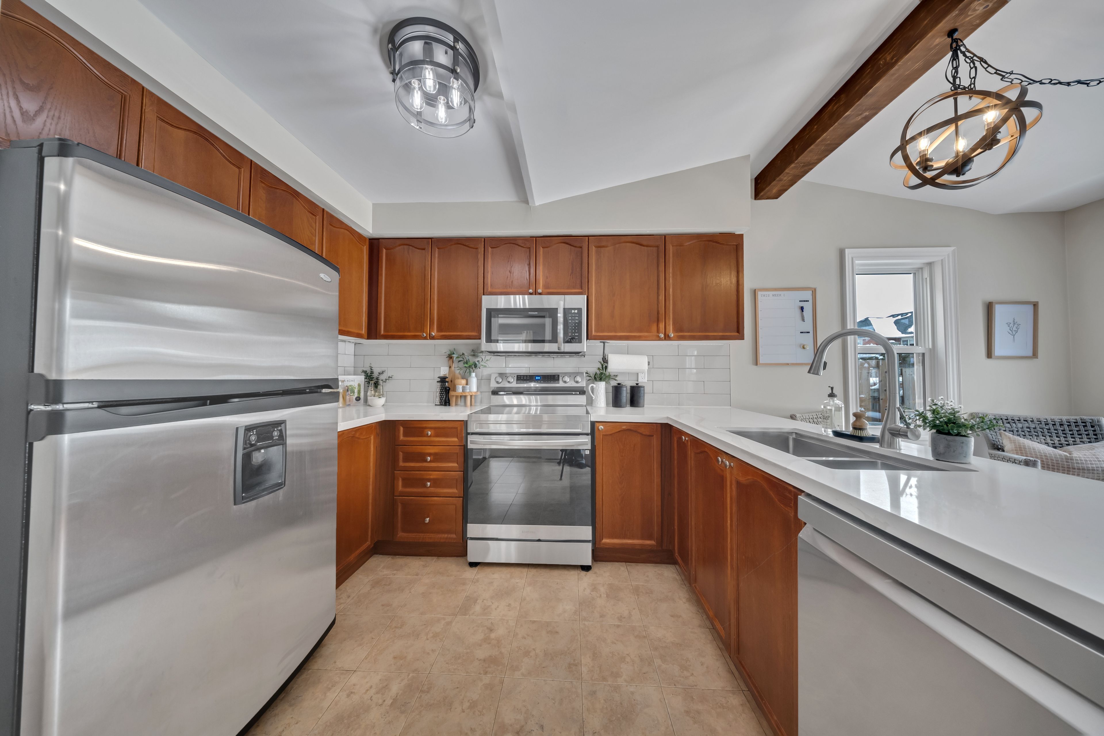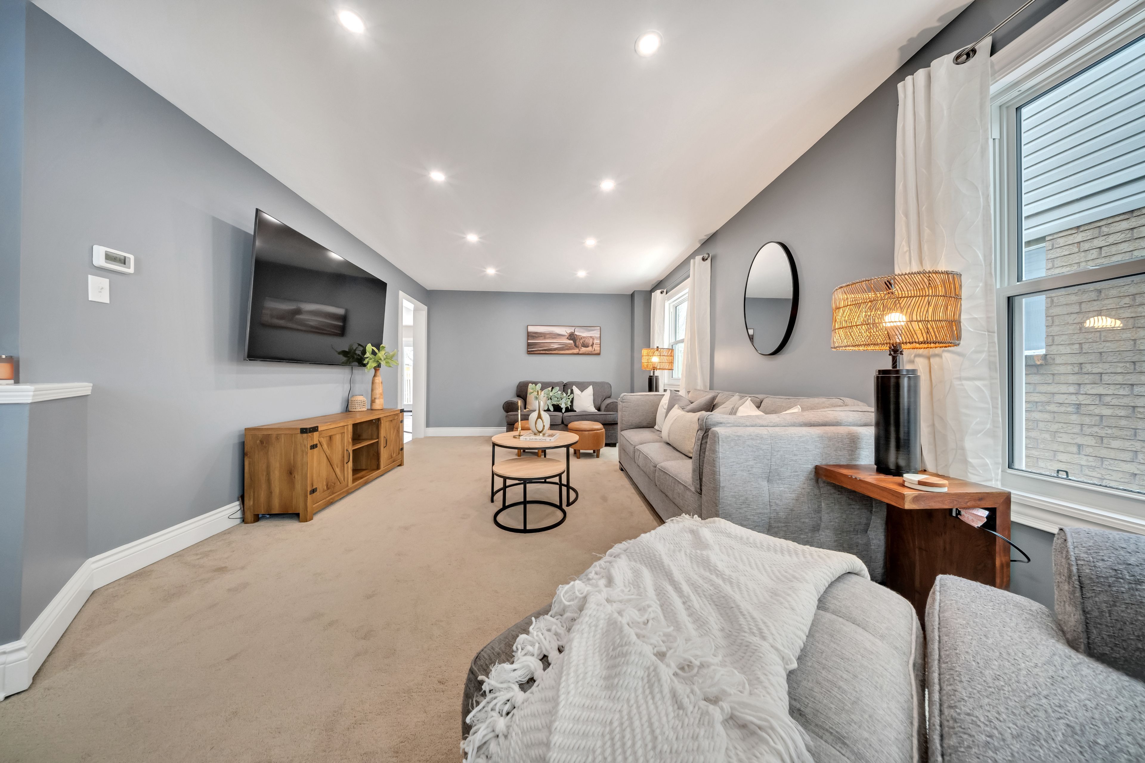 • Bright eat-in kitchen with quartz counters and a family room with vaulted ceiling.