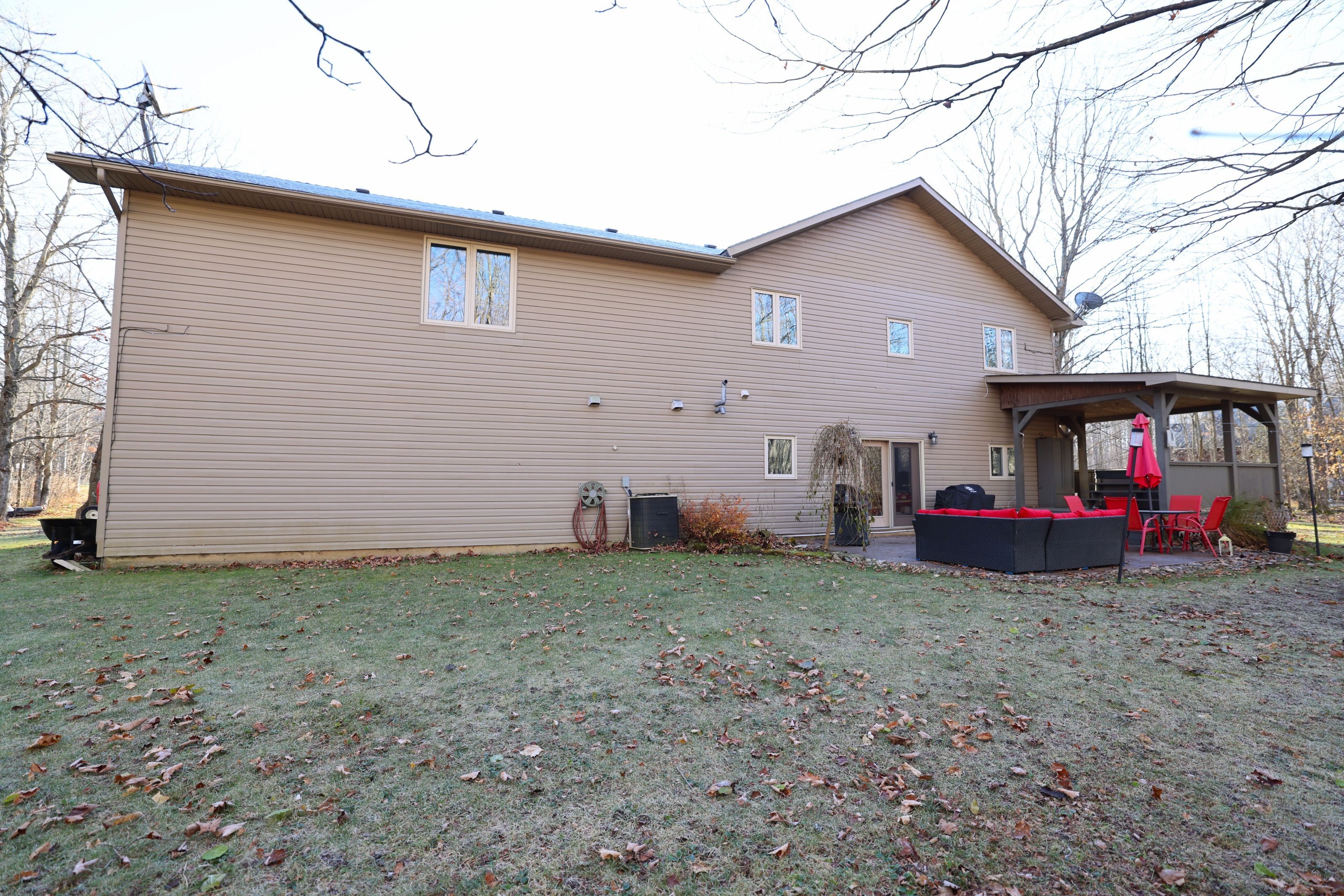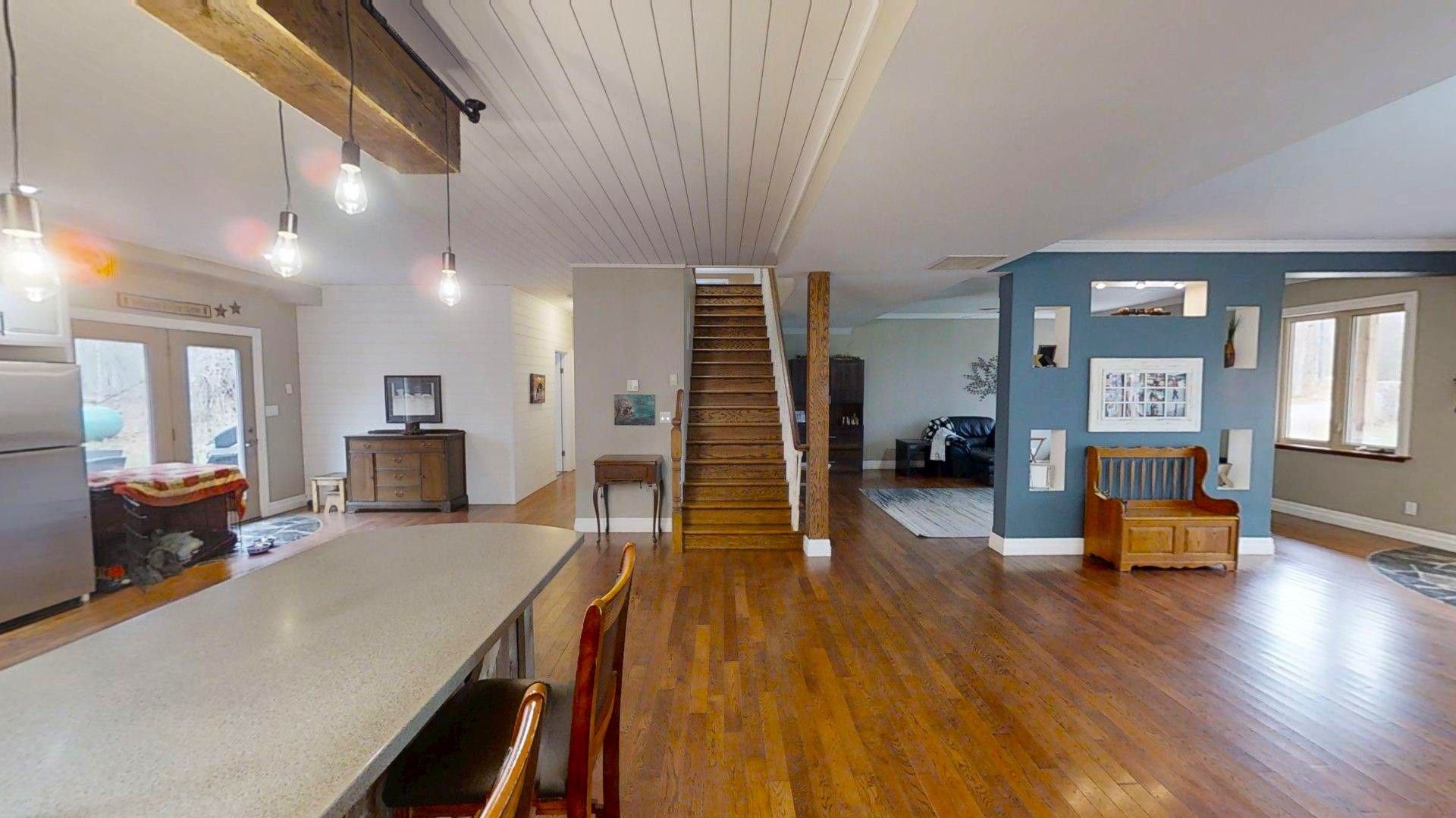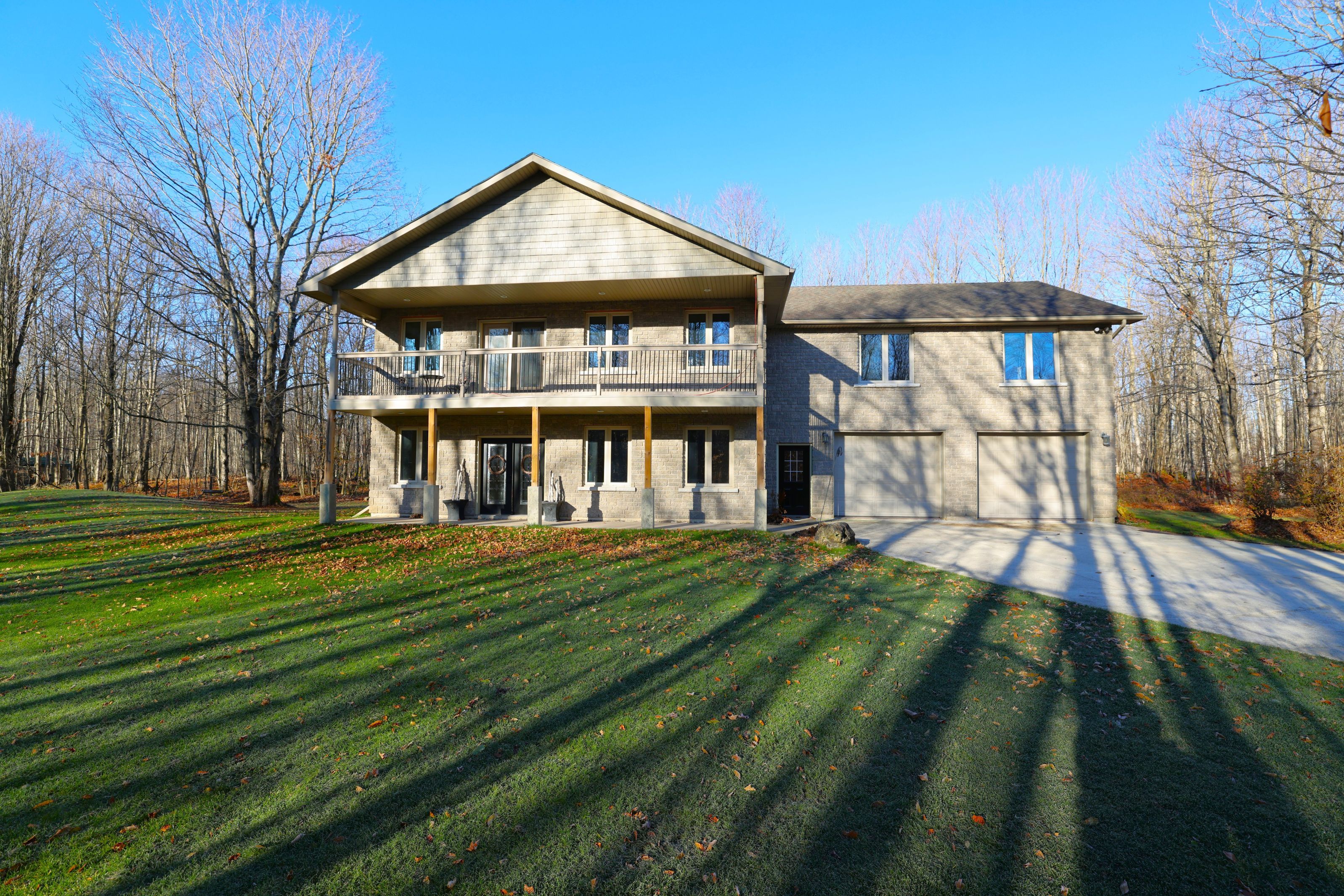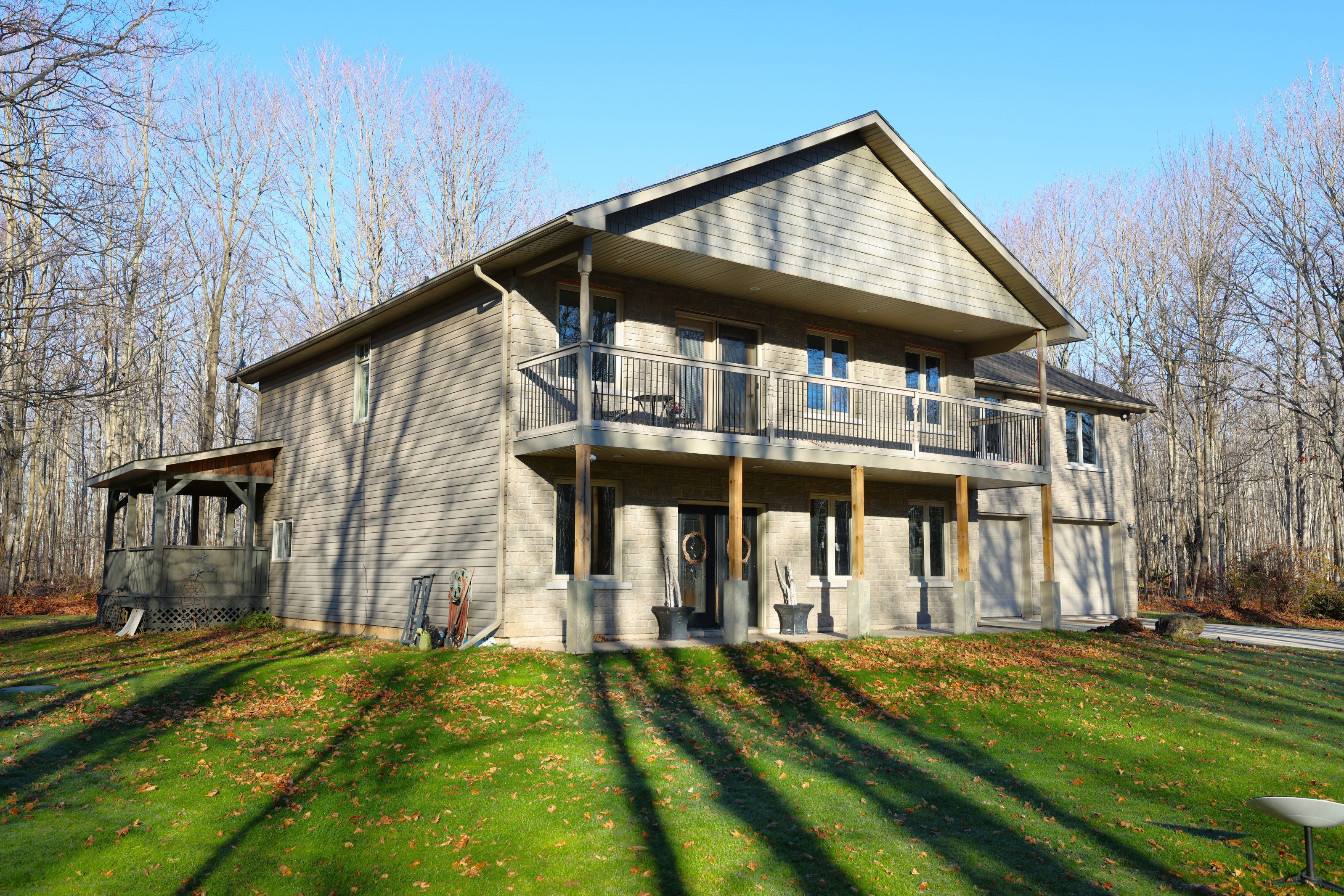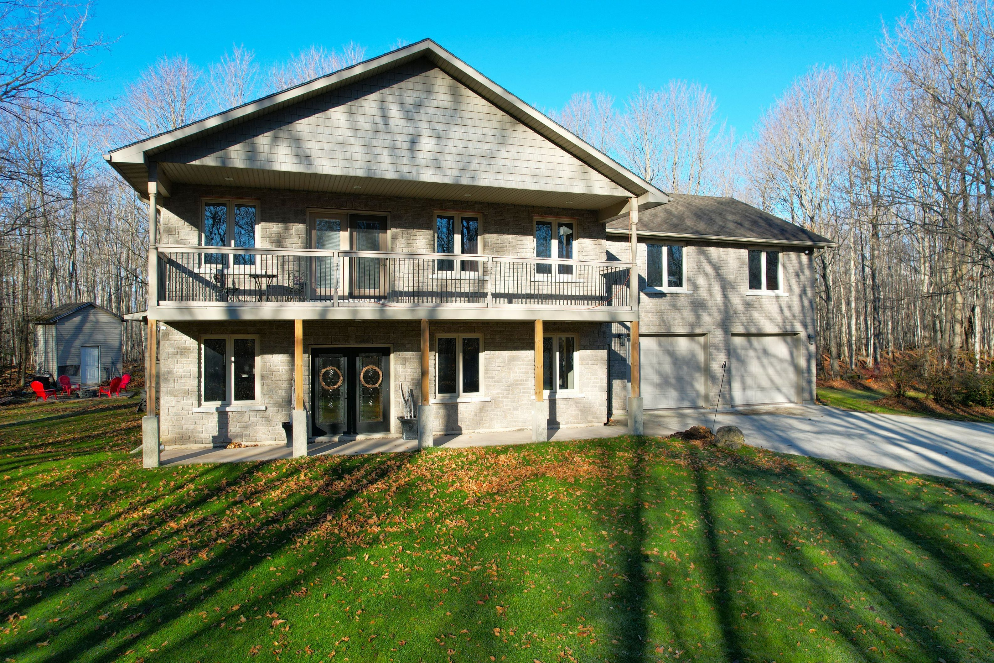 This impressive home in georgian bluffs, ontario, on 2. 01 acres, offers a perfect blend of modern amenities and classic charm. The two-story residence features four bedrooms, three bathrooms, including a generously sized primary suite. The home's entryway is particularly striking, with ornate glass-paneled doors and a distinctive stone floor inlay. The heart of the home is its open concept living area, where the kitchen, dining room, and living room seamlessly flow together. The kitchen is a standout feature with its white cabinetry, stainless steel appliances, and large breakfast bar, perfect for both cooking and entertaining. Hardwood floors run throughout the main living areas, adding warmth and elegance. Large windows and french doors allow natural light to flood the space, while offering views of the surrounding landscape. The bathrooms are well-appointed, one 3pc. With shower on the main floor, a 4pc. Bath on the upper level + the primary ensuite featuring a luxurious marble-look walk-in shower. The main floor laundry is conveniently located in the hall, just off the garage. Upstairs you'll find an amazing bonus-a super large rec room for all ages to enjoy! This multi-purpose room offers a ton of possibilities & is a pleasure to view. The master bedroom is also quite large & features access to upper balcony, as well as a large dream ensuite. Additional features include ceiling fans, recessed lighting, in-floor heating throughout, on demand hot water, central air for cooling, a large, attached garage and a welcoming front porch. The overall design blends modern amenities with touches of rustic charm, creating a comfortable and stylish living environment. Tons of room to kick back in nature and enjoy outdoor living here! Just a short drive to neighbouring towns such as: owen sound, shallow lake & wiarton. This is your next dream home!