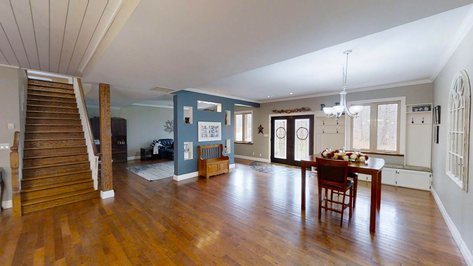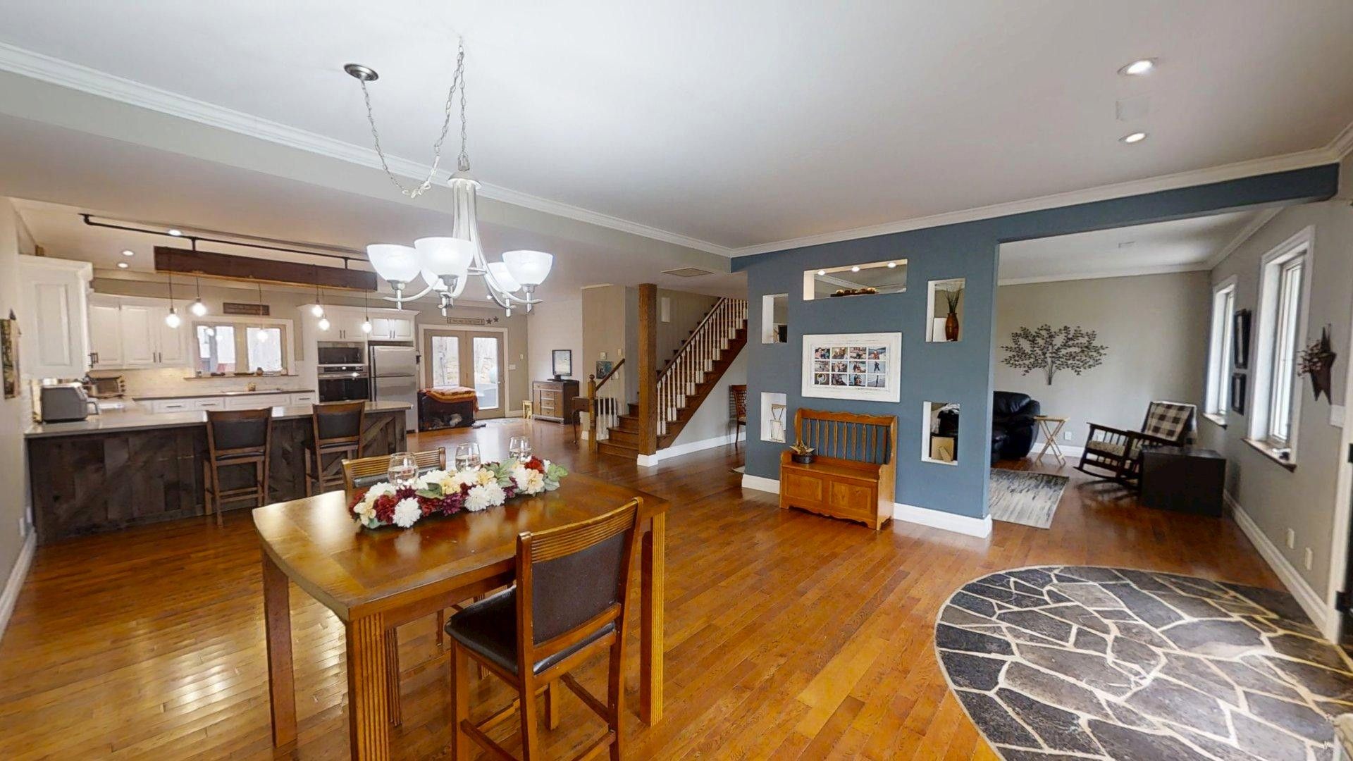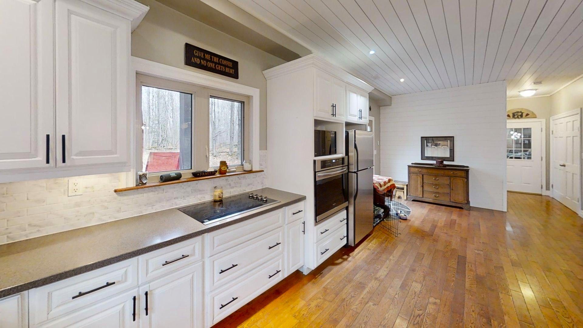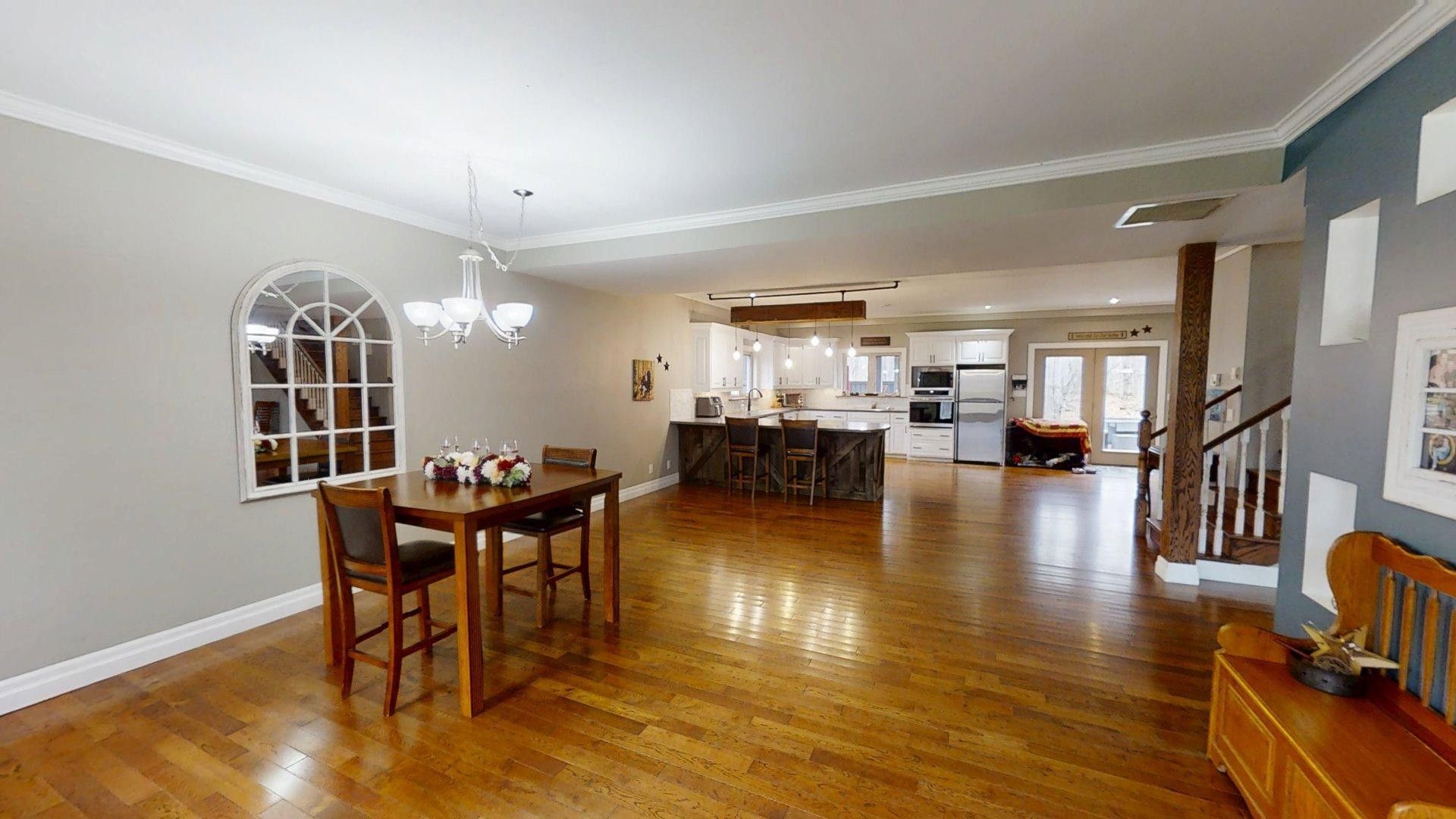 This impressive home in georgian bluffs, ontario, on 2. 01 acres, offers a perfect blend of modern amenities and classic charm. The two-story residence features four bedrooms, three bathrooms, including a generously sized primary suite. The home's entryway is particularly striking, with ornate glass-paneled doors and a distinctive stone floor inlay. The heart of the home is its open concept living area, where the kitchen, dining room, and living room seamlessly flow together. The kitchen is a standout feature with its white cabinetry, stainless steel appliances, and large breakfast bar, perfect for both cooking and entertaining. Hardwood floors run throughout the main living areas, adding warmth and elegance. Large windows and french doors allow natural light to flood the space, while offering views of the surrounding landscape. The bathrooms are well-appointed, one 3pc. With shower on the main floor, a 4pc. Bath on the upper level + the primary ensuite featuring a luxurious marble-look walk-in shower. The main floor laundry is conveniently located in the hall, just off the garage. Upstairs you'll find an amazing bonus-a super large rec room for all ages to enjoy! This multi-purpose room offers a ton of possibilities & is a pleasure to view. The master bedroom is also quite large & features access to upper balcony, as well as a large dream ensuite. Additional features include ceiling fans, recessed lighting, in-floor heating throughout, on demand hot water, central air for cooling, a large, attached garage and a welcoming front porch. The overall design blends modern amenities with touches of rustic charm, creating a comfortable and stylish living environment. Tons of room to kick back in nature and enjoy outdoor living here! Just a short drive to neighbouring towns such as: owen sound, shallow lake & wiarton. This is your next dream home!