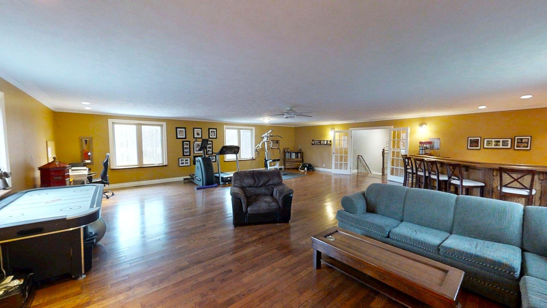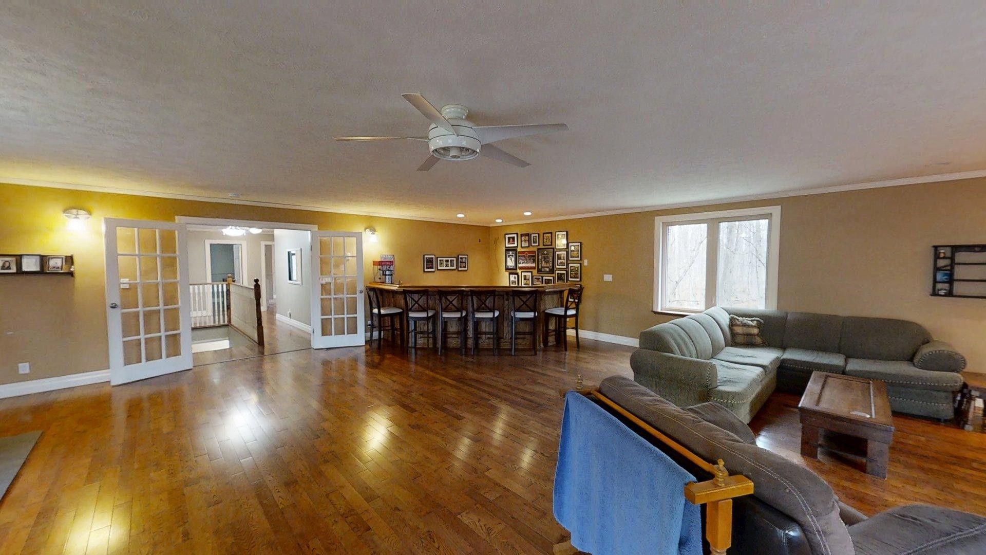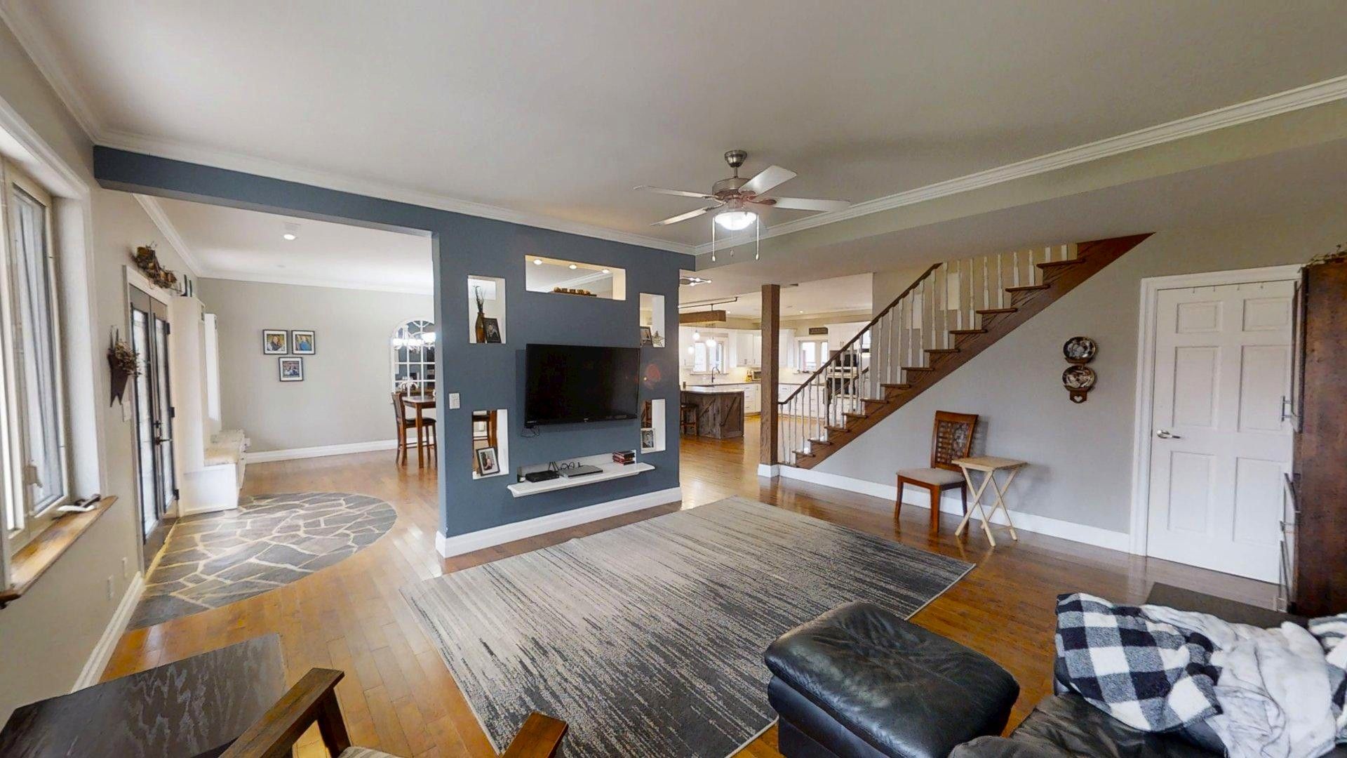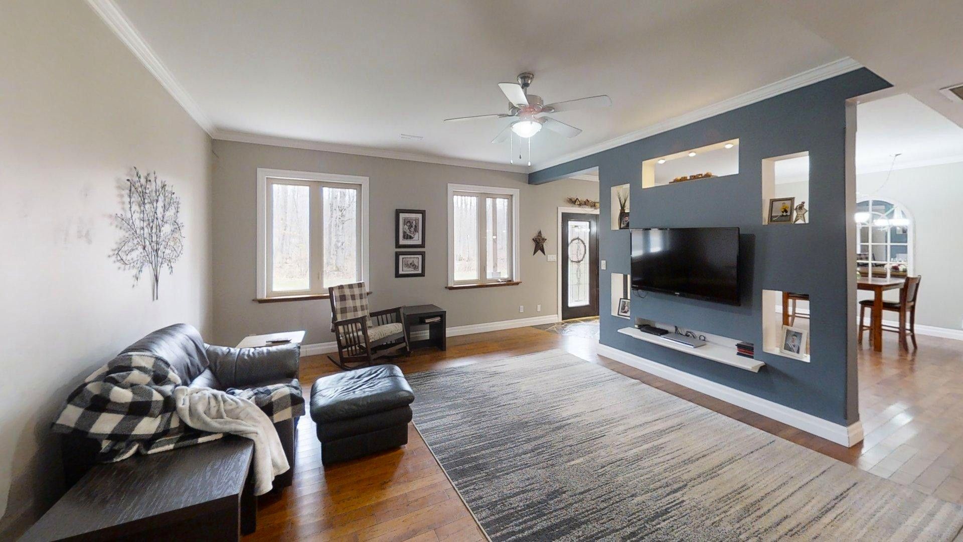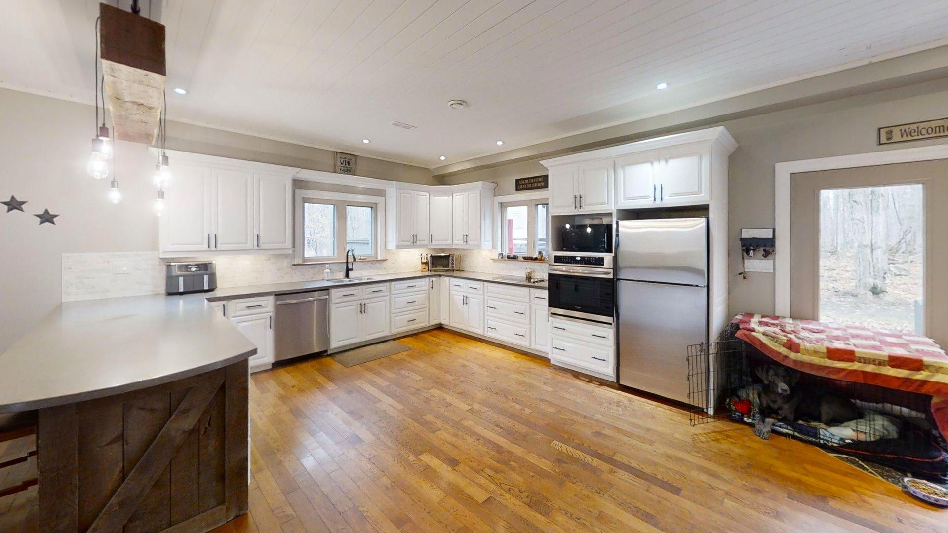This impressive home in georgian bluffs, ontario, on 2. 01 acres, offers a perfect blend of modern amenities and classic charm. The two-story residence features four bedrooms, three bathrooms, including a generously sized primary suite. The home's entryway is particularly striking, with ornate glass-paneled doors and a distinctive stone floor inlay. The heart of the home is its open concept living area, where the kitchen, dining room, and living room seamlessly flow together. The kitchen is a standout feature with its white cabinetry, stainless steel appliances, and large breakfast bar, perfect for both cooking and entertaining. Hardwood floors run throughout the main living areas, adding warmth and elegance. Large windows and french doors allow natural light to flood the space, while offering views of the surrounding landscape. The bathrooms are well-appointed, one 3pc. With shower on the main floor, a 4pc. Bath on the upper level + the primary ensuite featuring a luxurious marble-look walk-in shower. The main floor laundry is conveniently located in the hall, just off the garage. Upstairs you'll find an amazing bonus-a super large rec room for all ages to enjoy! This multi-purpose room offers a ton of possibilities & is a pleasure to view. The master bedroom is also quite large & features access to upper balcony, as well as a large dream ensuite. Additional features include ceiling fans, recessed lighting, in-floor heating throughout, on demand hot water, central air for cooling, a large, attached garage and a welcoming front porch. The overall design blends modern amenities with touches of rustic charm, creating a comfortable and stylish living environment. Tons of room to kick back in nature and enjoy outdoor living here! Just a short drive to neighbouring towns such as: owen sound, shallow lake & wiarton. This is your next dream home!