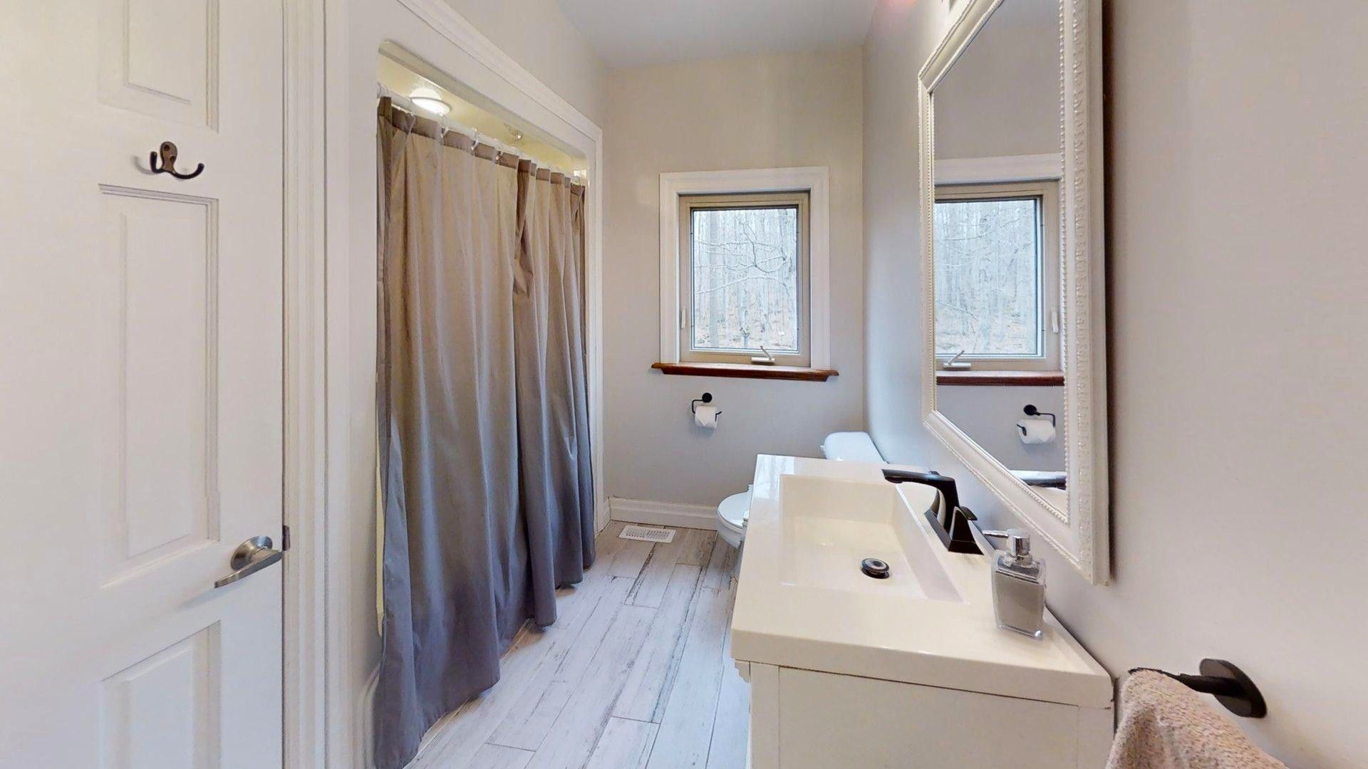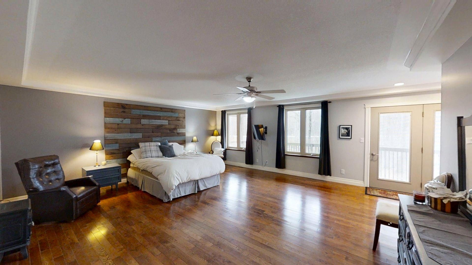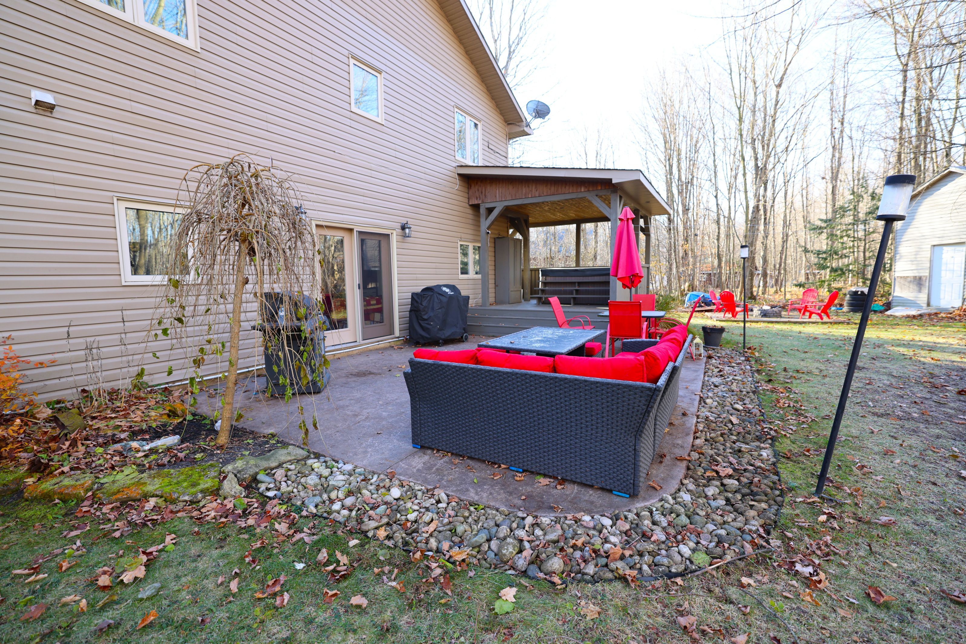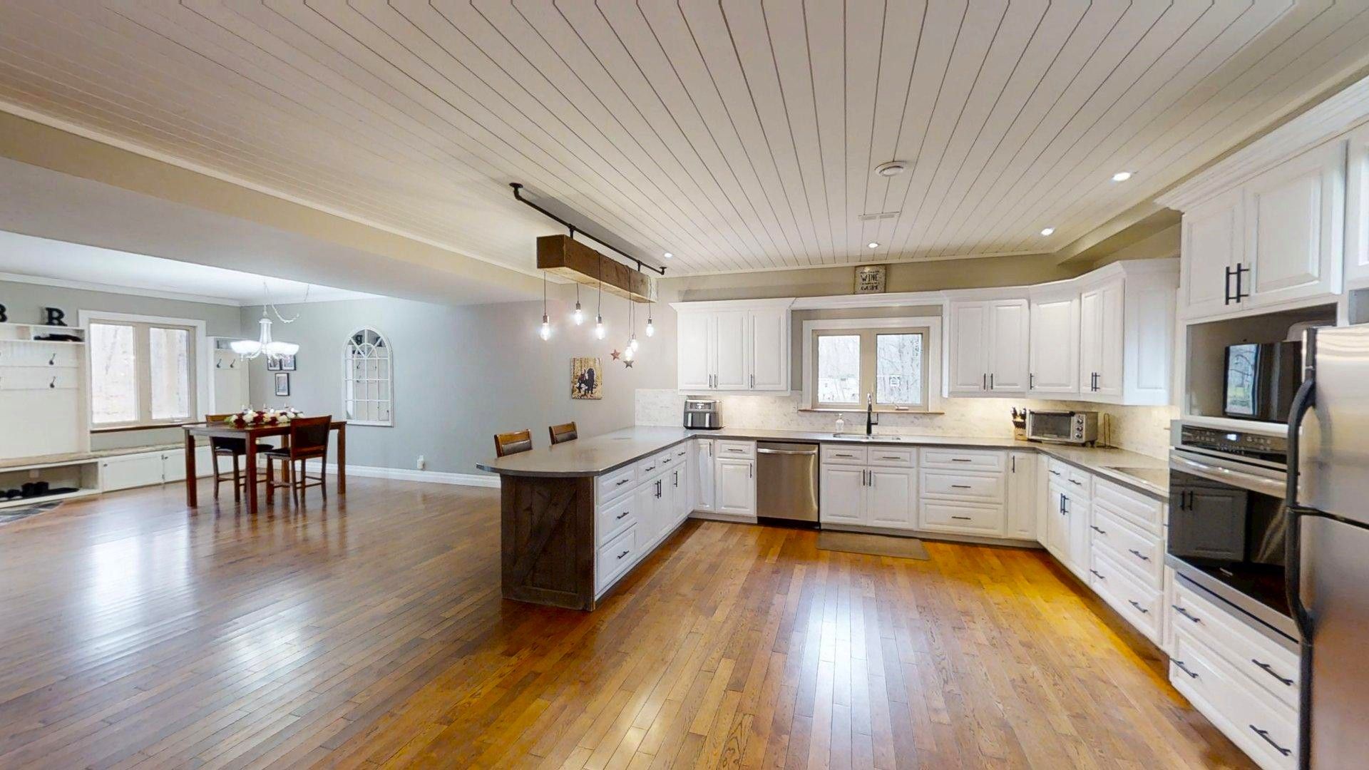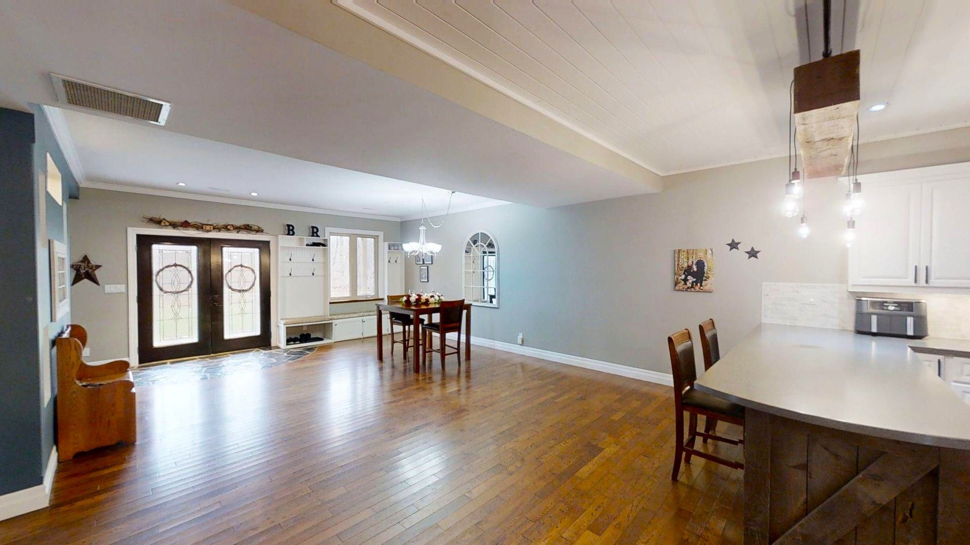 This impressive home in georgian bluffs, ontario, on 2. 01 acres, offers a perfect blend of modern amenities and classic charm. The two-story residence features four bedrooms, three bathrooms, including a generously sized primary suite. The home's entryway is particularly striking, with ornate glass-paneled doors and a distinctive stone floor inlay. The heart of the home is its open concept living area, where the kitchen, dining room, and living room seamlessly flow together. The kitchen is a standout feature with its white cabinetry, stainless steel appliances, and large breakfast bar, perfect for both cooking and entertaining. Hardwood floors run throughout the main living areas, adding warmth and elegance. Large windows and french doors allow natural light to flood the space, while offering views of the surrounding landscape. The bathrooms are well-appointed, one 3pc. With shower on the main floor, a 4pc. Bath on the upper level + the primary ensuite featuring a luxurious marble-look walk-in shower. The main floor laundry is conveniently located in the hall, just off the garage. Upstairs you'll find an amazing bonus-a super large rec room for all ages to enjoy! This multi-purpose room offers a ton of possibilities & is a pleasure to view. The master bedroom is also quite large & features access to upper balcony, as well as a large dream ensuite. Additional features include ceiling fans, recessed lighting, in-floor heating throughout, on demand hot water, central air for cooling, a large, attached garage and a welcoming front porch. The overall design blends modern amenities with touches of rustic charm, creating a comfortable and stylish living environment. Tons of room to kick back in nature and enjoy outdoor living here! Just a short drive to neighbouring towns such as: owen sound, shallow lake & wiarton. This is your next dream home!
