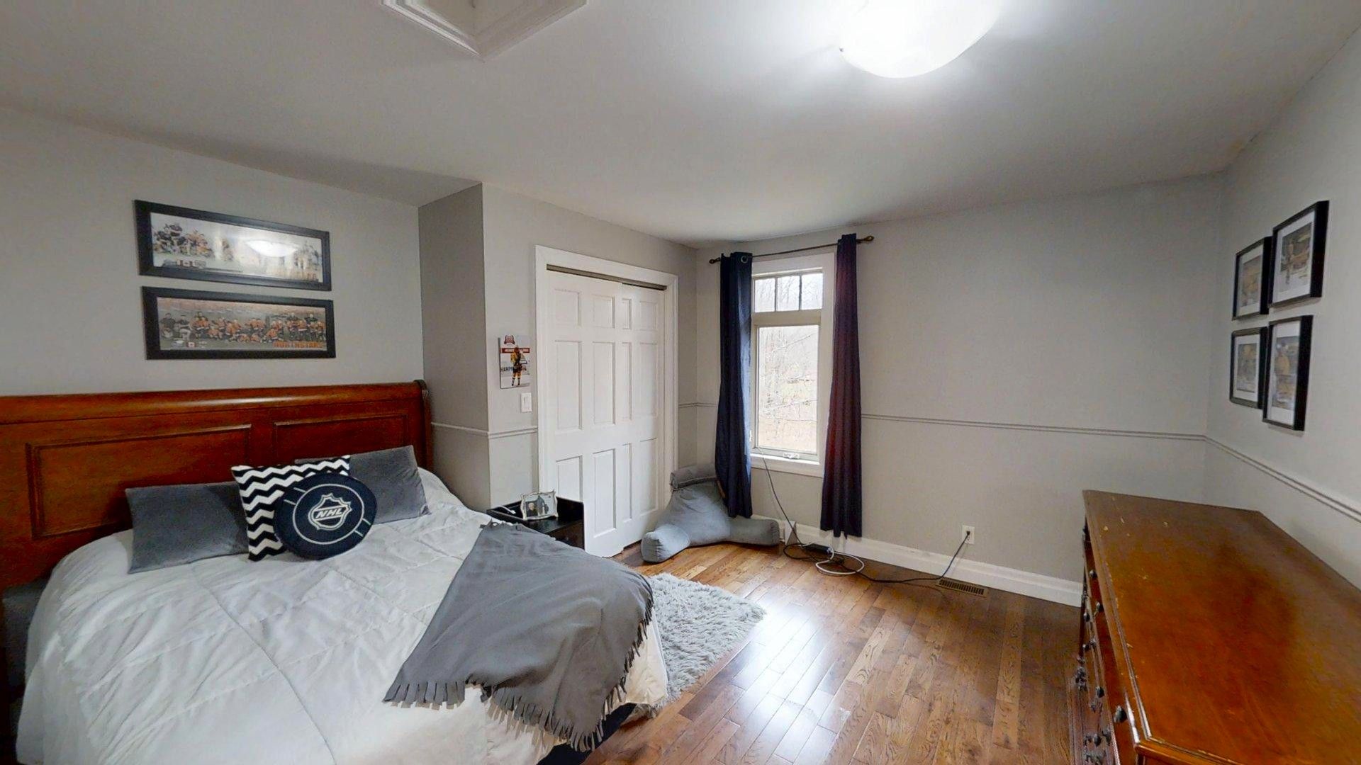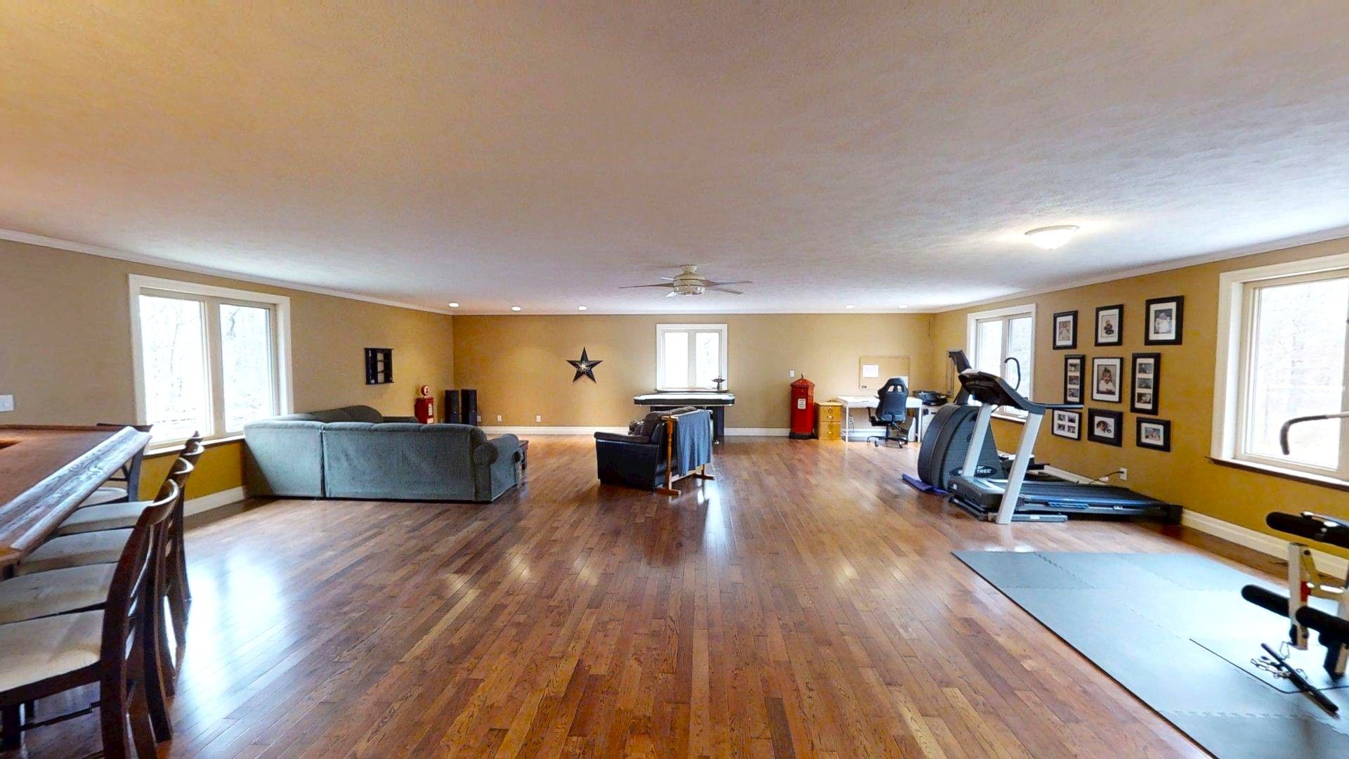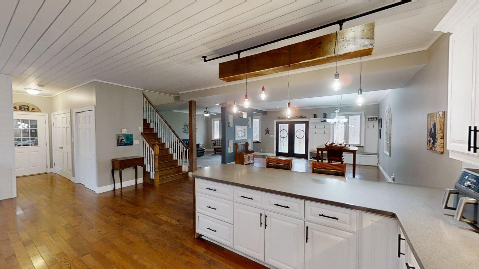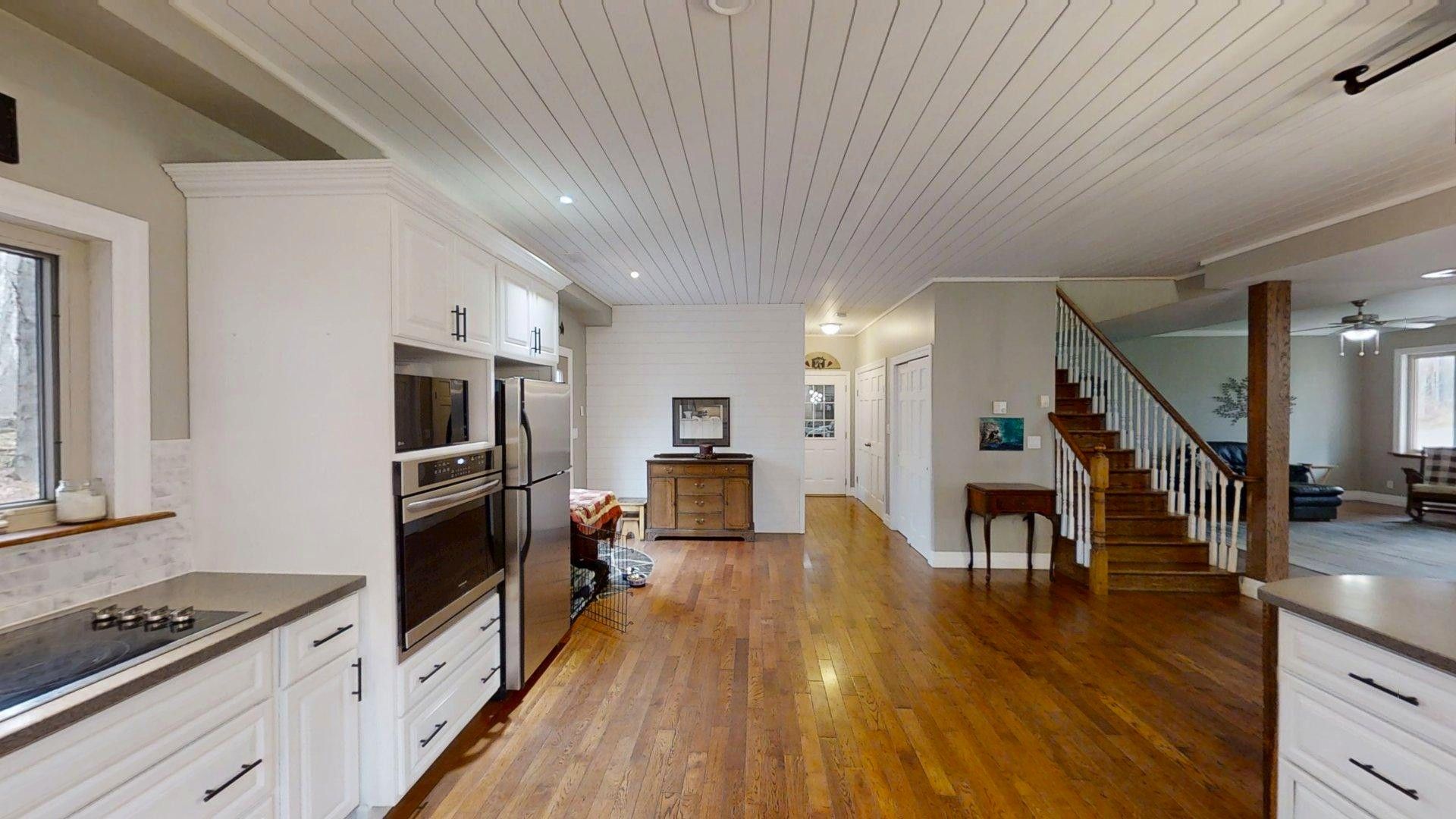 This impressive home in georgian bluffs, ontario, on 2. 01 acres, offers a perfect blend of modern amenities and classic charm. The two-story residence features four bedrooms, three bathrooms, including a generously sized primary suite. The home's entryway is particularly striking, with ornate glass-paneled doors and a distinctive stone floor inlay. The heart of the home is its open concept living area, where the kitchen, dining room, and living room seamlessly flow together. The kitchen is a standout feature with its white cabinetry, stainless steel appliances, and large breakfast bar, perfect for both cooking and entertaining. Hardwood floors run throughout the main living areas, adding warmth and elegance. Large windows and french doors allow natural light to flood the space, while offering views of the surrounding landscape. The bathrooms are well-appointed, one 3pc. With shower on the main floor, a 4pc. Bath on the upper level + the primary ensuite featuring a luxurious marble-look walk-in shower. The main floor laundry is conveniently located in the hall, just off the garage. Upstairs you'll find an amazing bonus-a super large rec room for all ages to enjoy! This multi-purpose room offers a ton of possibilities & is a pleasure to view. The master bedroom is also quite large & features access to upper balcony, as well as a large dream ensuite. Additional features include ceiling fans, recessed lighting, in-floor heating throughout, on demand hot water, central air for cooling, a large, attached garage and a welcoming front porch. The overall design blends modern amenities with touches of rustic charm, creating a comfortable and stylish living environment. Tons of room to kick back in nature and enjoy outdoor living here! Just a short drive to neighbouring towns such as: owen sound, shallow lake & wiarton. This is your next dream home!