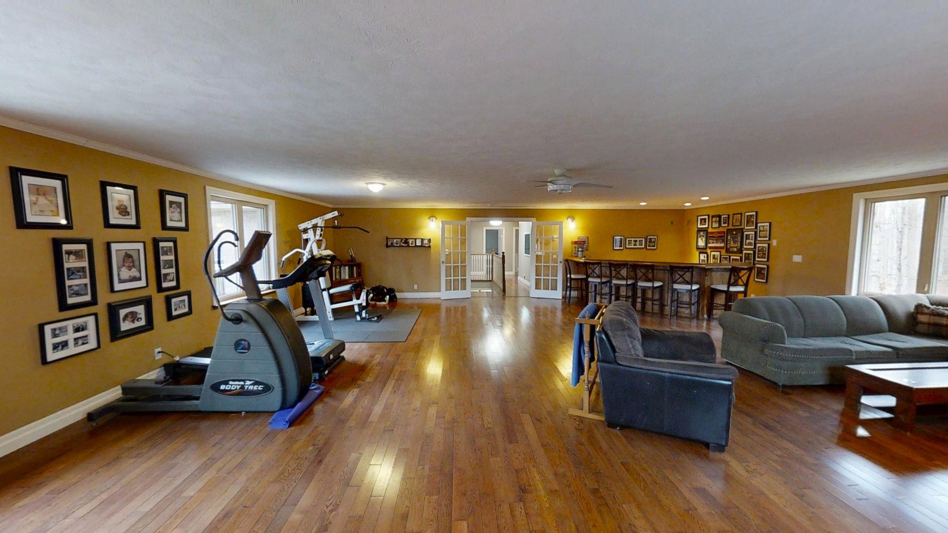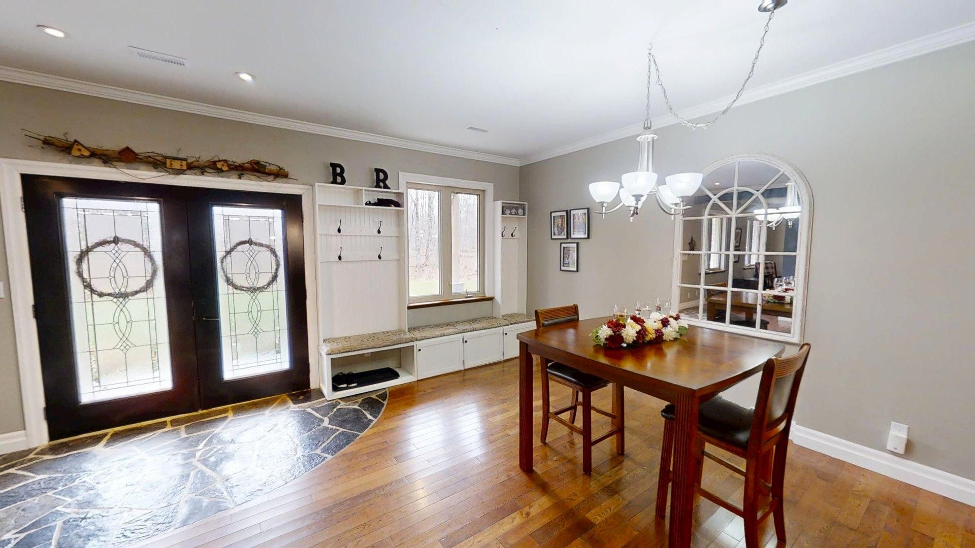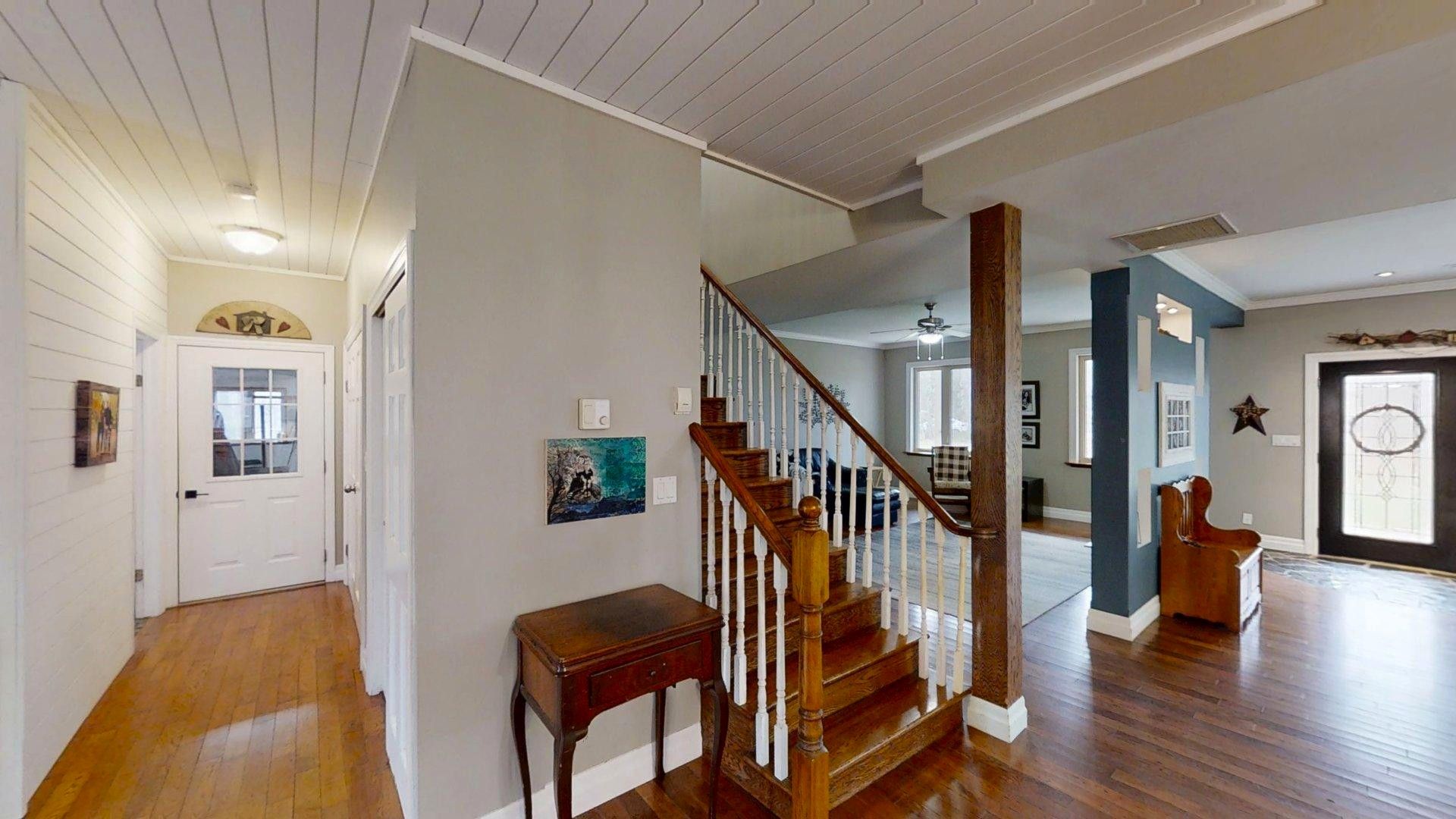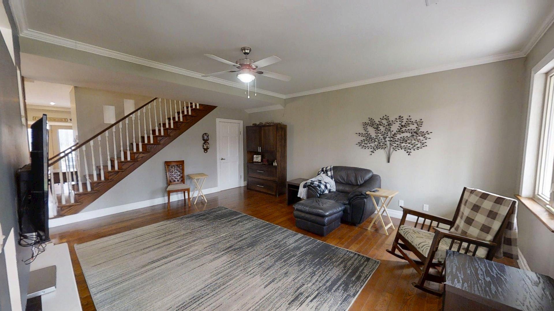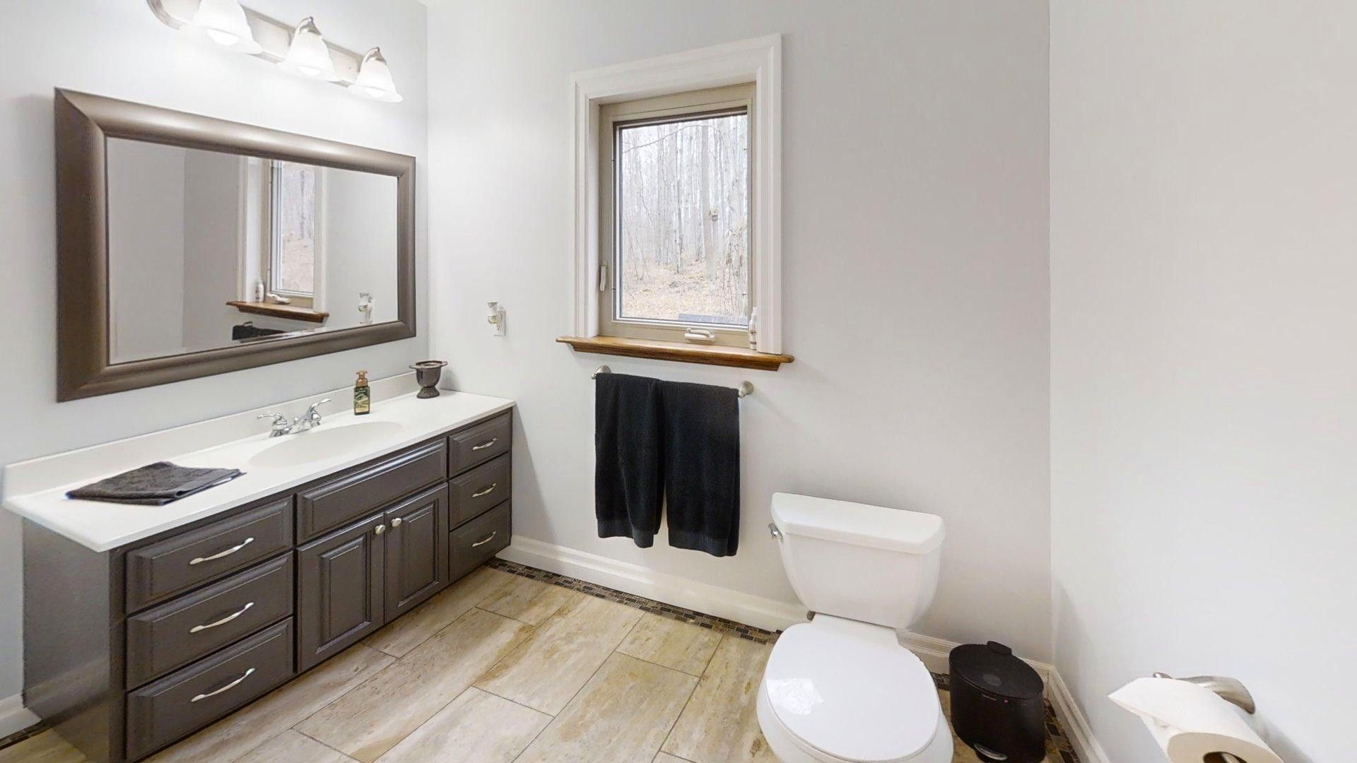This impressive home in georgian bluffs, ontario, on 2. 01 acres, offers a perfect blend of modern amenities and classic charm. The two-story residence features four bedrooms, three bathrooms, including a generously sized primary suite. The home's entryway is particularly striking, with ornate glass-paneled doors and a distinctive stone floor inlay. The heart of the home is its open concept living area, where the kitchen, dining room, and living room seamlessly flow together. The kitchen is a standout feature with its white cabinetry, stainless steel appliances, and large breakfast bar, perfect for both cooking and entertaining. Hardwood floors run throughout the main living areas, adding warmth and elegance. Large windows and french doors allow natural light to flood the space, while offering views of the surrounding landscape. The bathrooms are well-appointed, one 3pc. With shower on the main floor, a 4pc. Bath on the upper level + the primary ensuite featuring a luxurious marble-look walk-in shower. The main floor laundry is conveniently located in the hall, just off the garage. Upstairs you'll find an amazing bonus-a super large rec room for all ages to enjoy! This multi-purpose room offers a ton of possibilities & is a pleasure to view. The master bedroom is also quite large & features access to upper balcony, as well as a large dream ensuite. Additional features include ceiling fans, recessed lighting, in-floor heating throughout, on demand hot water, central air for cooling, a large, attached garage and a welcoming front porch. The overall design blends modern amenities with touches of rustic charm, creating a comfortable and stylish living environment. Tons of room to kick back in nature and enjoy outdoor living here! Just a short drive to neighbouring towns such as: owen sound, shallow lake & wiarton. This is your next dream home!