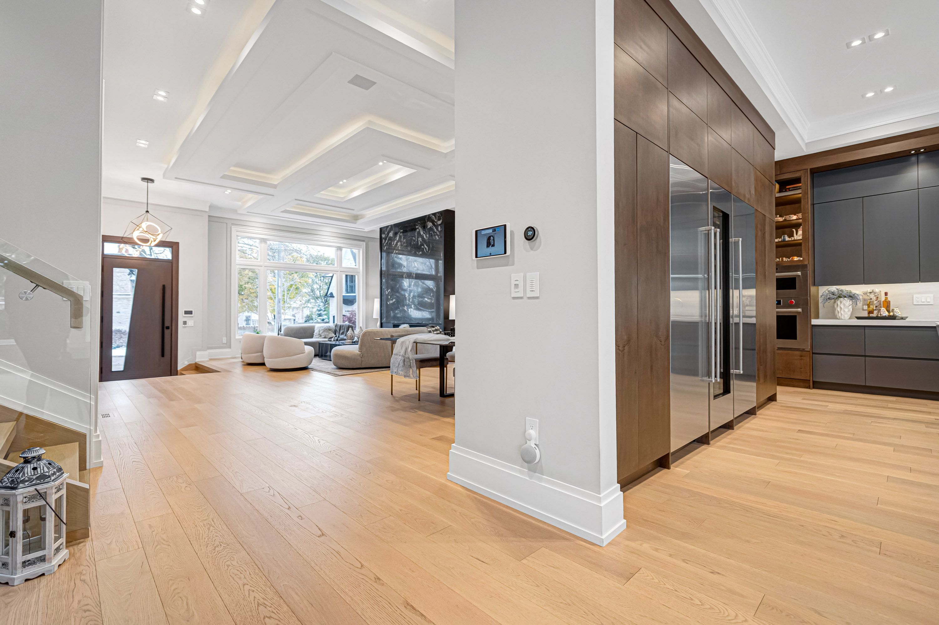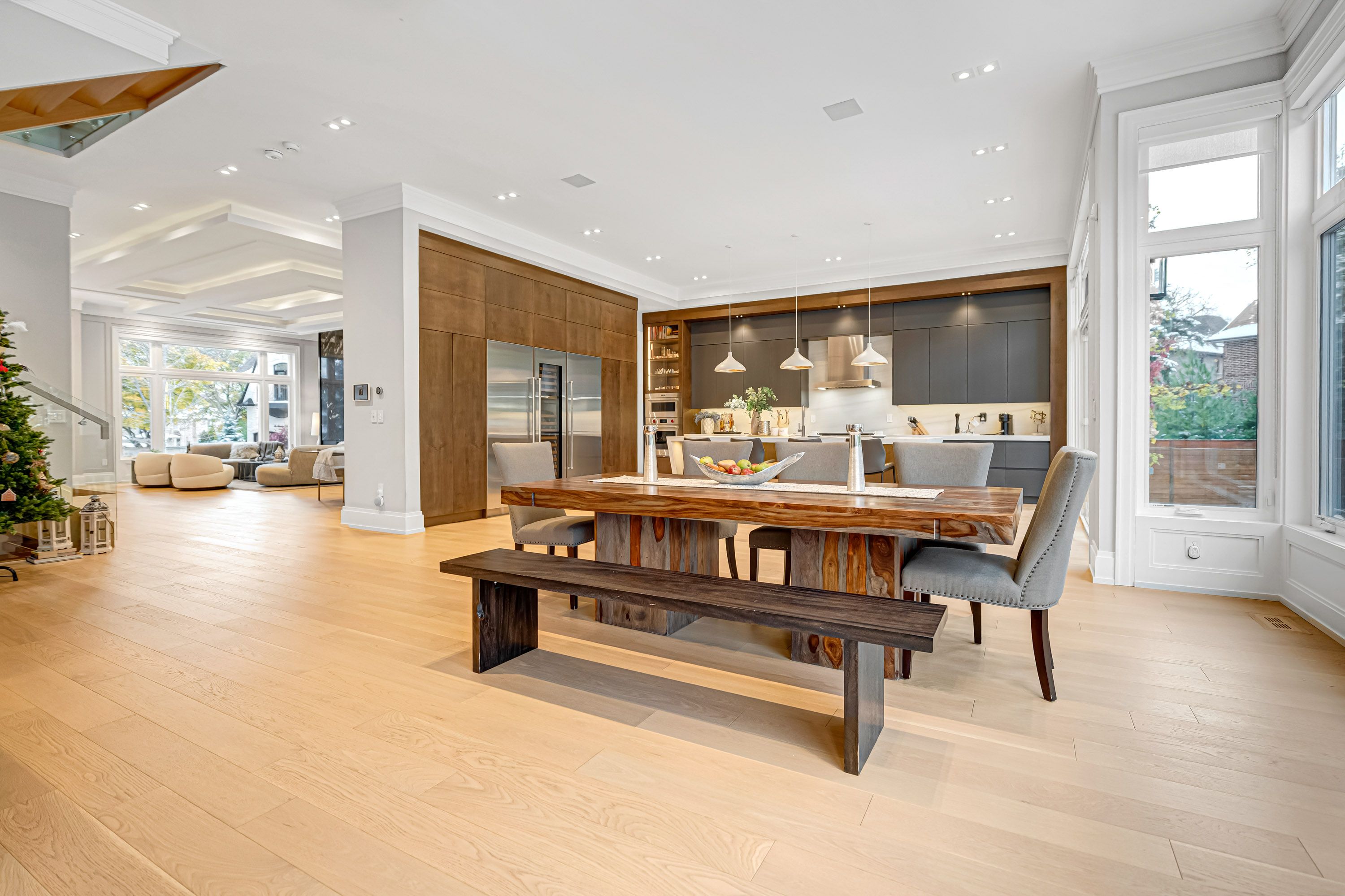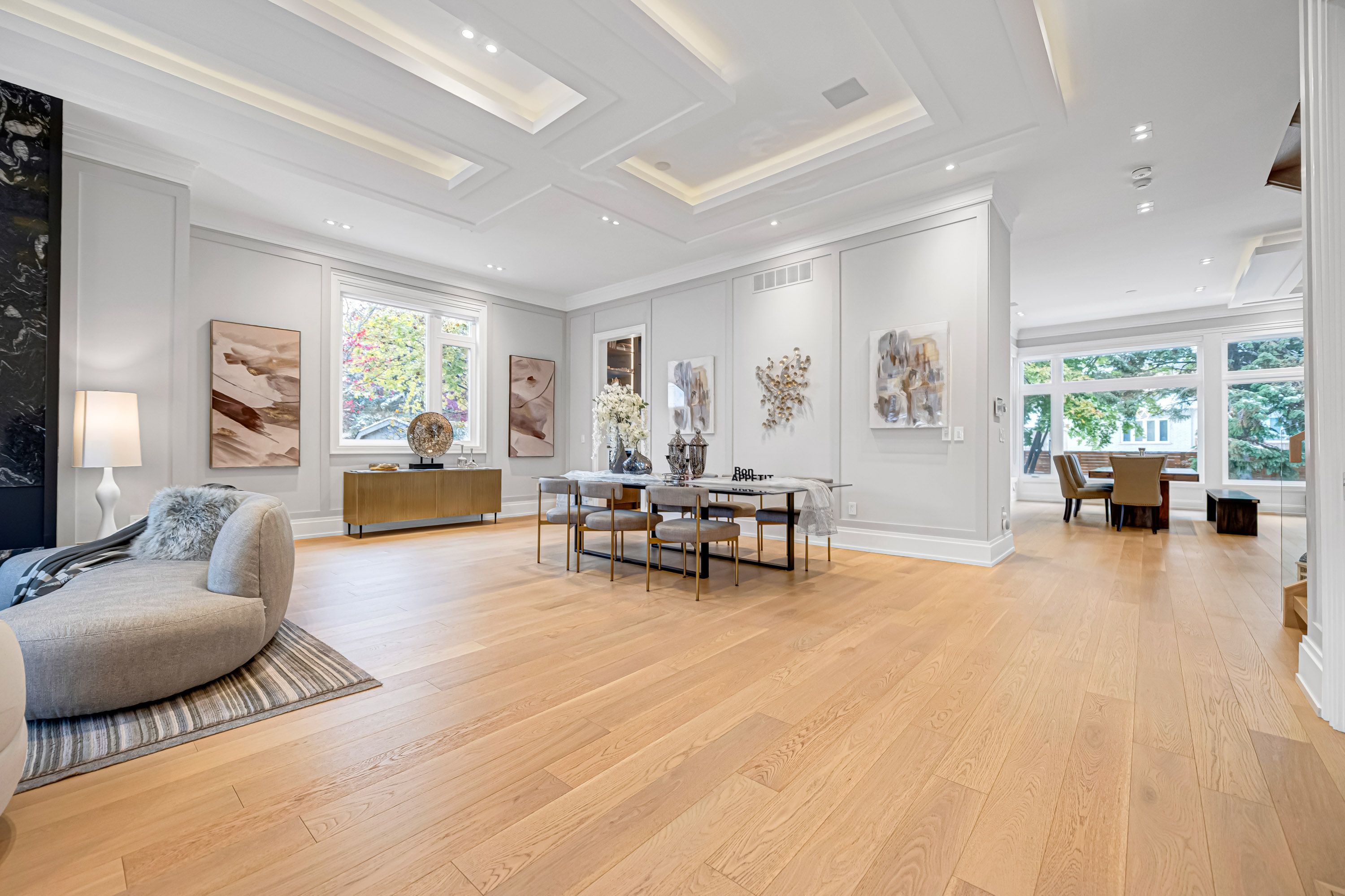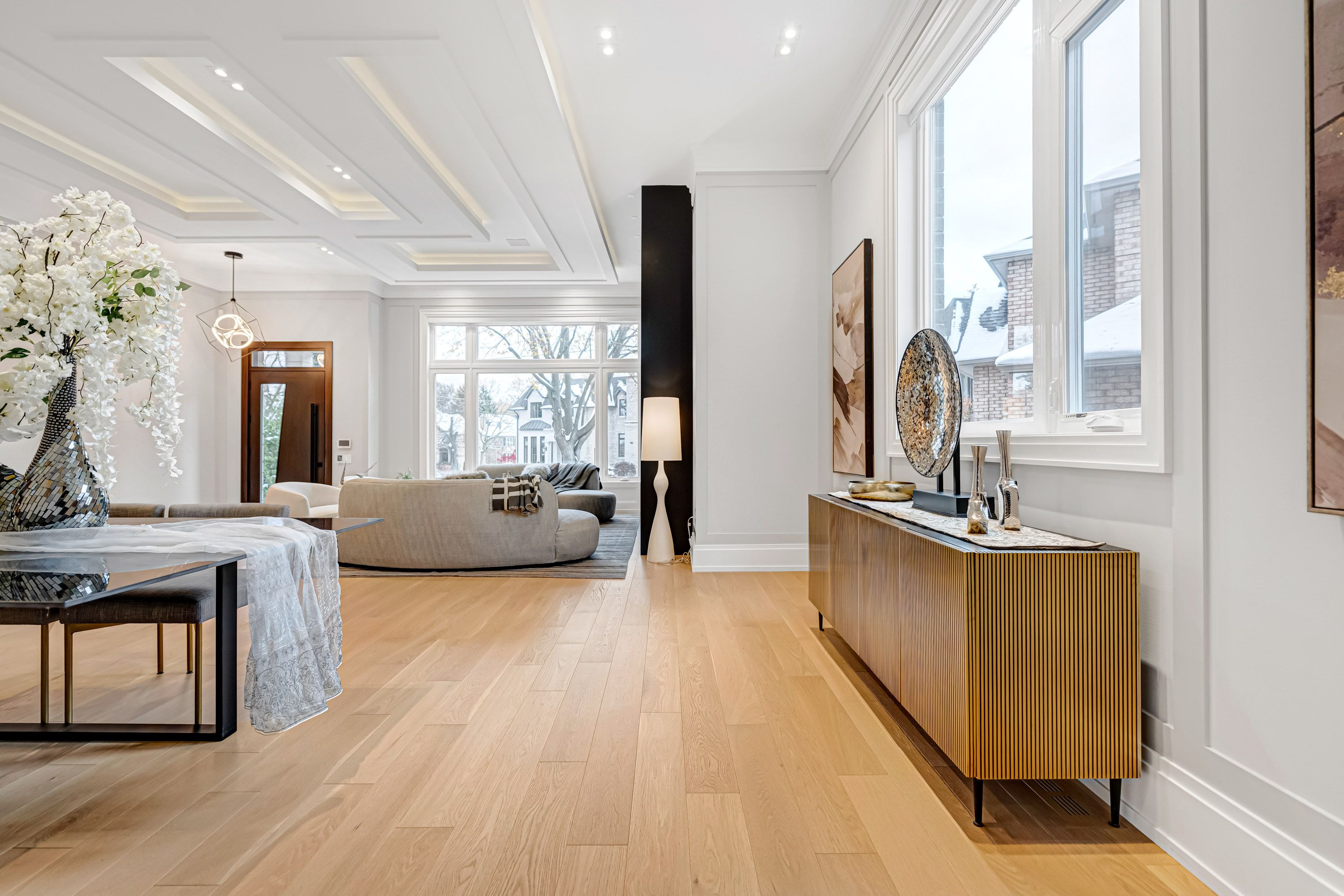 • Bright living space features floor-to-ceiling windows and high ceilings.