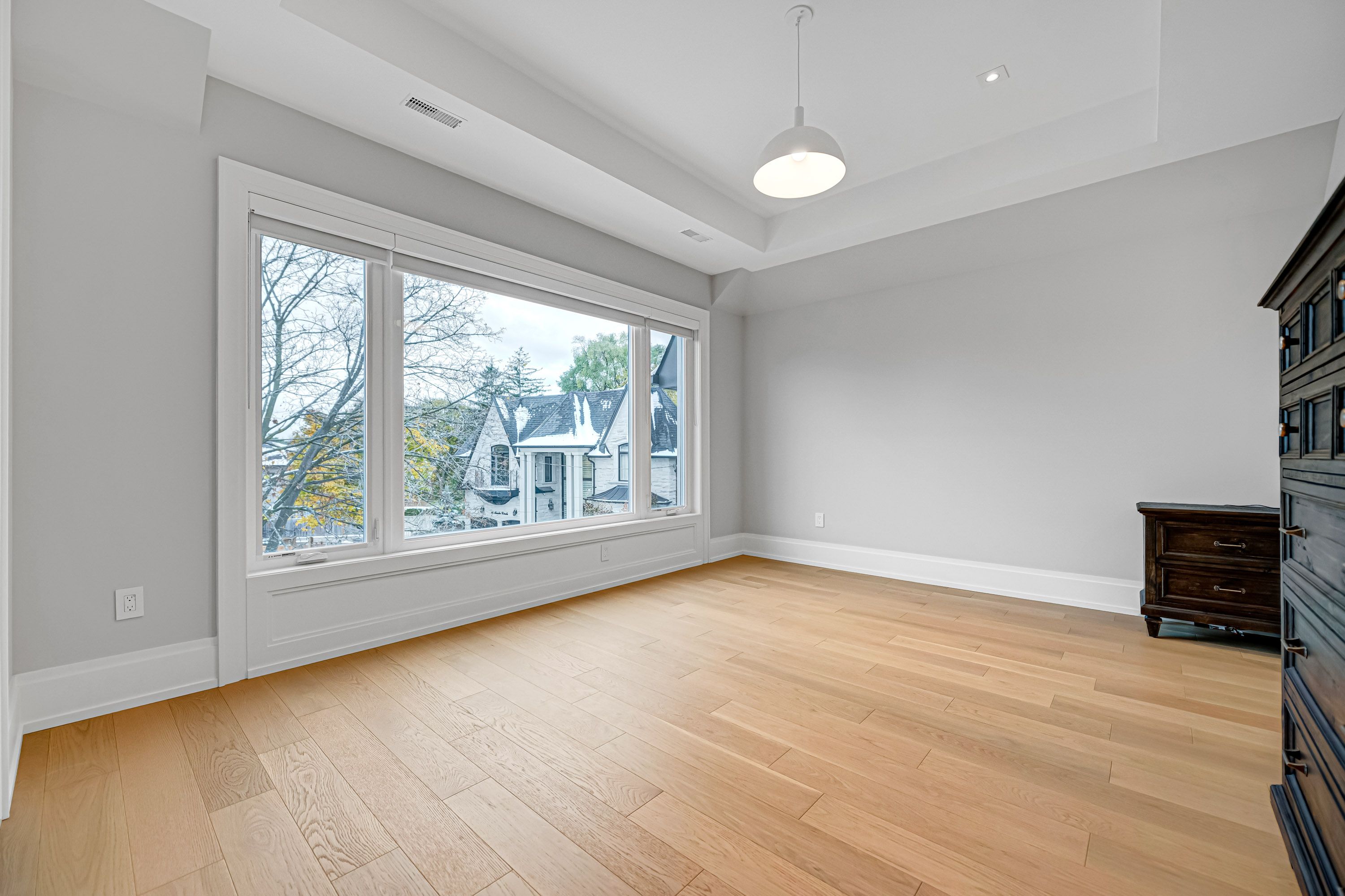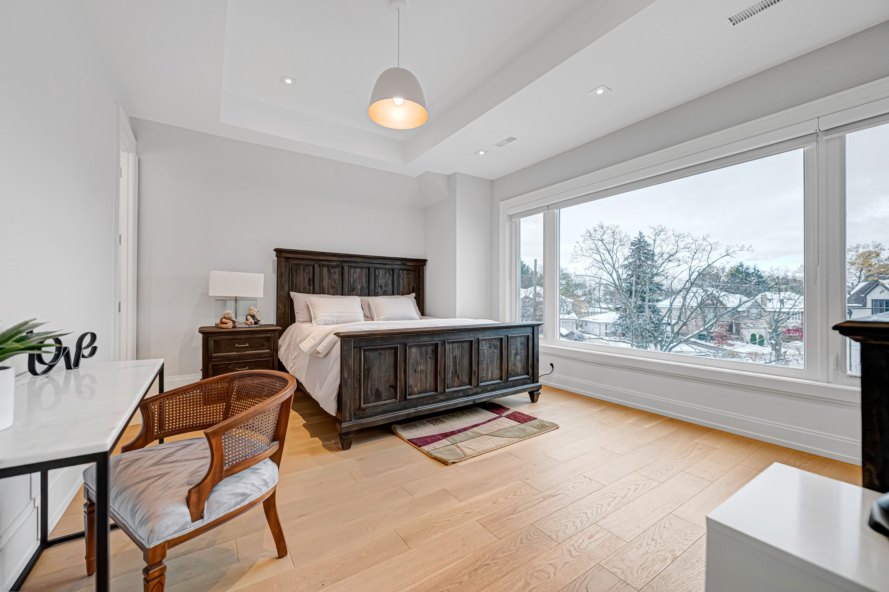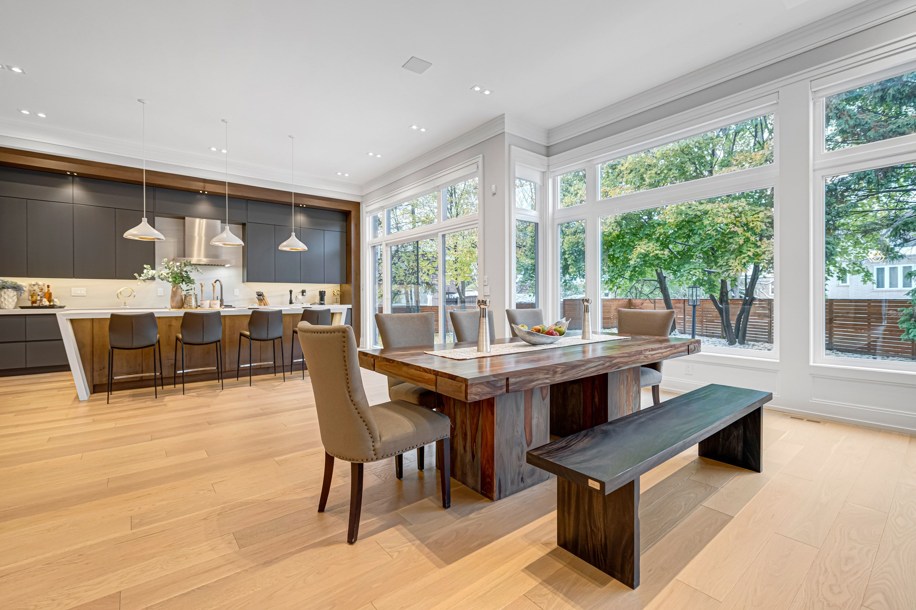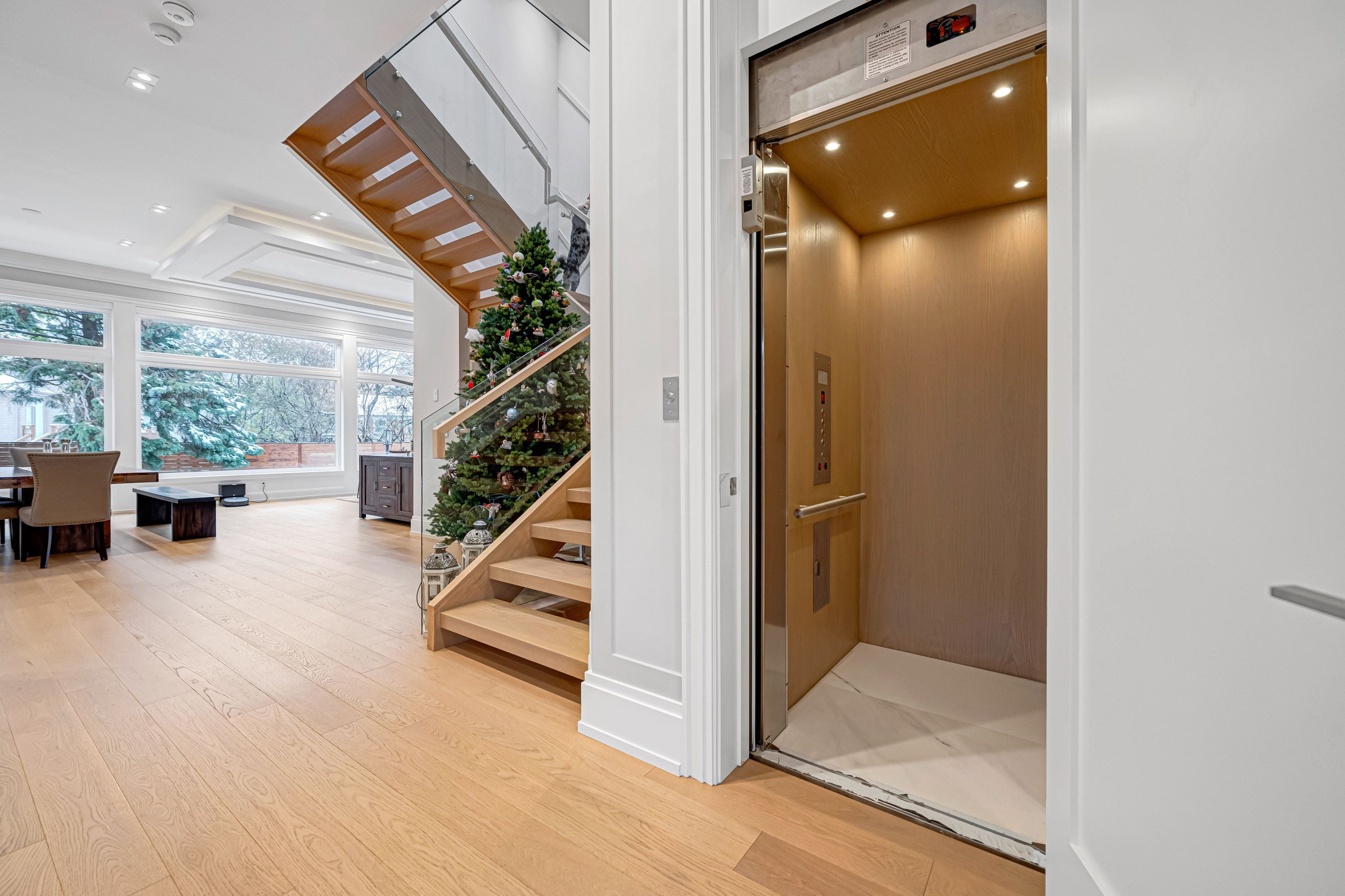 • Bright living space features floor-to-ceiling windows and high ceilings.
