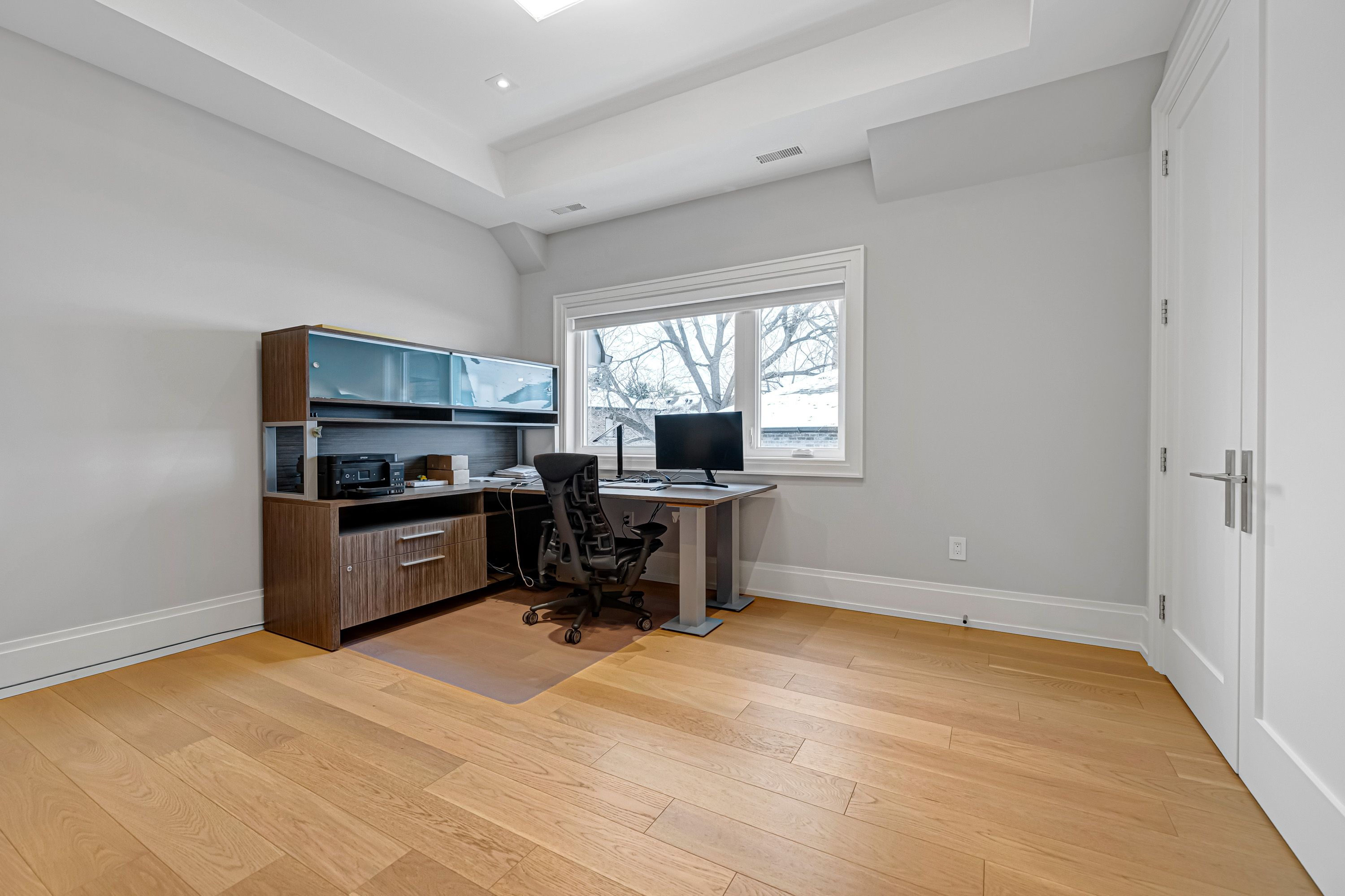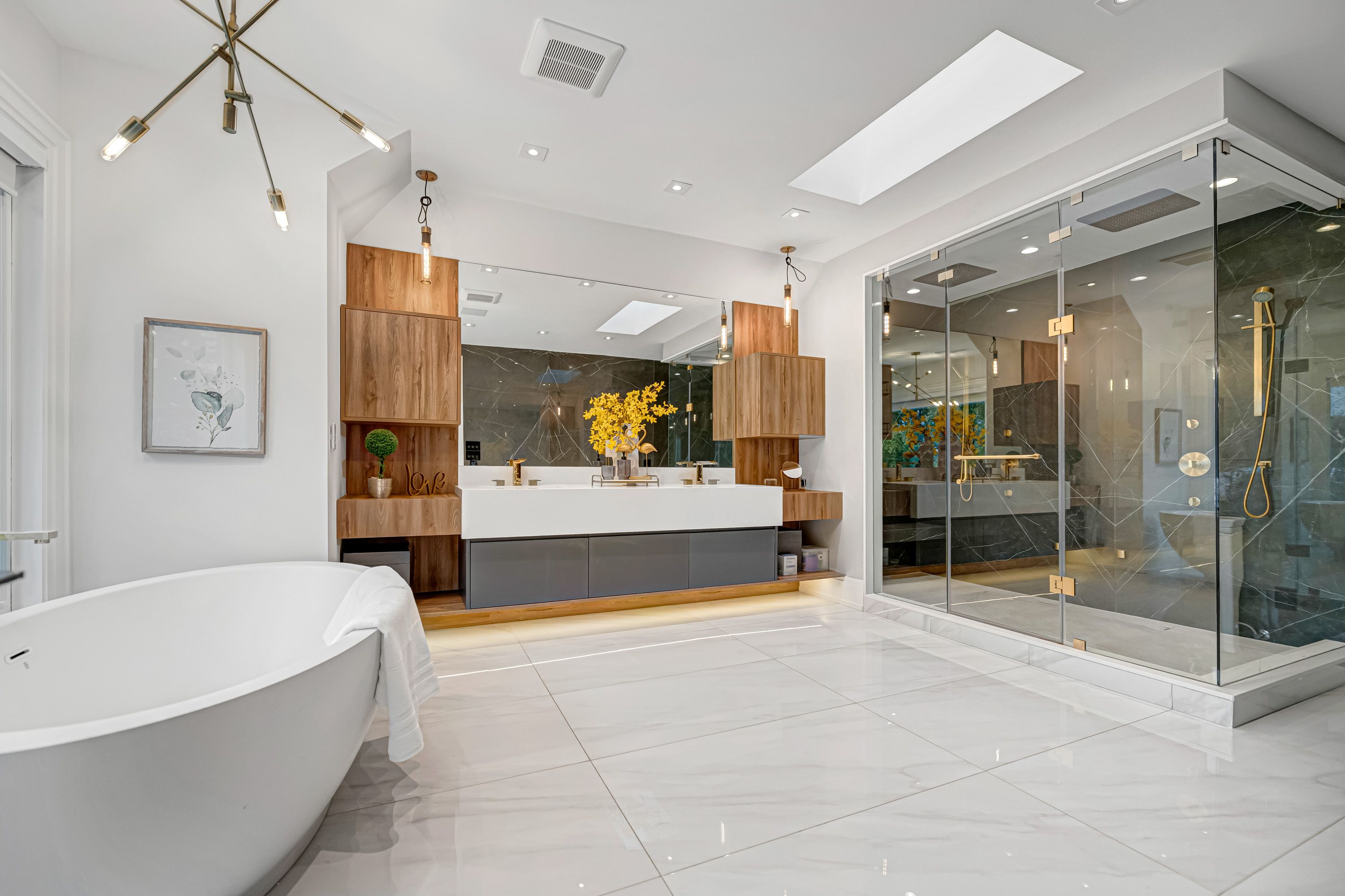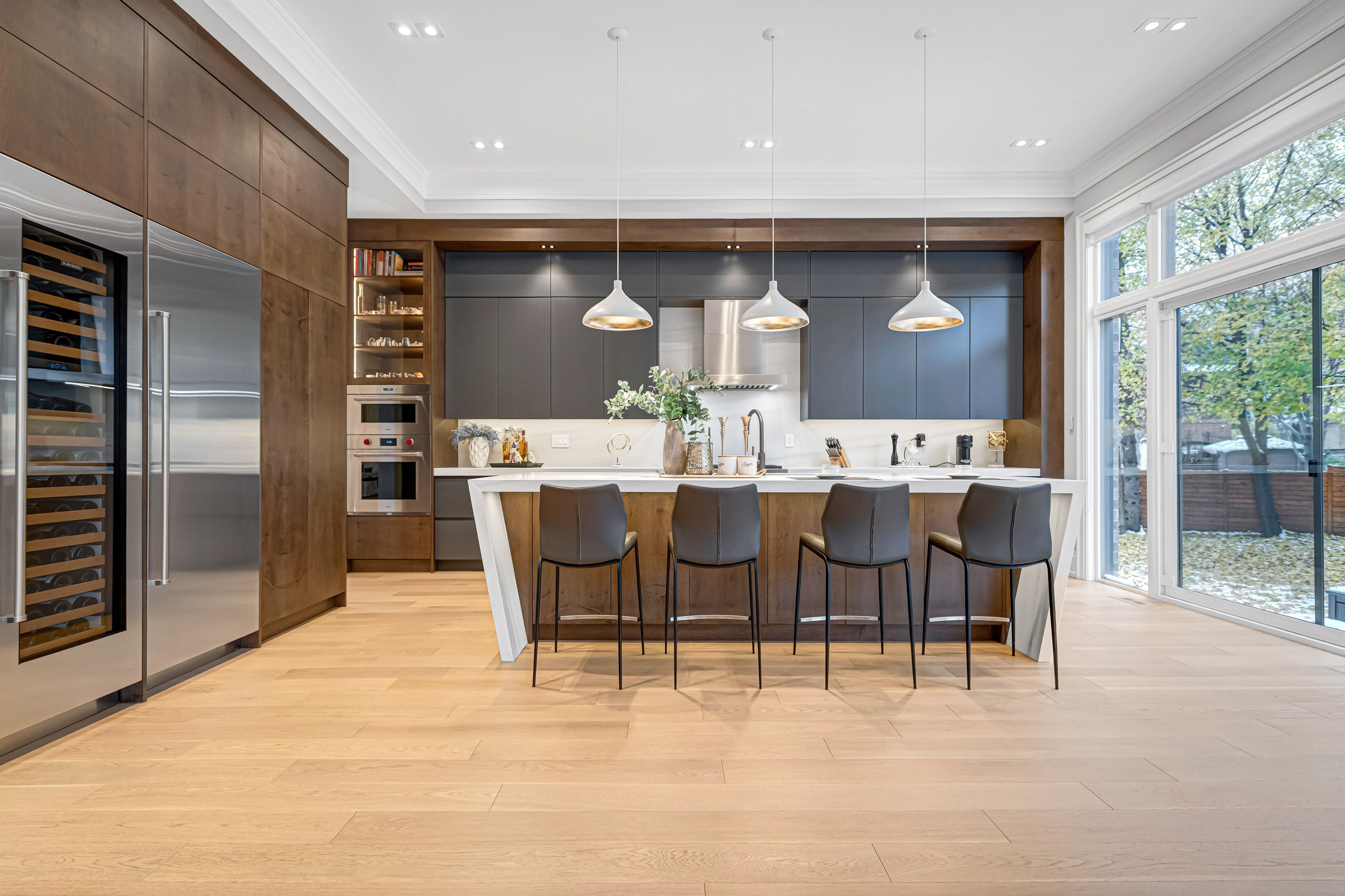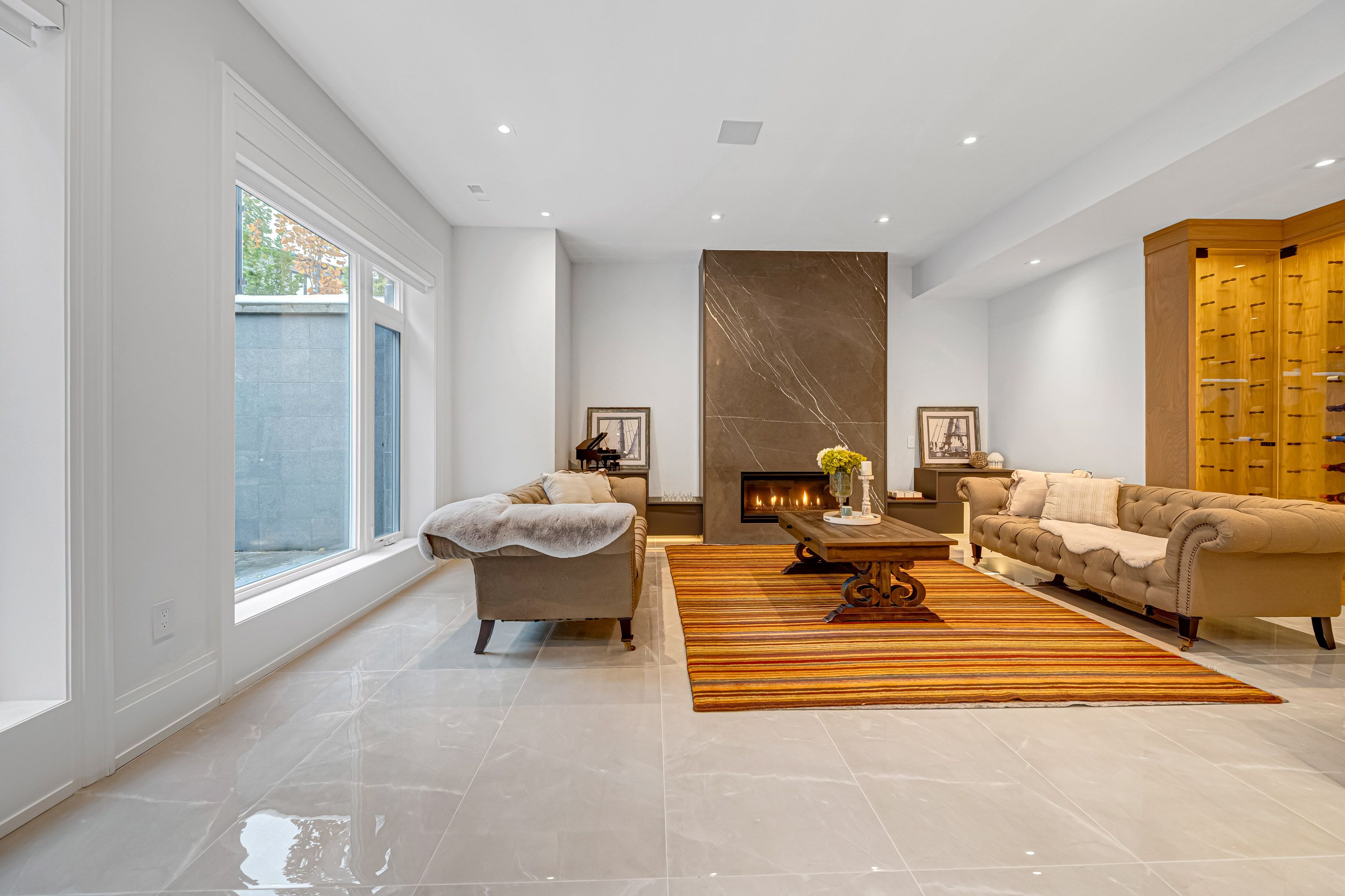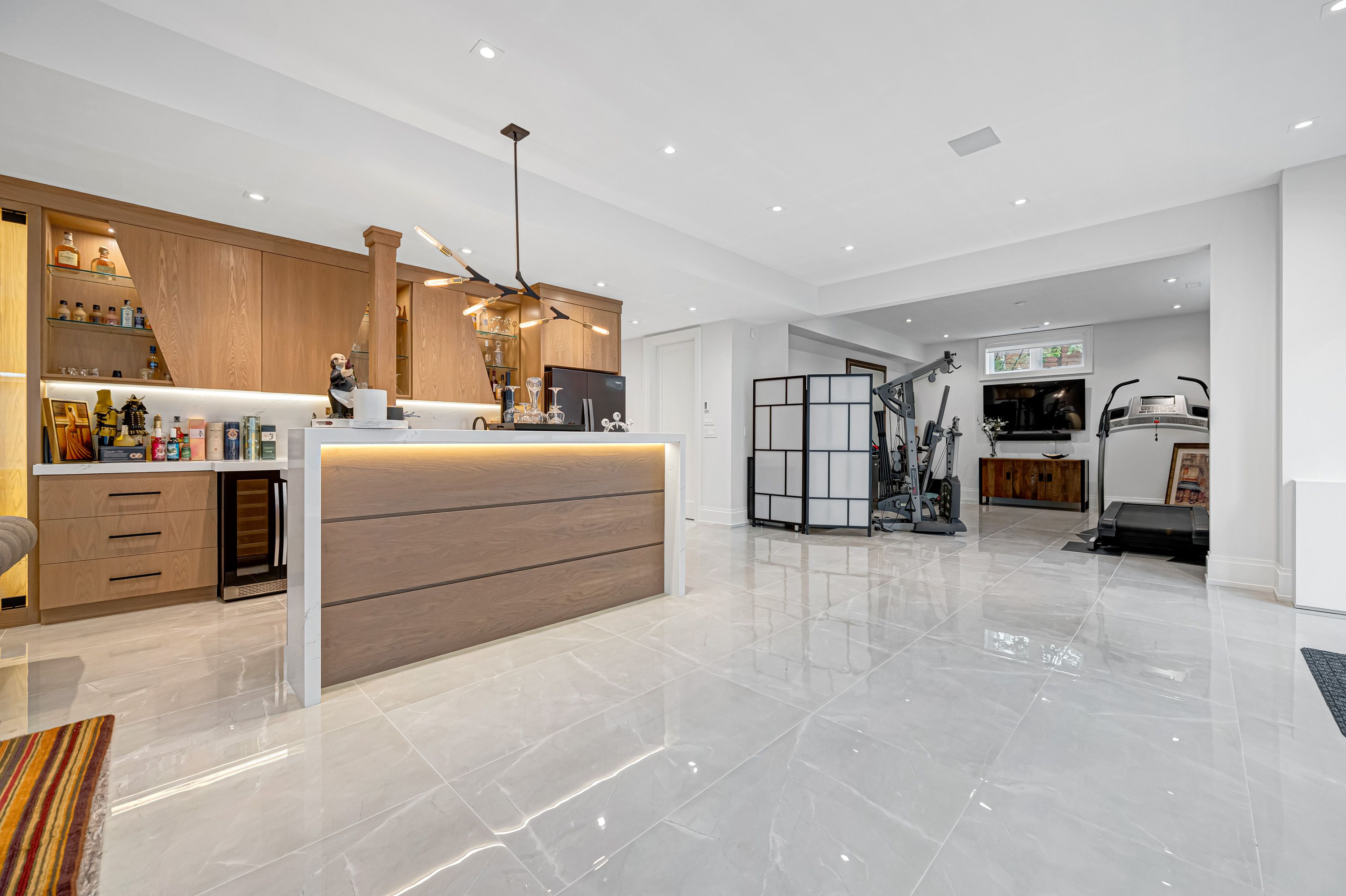 • Basement equipped with heated floors, gym, theater, and wet bar.