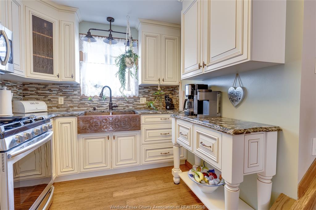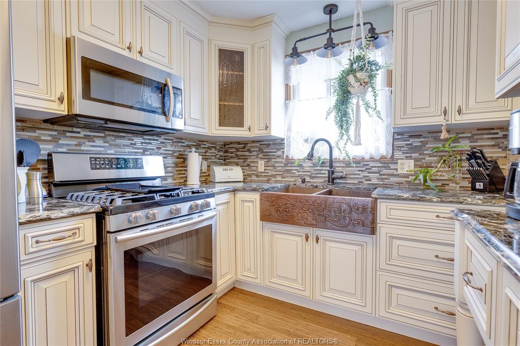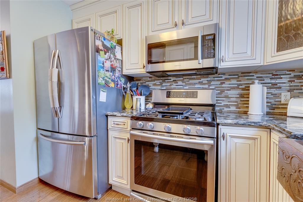 • Modern kitchen with quartz counters and stainless appliances, including a gas stove.