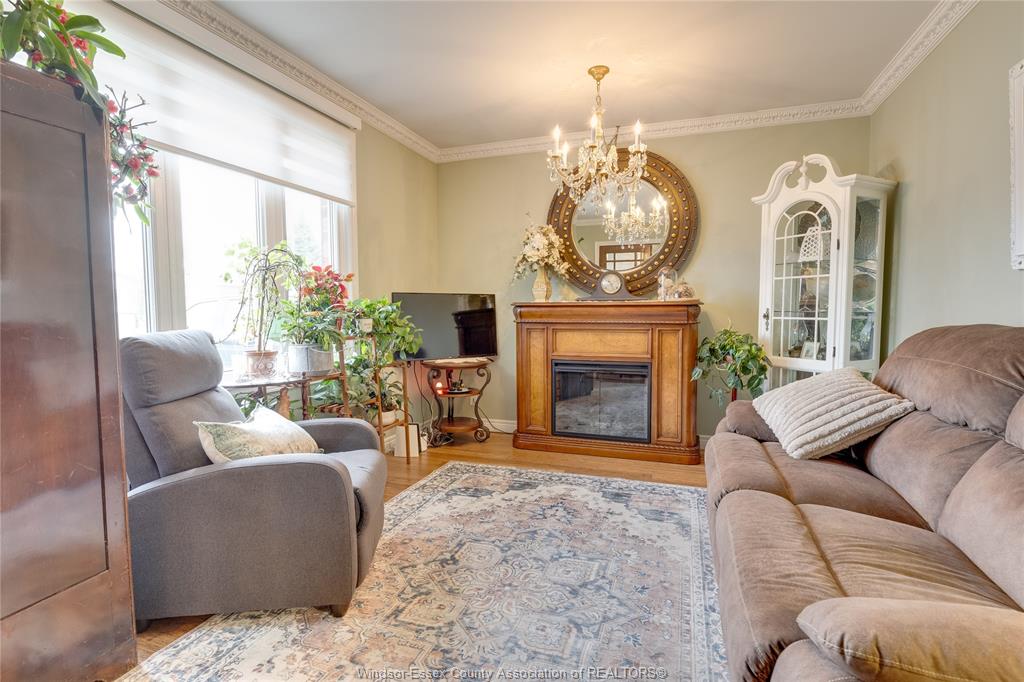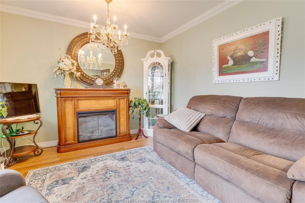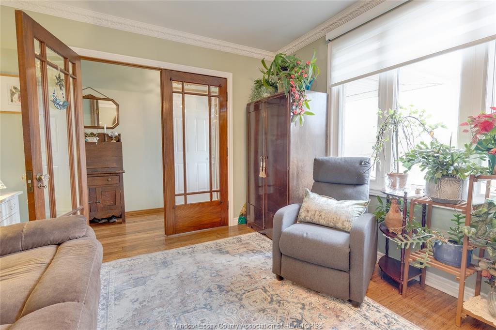 • Cozy family room featuring a gas fireplace and antique French doors.