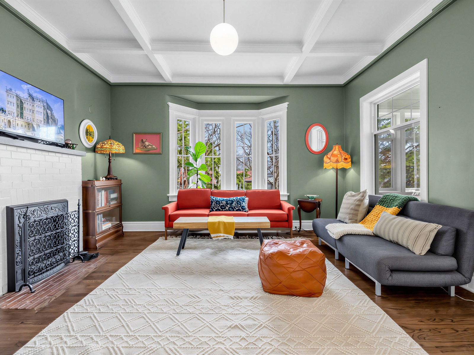 • Expansive living room with high ceilings and a gas fireplace.