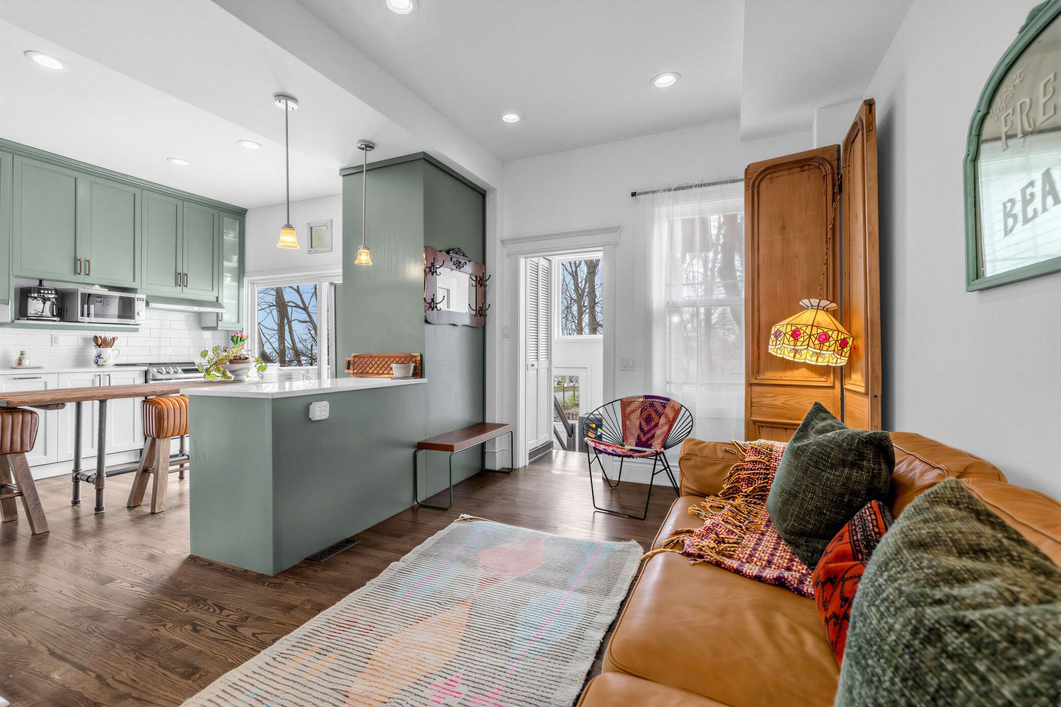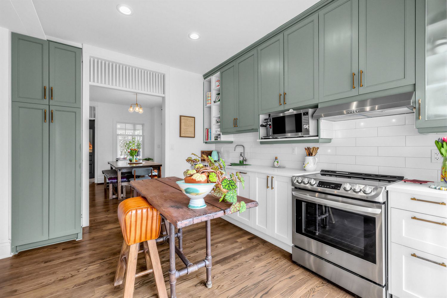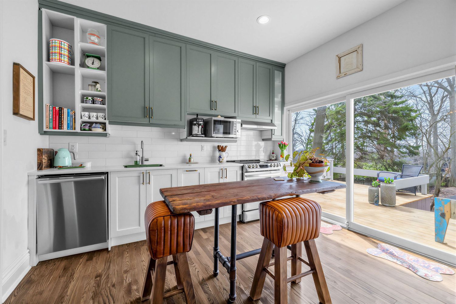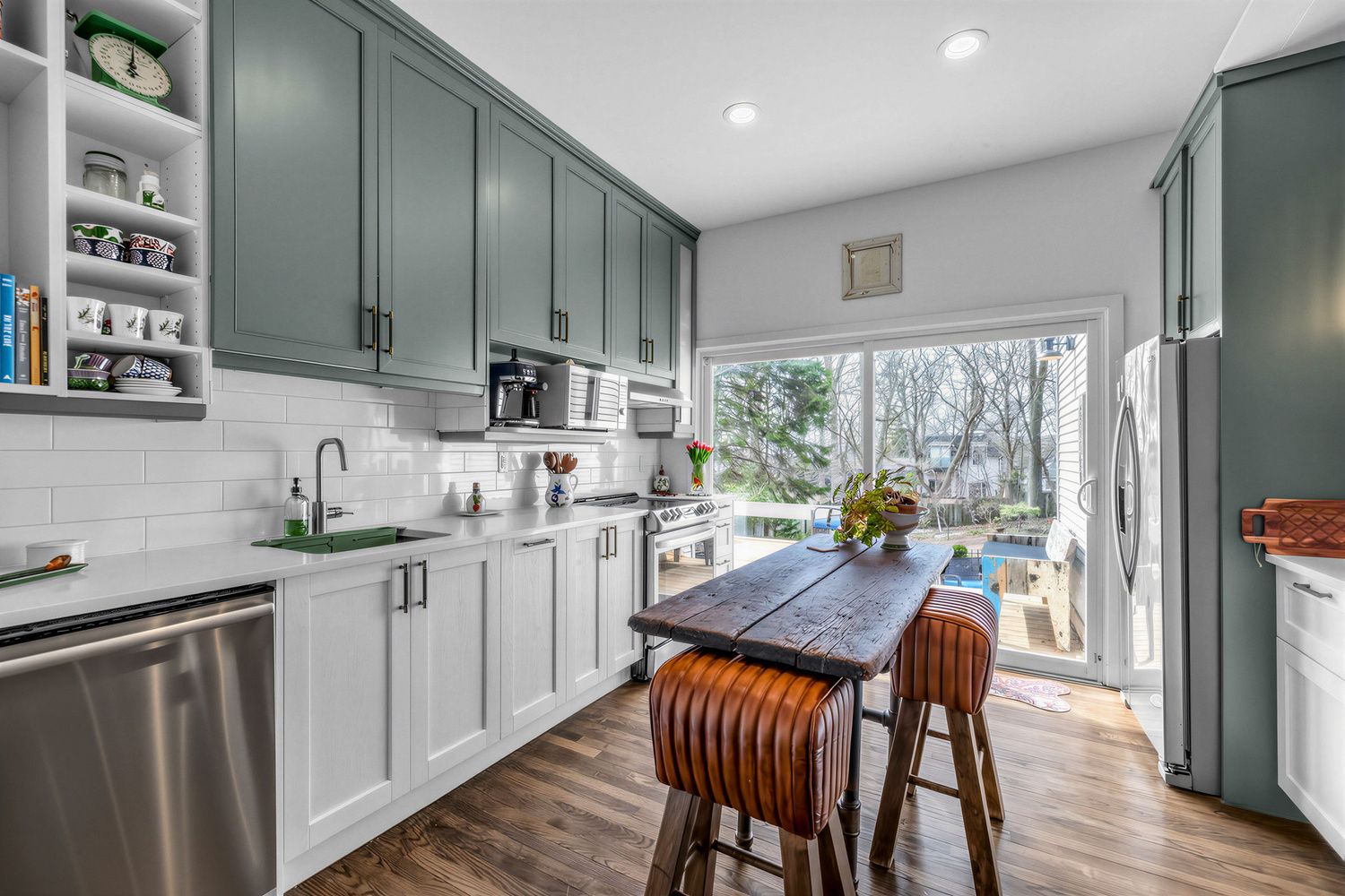 • Well-designed shaker-style kitchen overlooks a massive backyard for culinary inspiration.