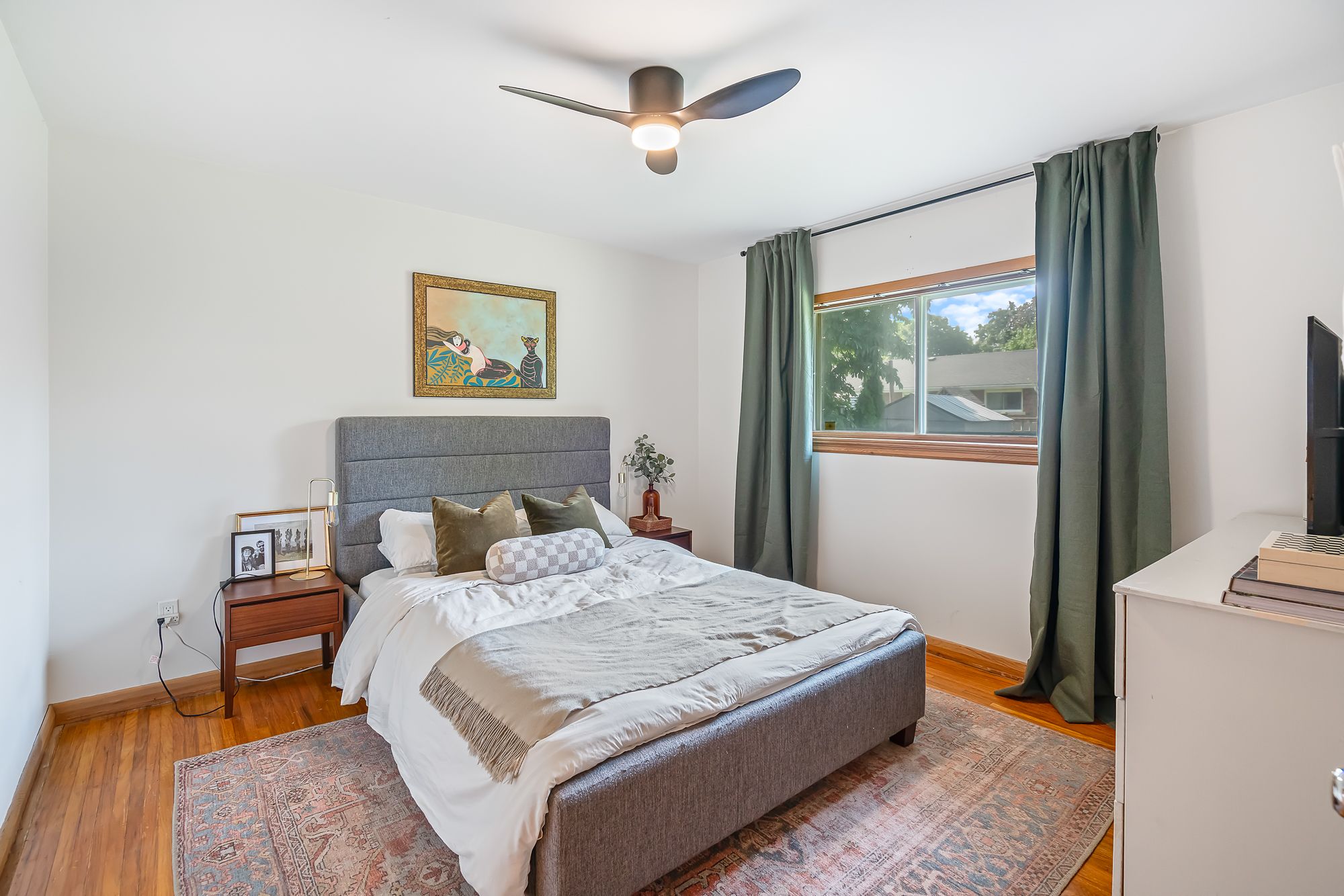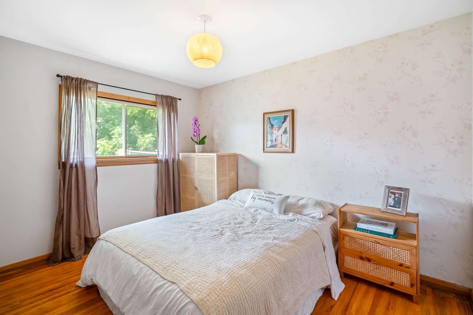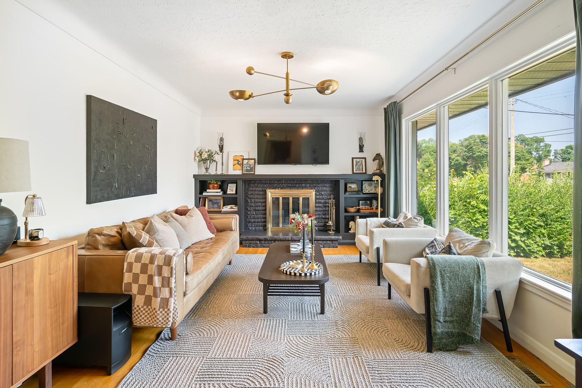 • Inviting living area with original hardwood floors and wood-burning fireplace.