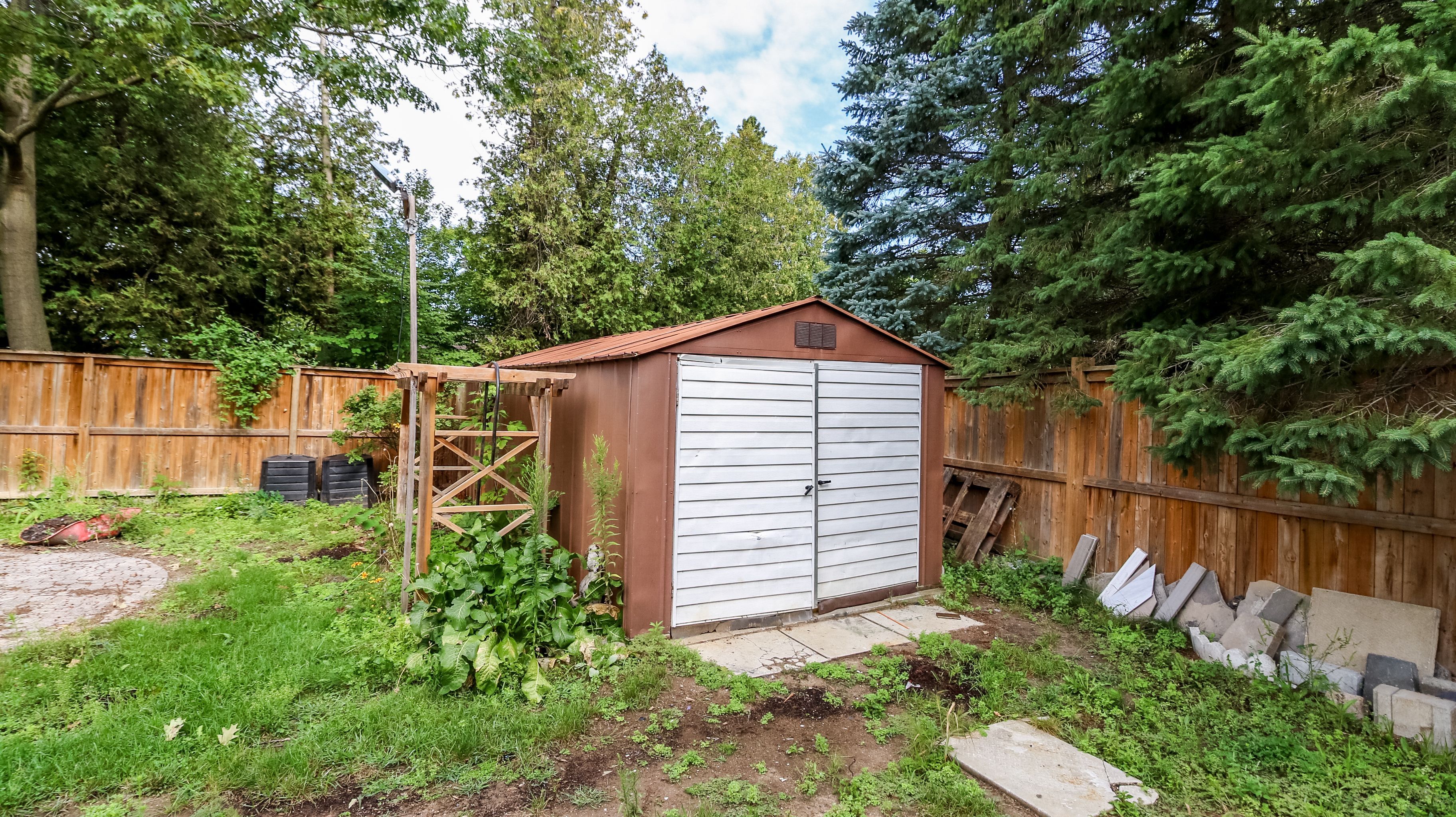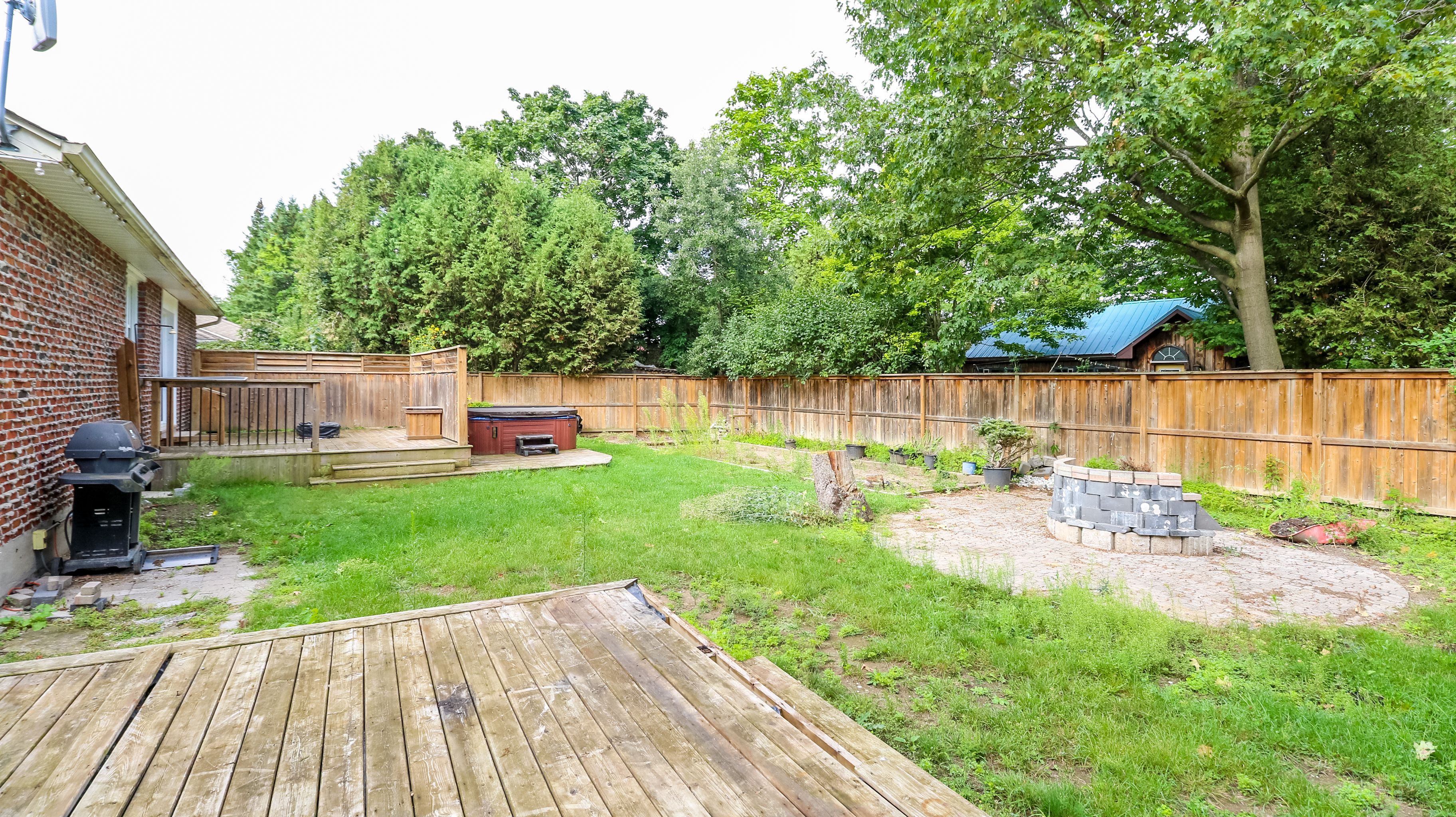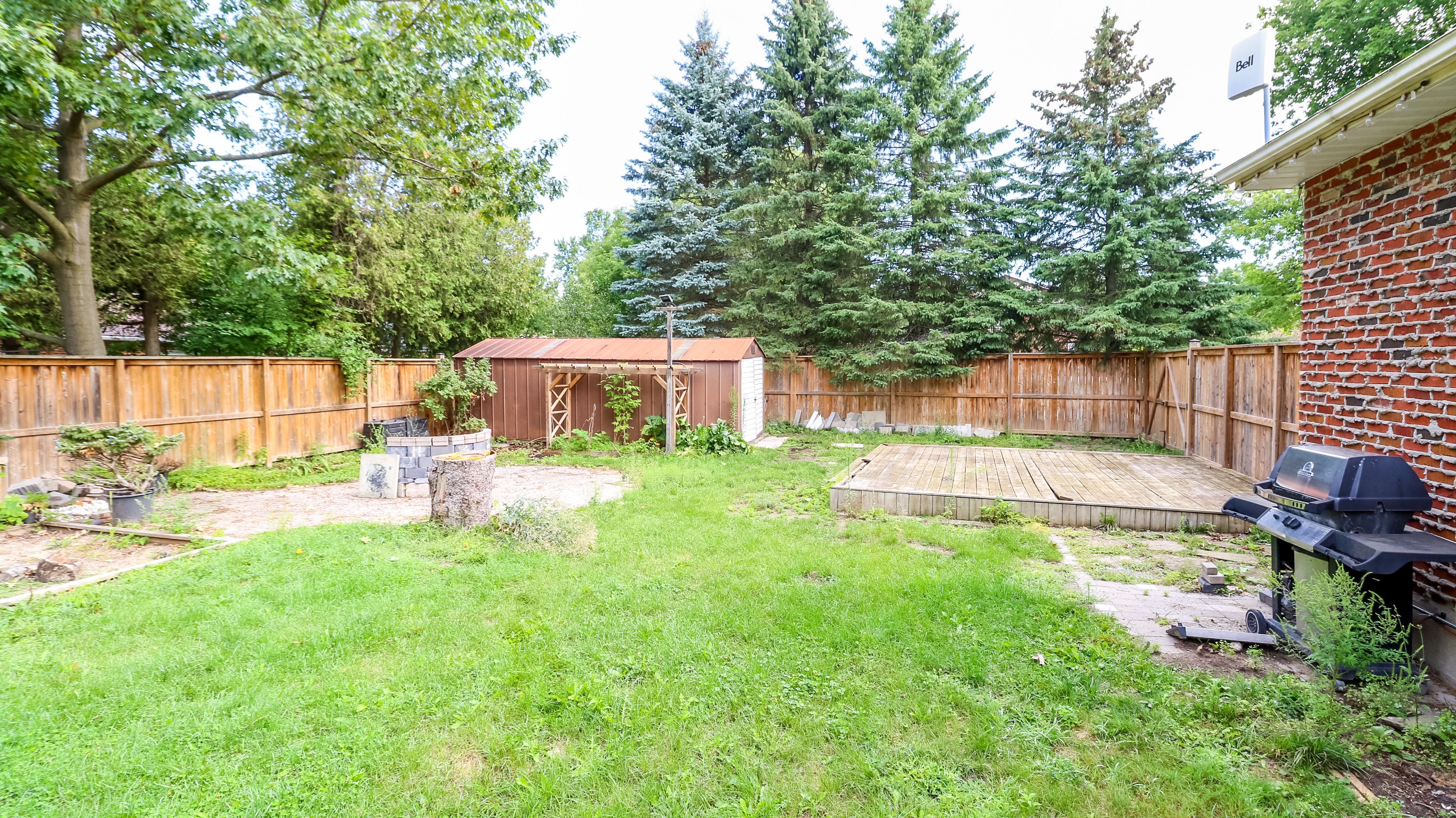• Spacious fenced backyard with two decks and a shed for outdoor use.