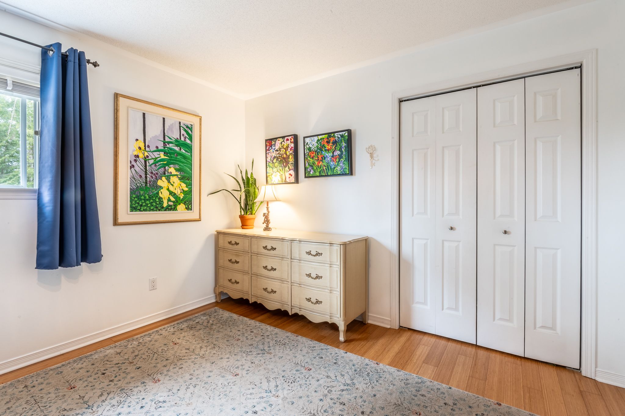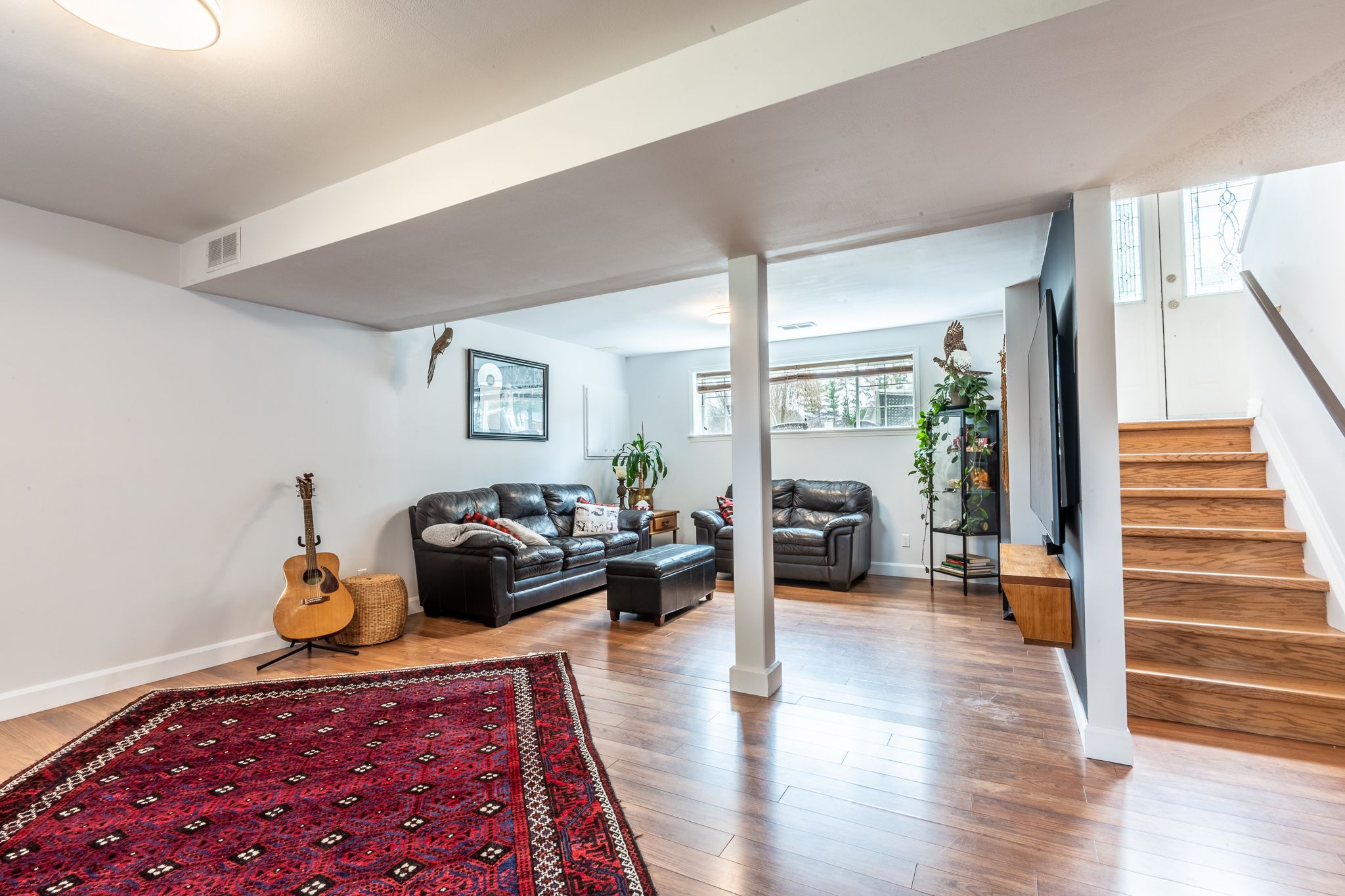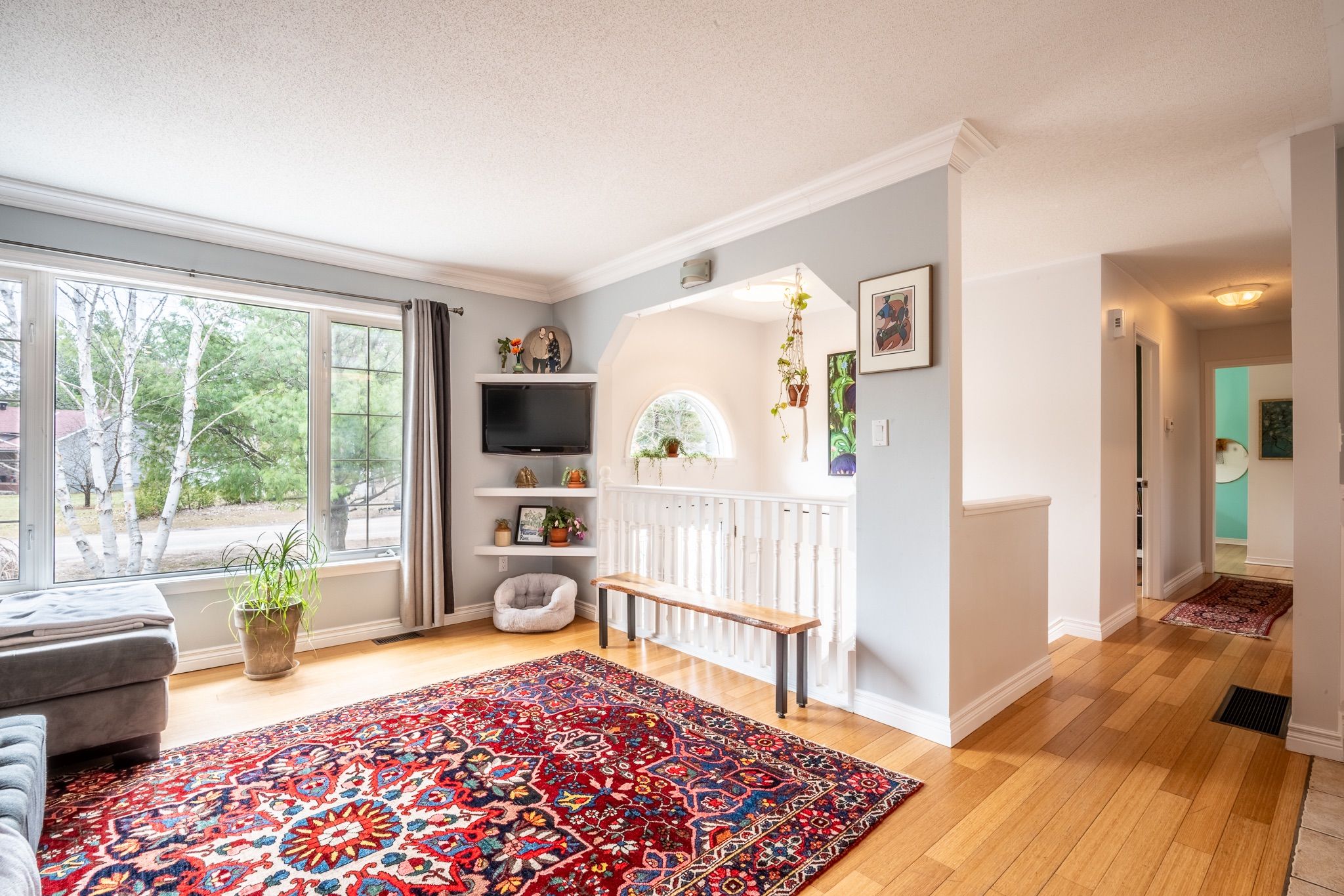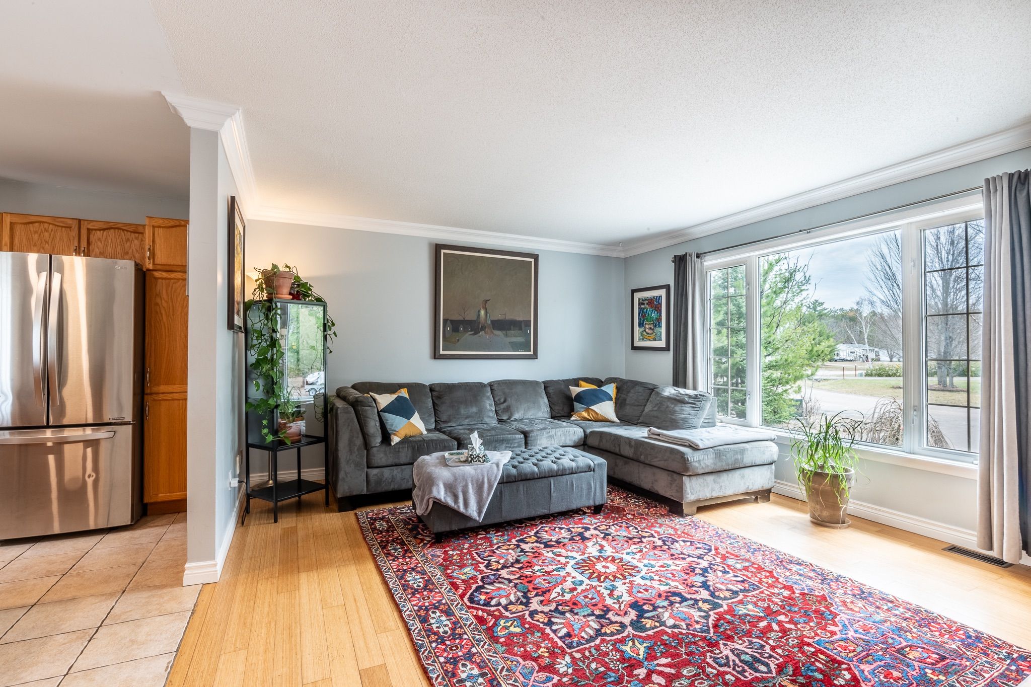 • Bright living room with large windows and bamboo flooring throughout.