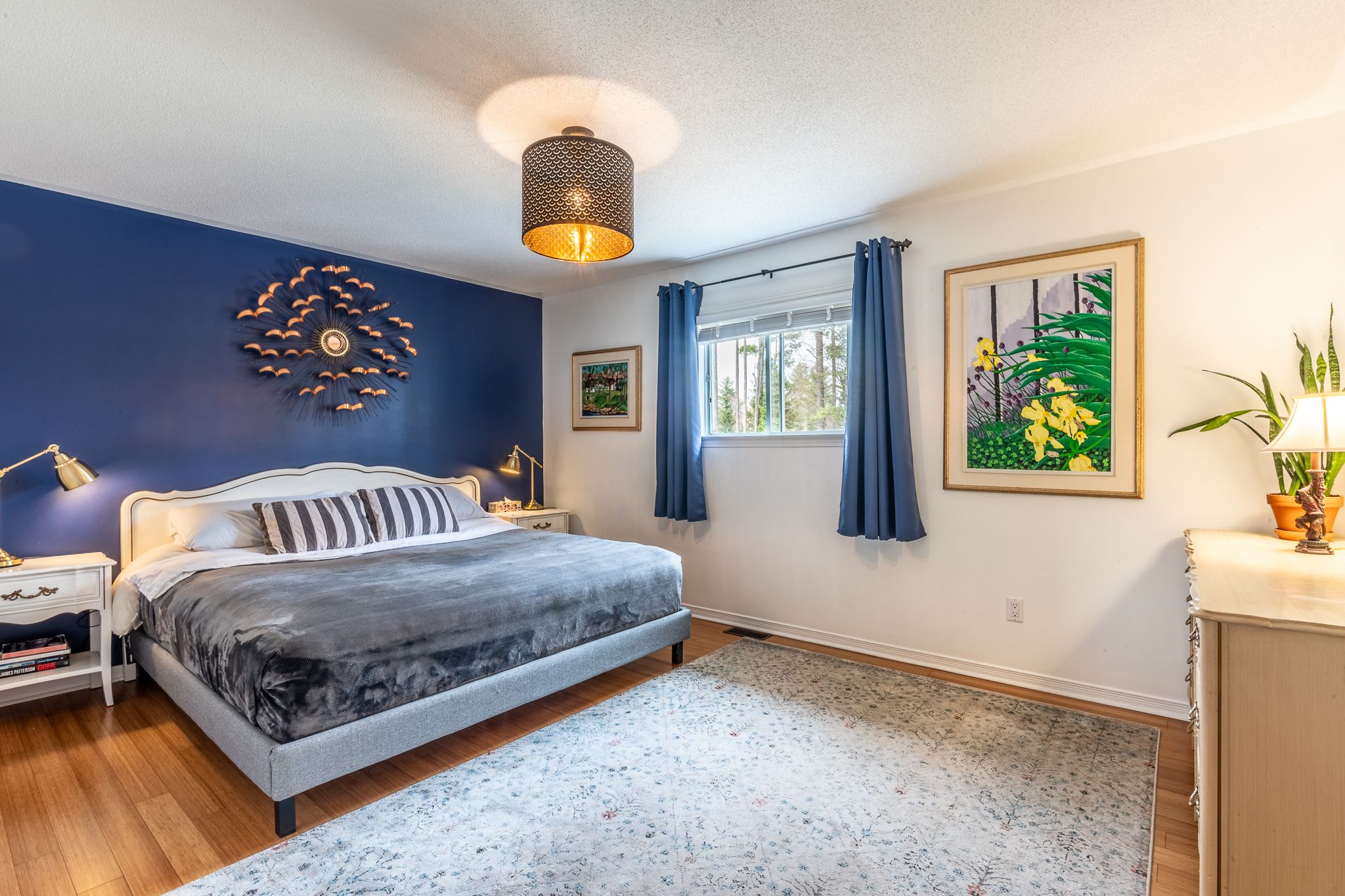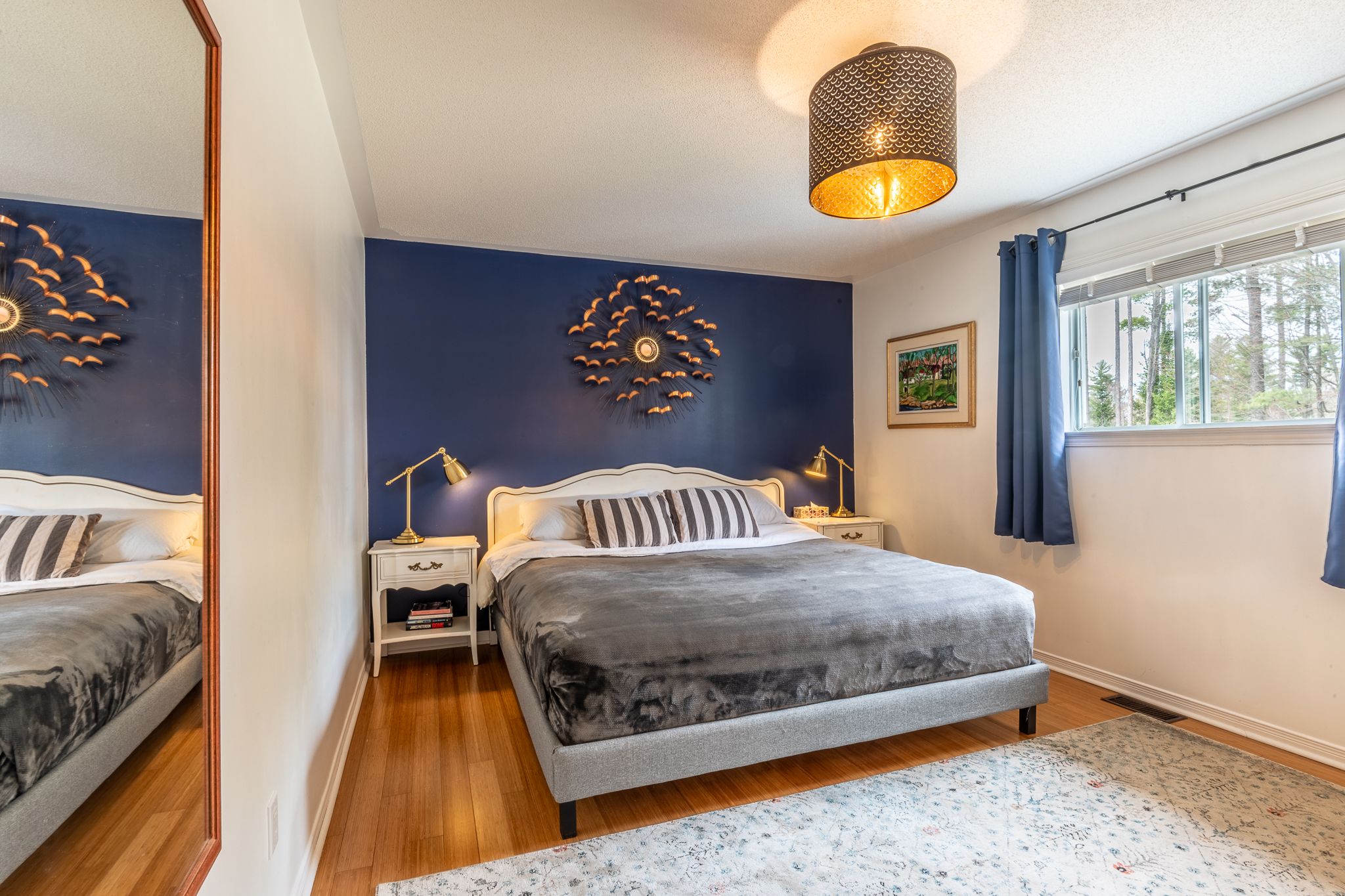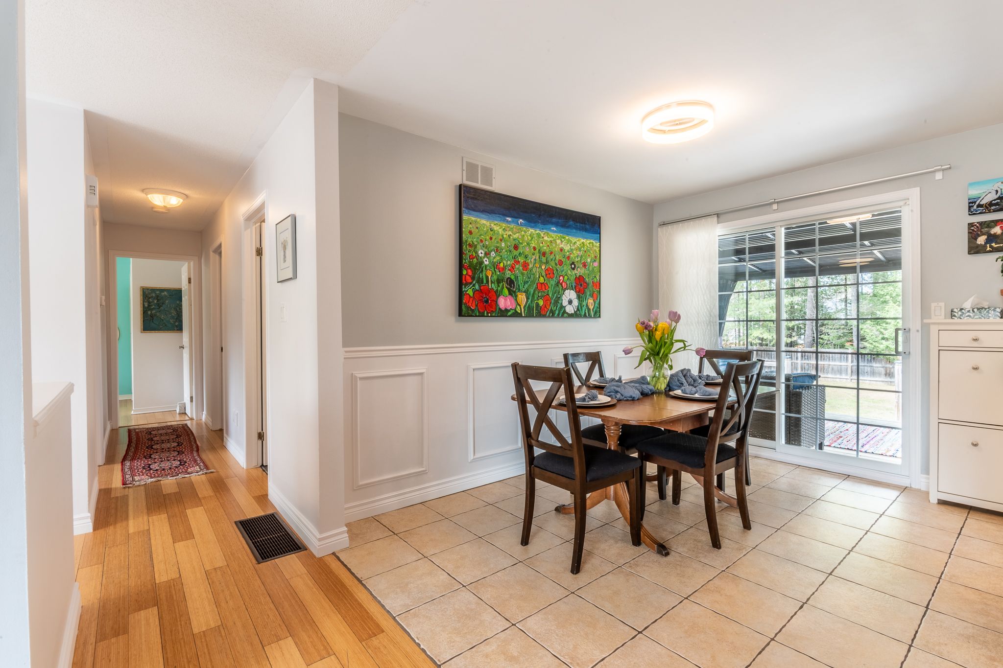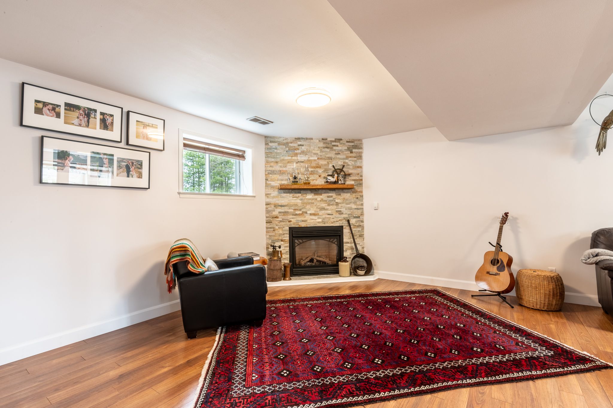 • Bright living room with large windows and bamboo flooring throughout.
