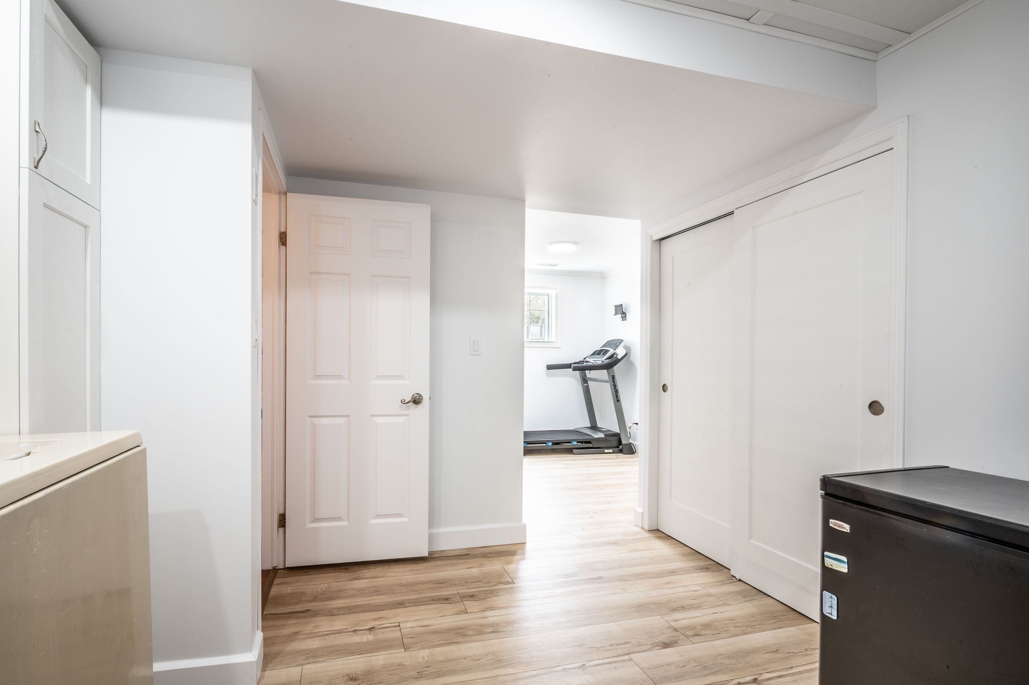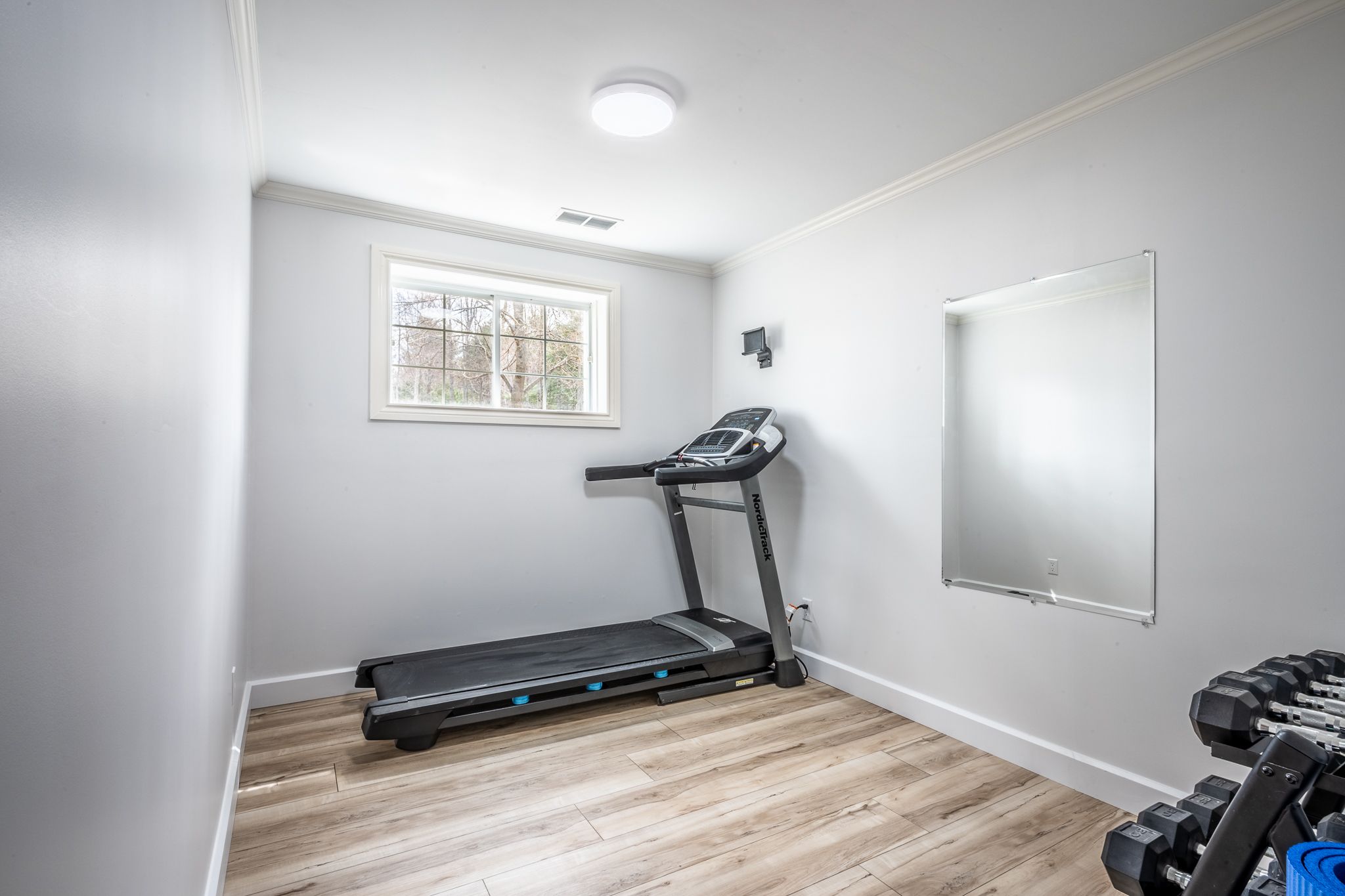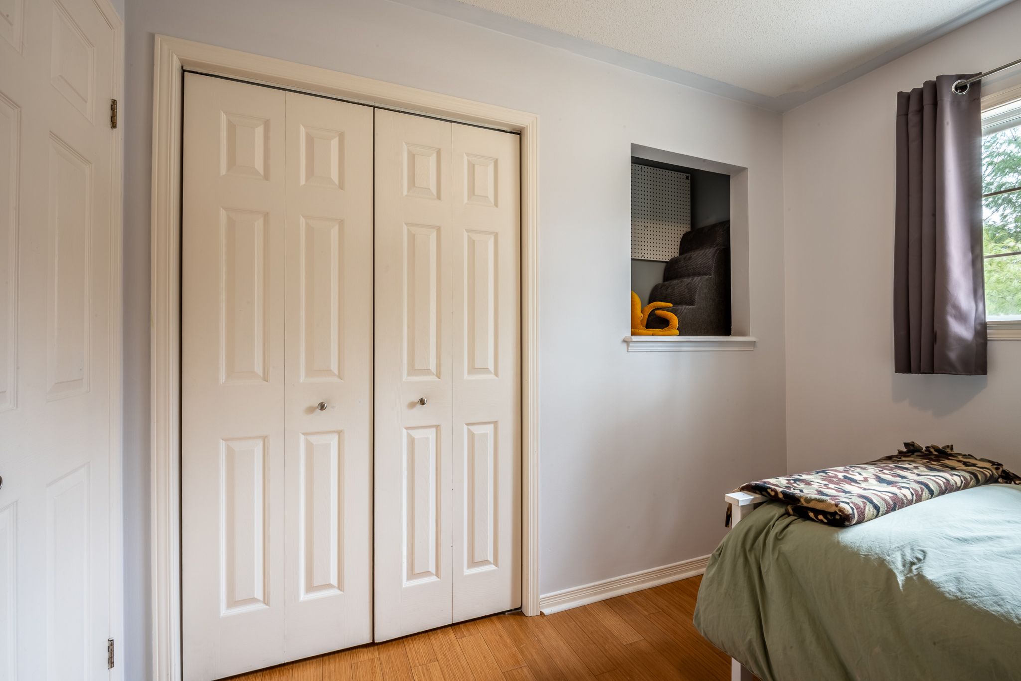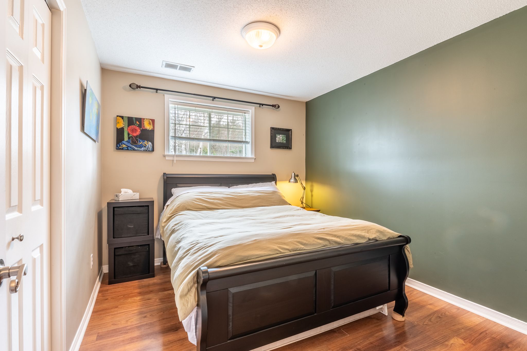 • Bright living room with large windows and bamboo flooring throughout.