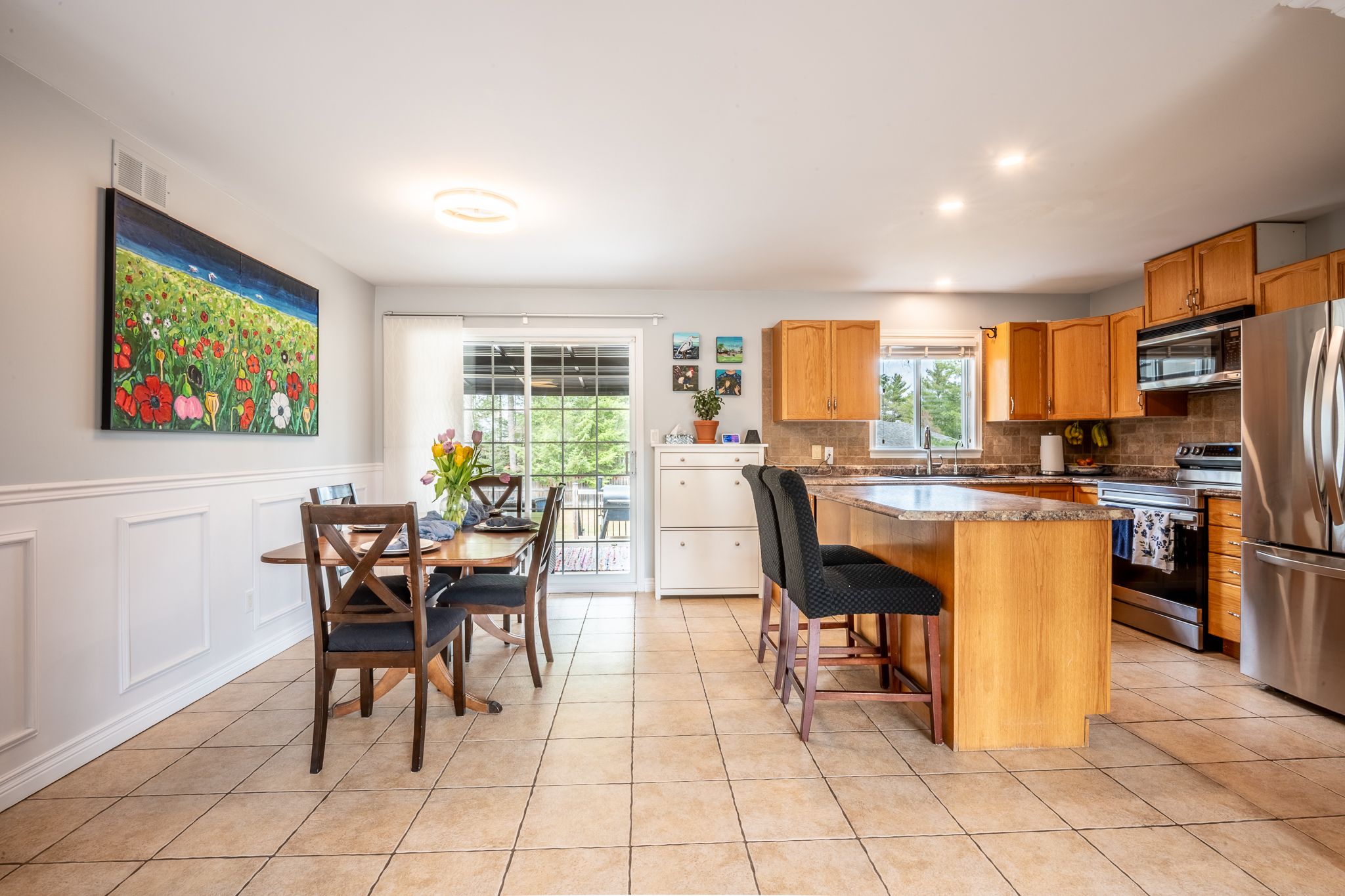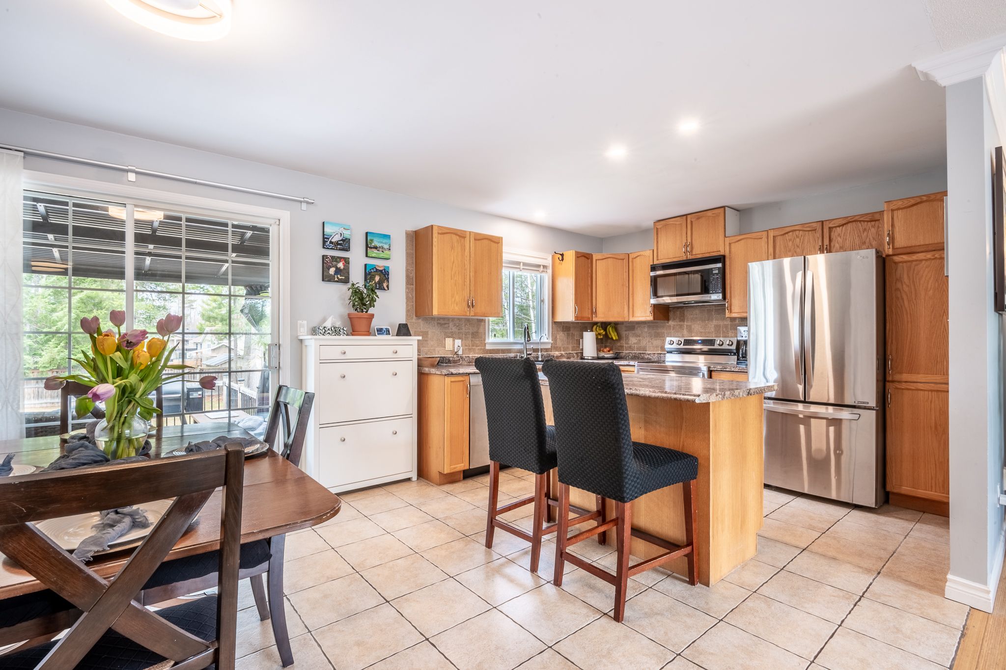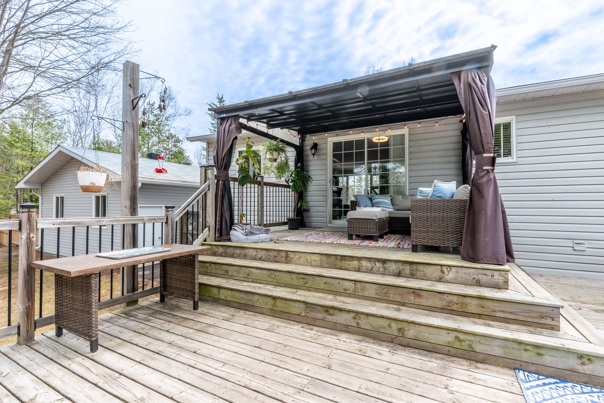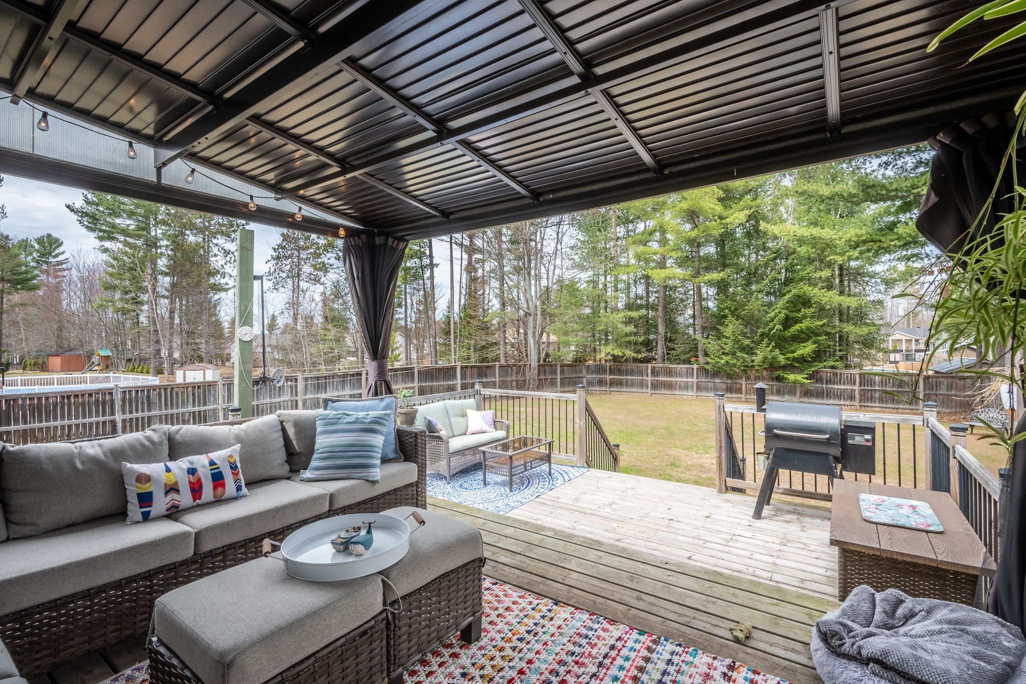 • Spacious dining area leading to a two-tier deck with a pergola.