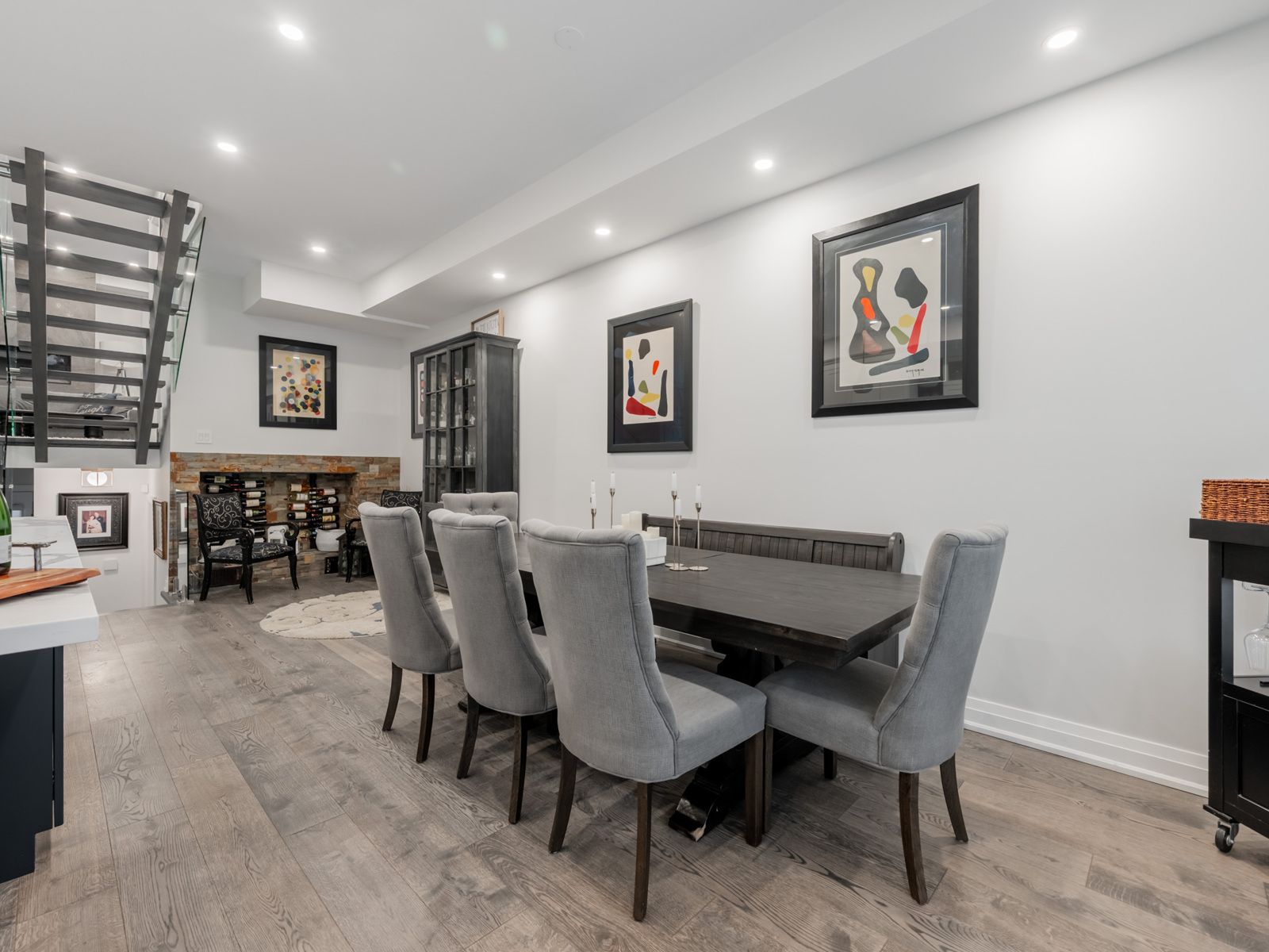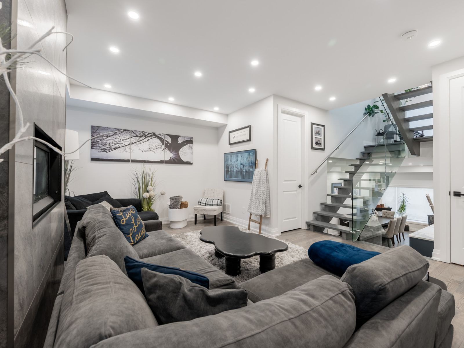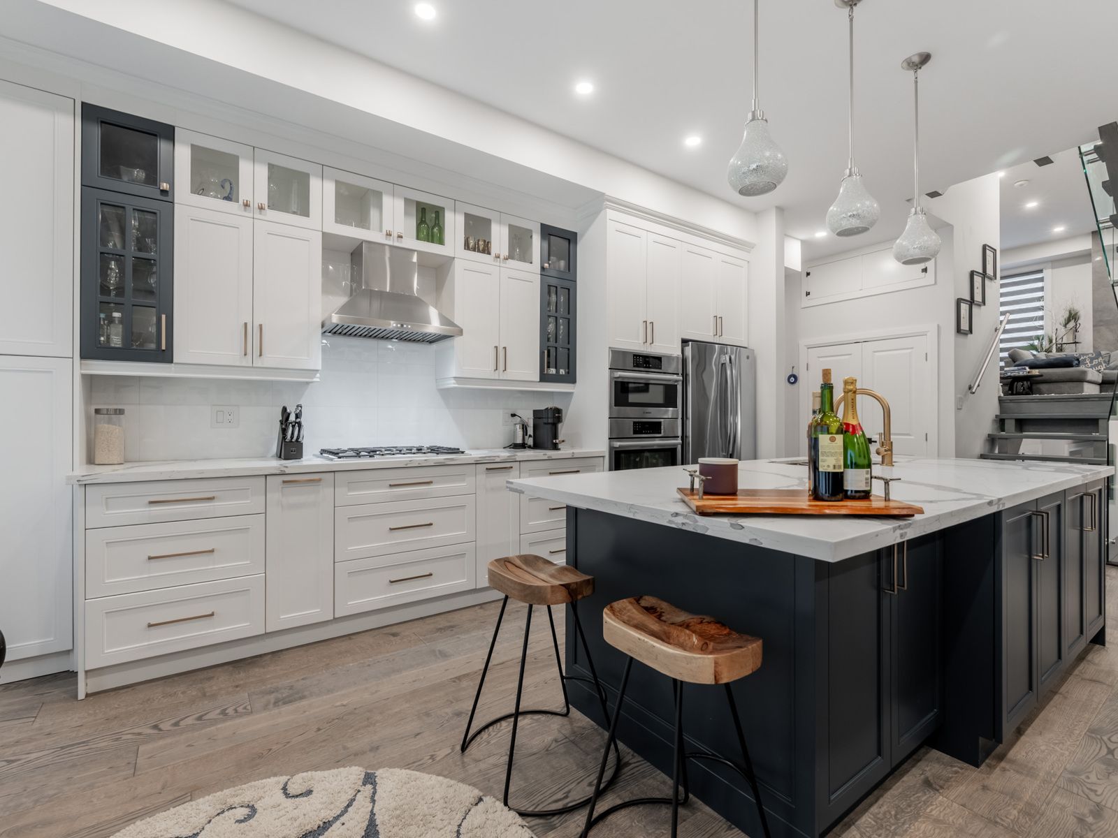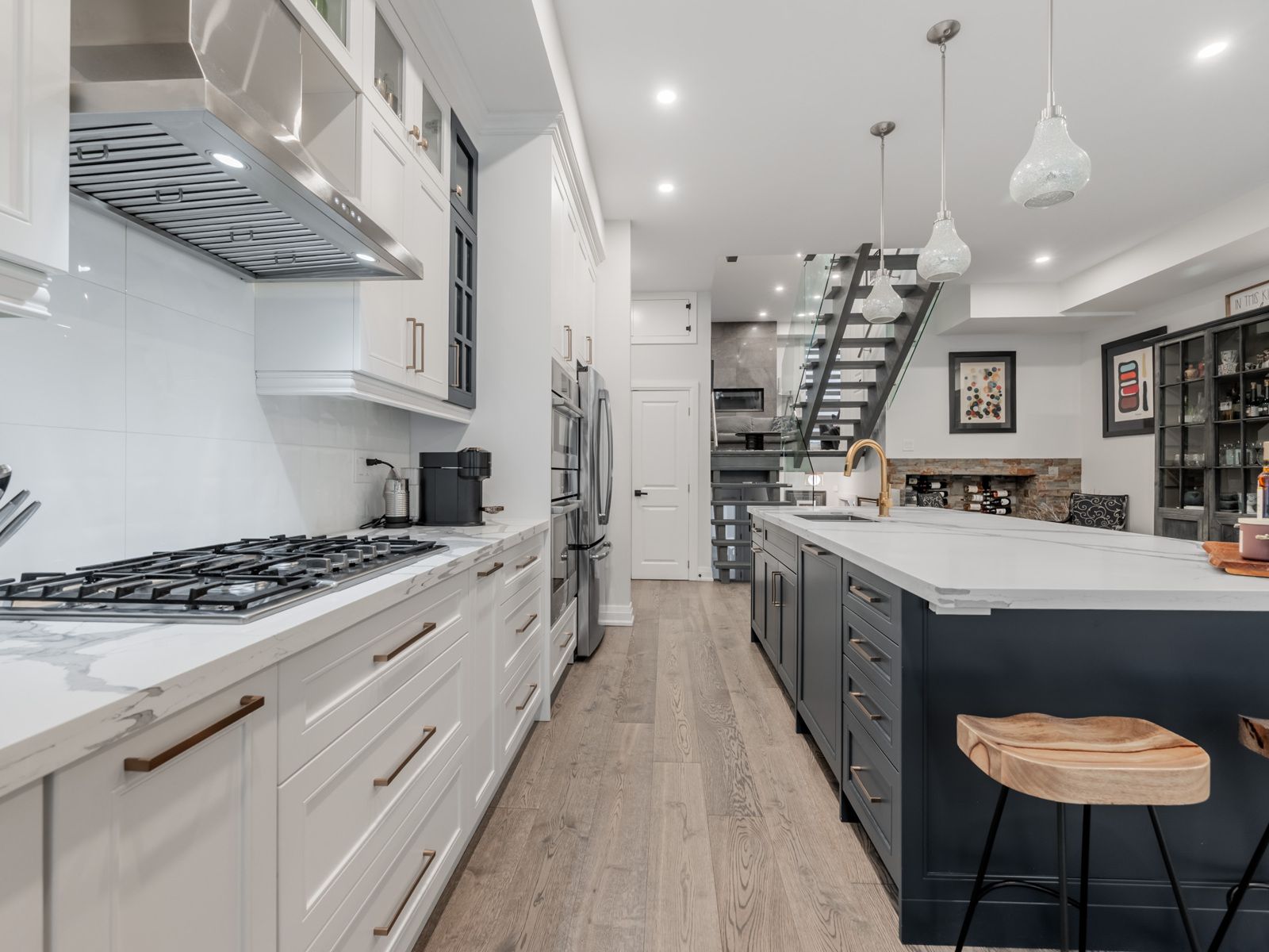 Custom-built luxury residence, offering exceptional craftsmanship, modern elegance, and premium finishes throughout. This sun-filled home with soaring ceilings features an open-concept main floor with wide-plank hardwood flooring, recessed lighting, and a dramatic glass staircase with open risers. The chef's kitchen is a true showpiece with custom two-tone cabinetry, oversized quartz island & breakfast bar, built-in stainless steel appliances, gas cooktop, professional hood fan, designer pendant lighting, and brushed gold hardware. Seamless flow into the dining and living areas makes this home ideal for entertaining. The family room is anchored by a sleek on contemporary fireplace feature wall and expansive windows with modern zebra blinds. A grand foyer welcomes you with oversized porcelain tile, custom built-in cabinetry/bench and designer lighting. The primary retreat offers a tray ceiling, spa-inspired ensuite, and walk-in closet with boutique-style built-ins. Bathrooms feature floating vanities, statement mirrors, and upscale fixtures. Five generously sized bedrooms provide space for family, guests, and home office use. Premium finishes continue throughout with custom millwork, and thoughtful architectural details. Striking modern exterior with exceptional curb appeal completes this rare offering of comfort, style, and sophistication. Additional features include large picture windows, zoned hvac powered by two furnaces and two ac units optimizing comfort and efficiency. Exterior soffit and inground lighting, inground sprinkler system, stone walkway, 10-13 foot ceilings, secondary kitchen in basement, oversized skylight and more. The home overlooks a sloping ravine with privacy, mature trees and beautiful vistas. Steps to transit, shopping, schools and more. Book a showing for this beautiful home today.