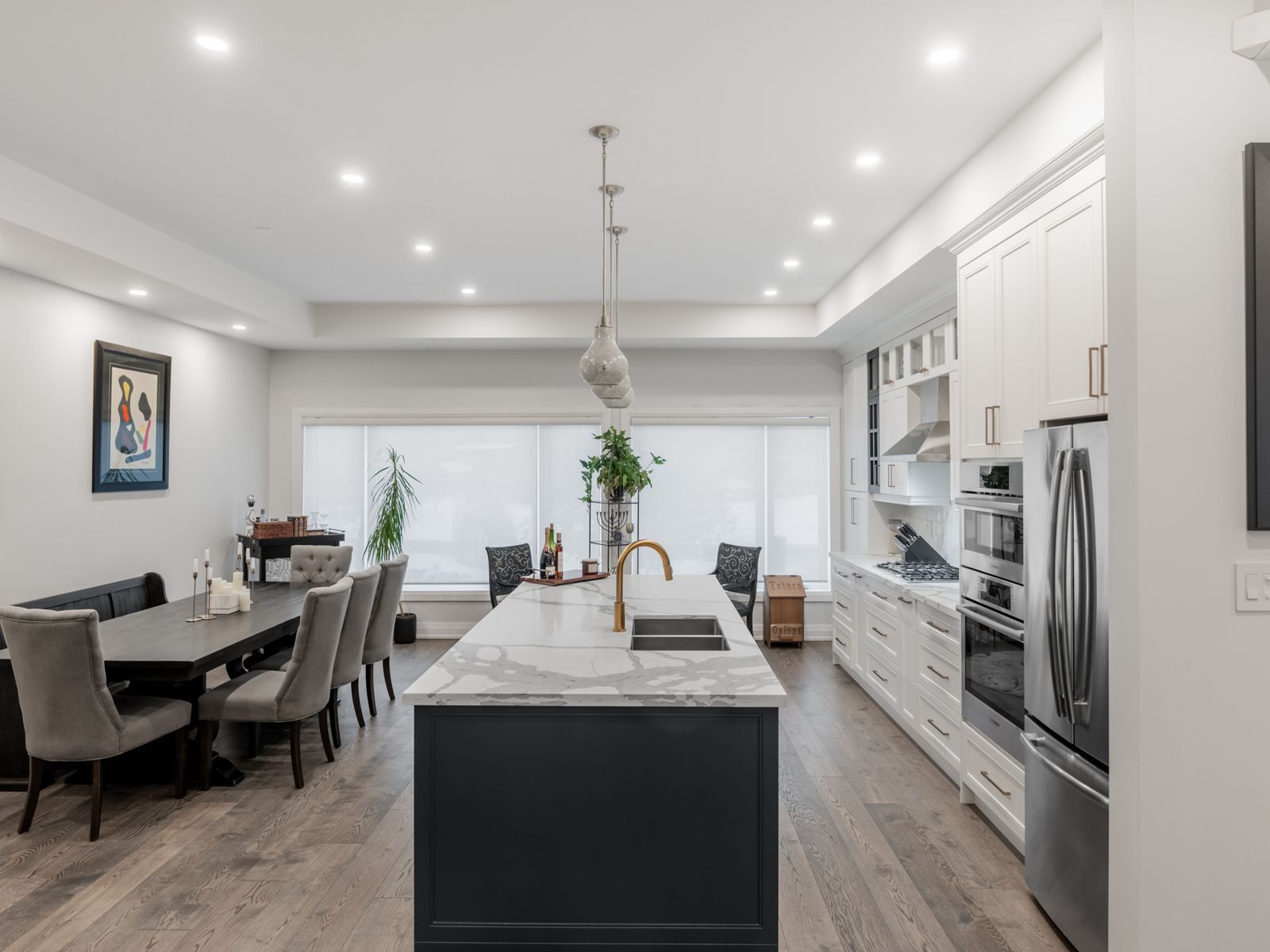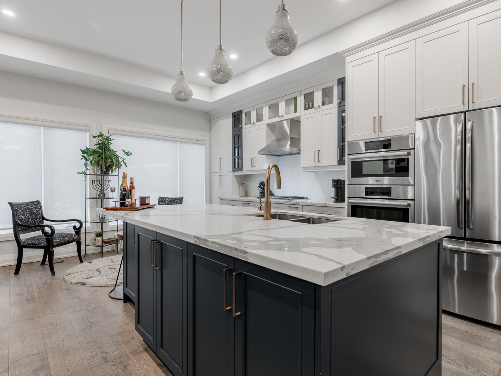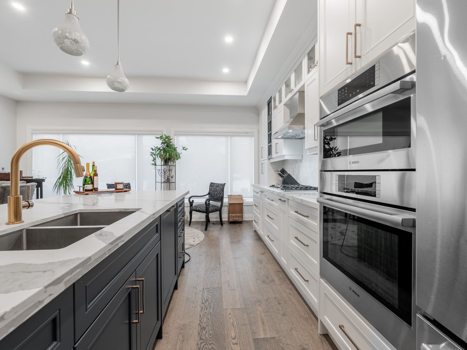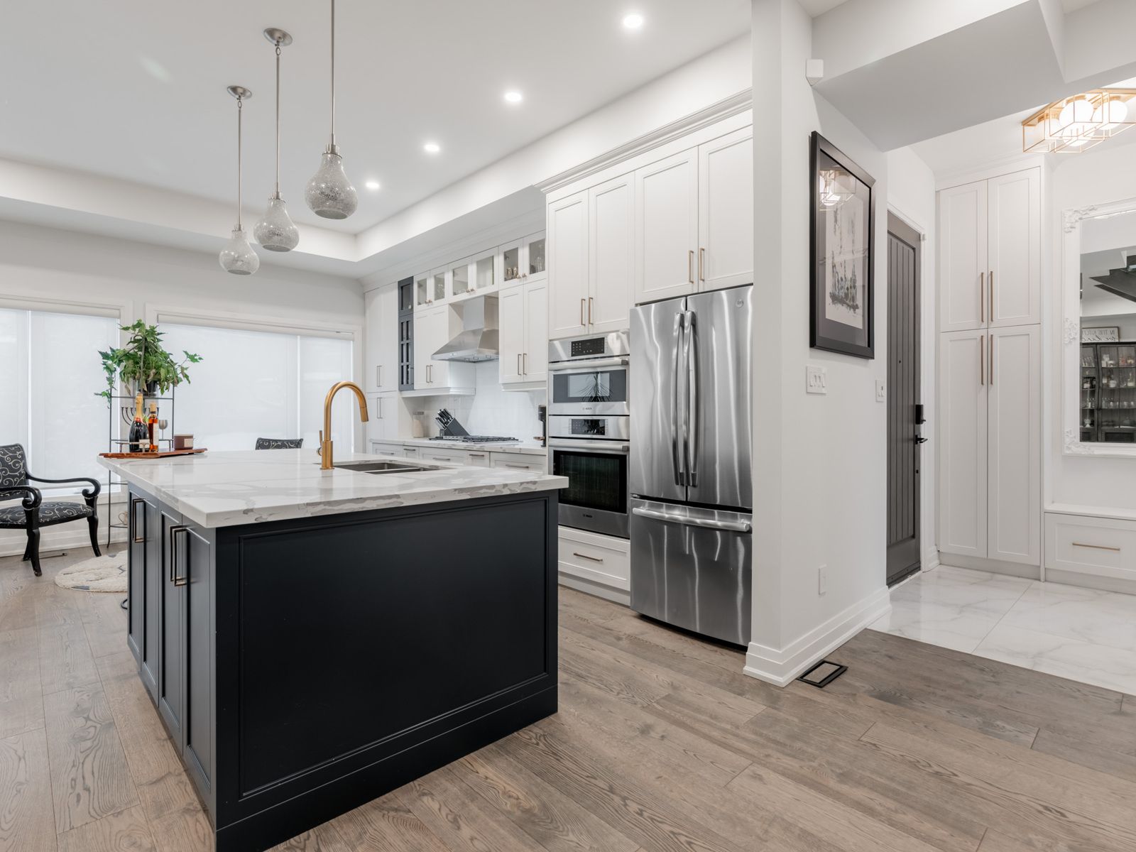 • Chef's kitchen features oversized quartz island and top-notch appliances.