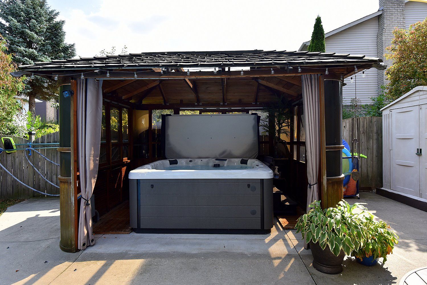 • Private backyard features a solar-heated pool and relaxing hot tub.