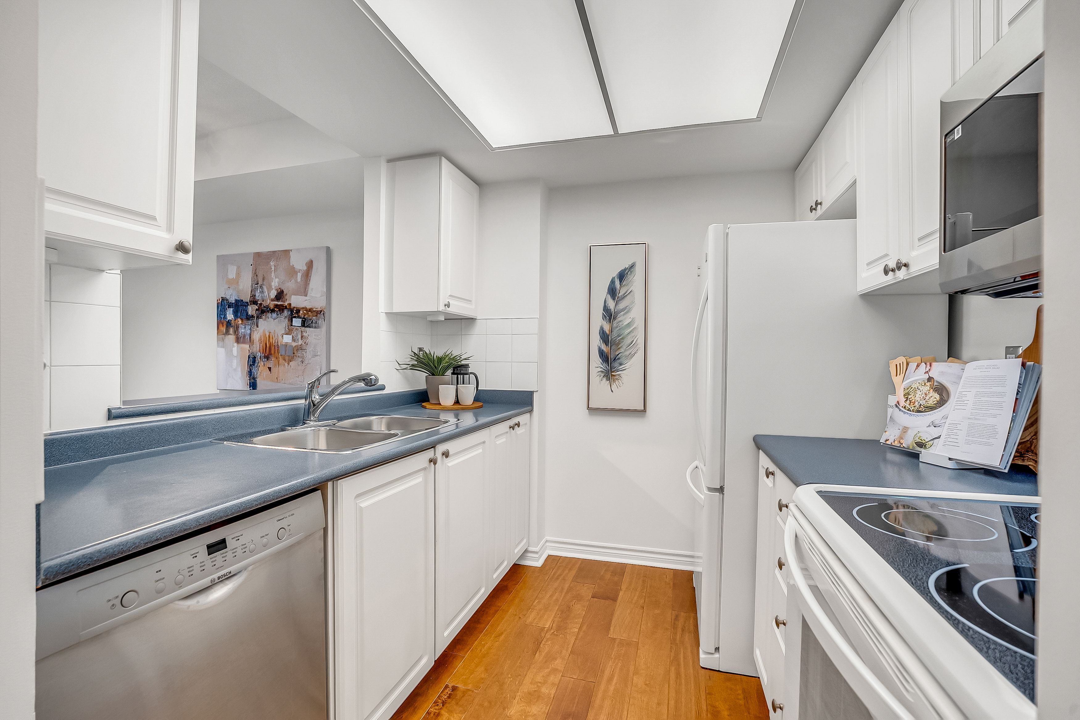 Spacious and beautifully designed oversized 1-bedroom suite offering an exceptional floor plan with a versatile open-concept office - perfect for working from home. Engineered hardwood flooring adds warmth and style, while the charming juliette balcony overlooks a peaceful courtyard setting. Enjoy the convenience of a generously sized laundry room with extra room for storage, plus separate locker and underground parking. Outstanding value with major mechanical components - including the hot water tank and heat pumps - owned and maintained by the condo corporation, meaning no cost to owners for repair or replacement. Suites are individually metered for hydro efficiency so you only pay for what you use, and an ensuite alarm system is wired directly to 24-hour security for added peace of mind. This well-managed building offers truly resort-style amenities including an indoor saltwater pool, whirlpool, fully equipped fitness centre, billiard and card rooms, workshop, guest suite, elegant party room with full kitchen, wet bar, dance floor, gas fireplace and terrace, plus a beautiful library, tennis court, car wash bay, fenced dog run, garden plots and potting room. On-site superintendent, property manager and 24-hour uniformed concierge/security ensure comfort and convenience, while an active social committee hosts cultural events, dinners, bbqs, fitness classes, book club and movie nights. Ideally located within walking distance to groceries, coffee shops, the aga khan museum and cf shops at don mills, with easy access to ttc, the lrt, future access to the ontario line to downtown, dvp and highway 401, plus nearby hiking and biking trails.
