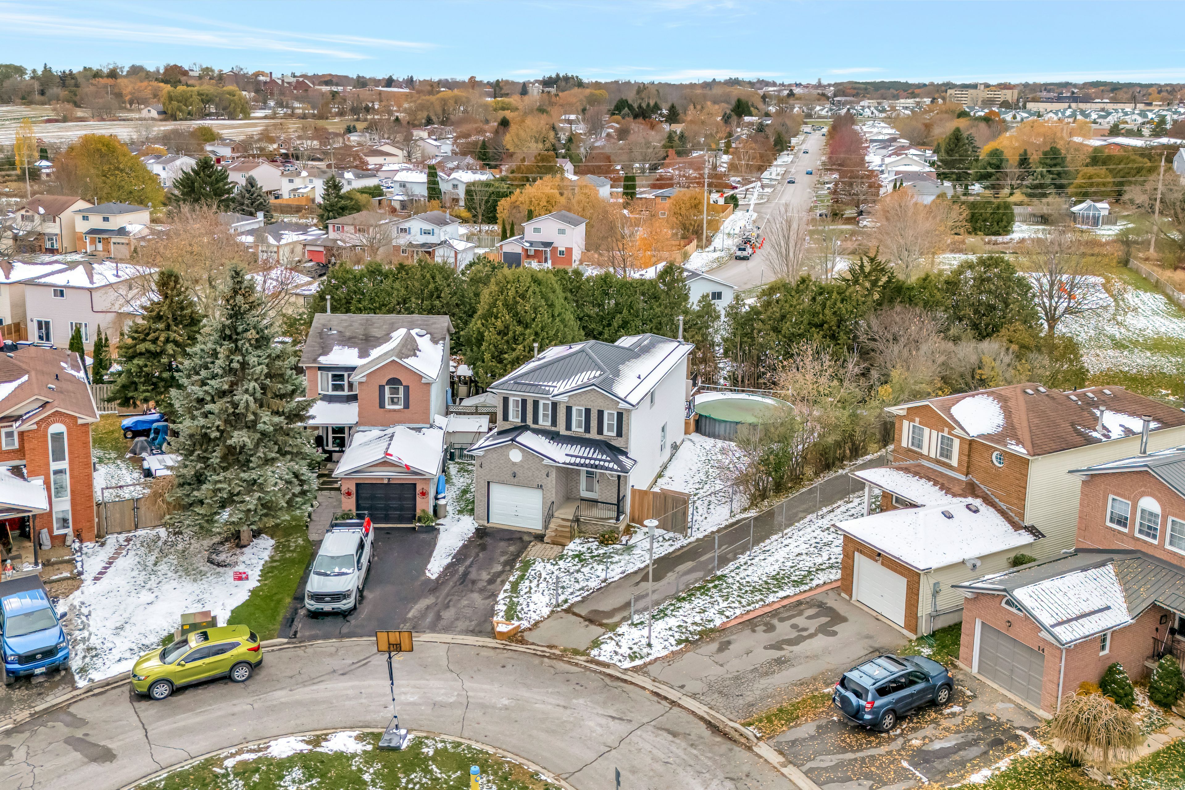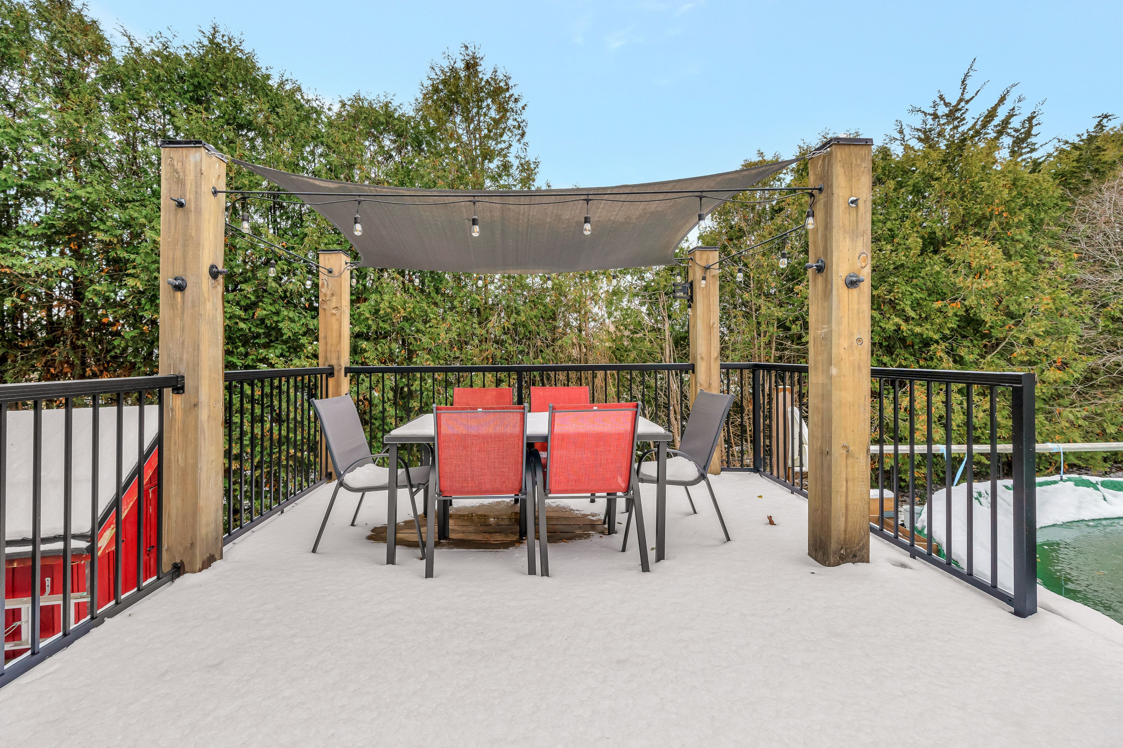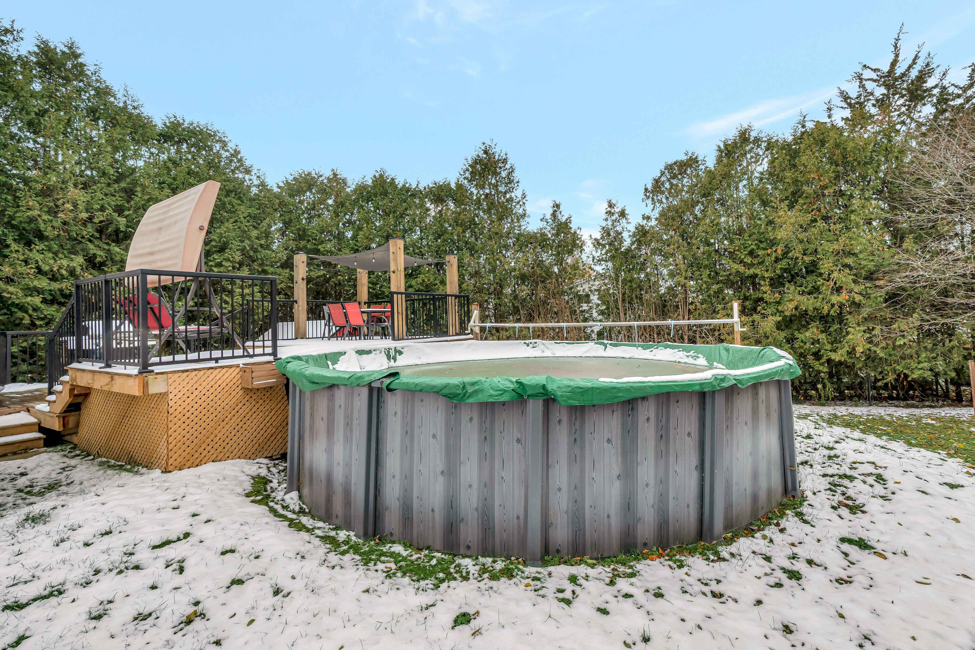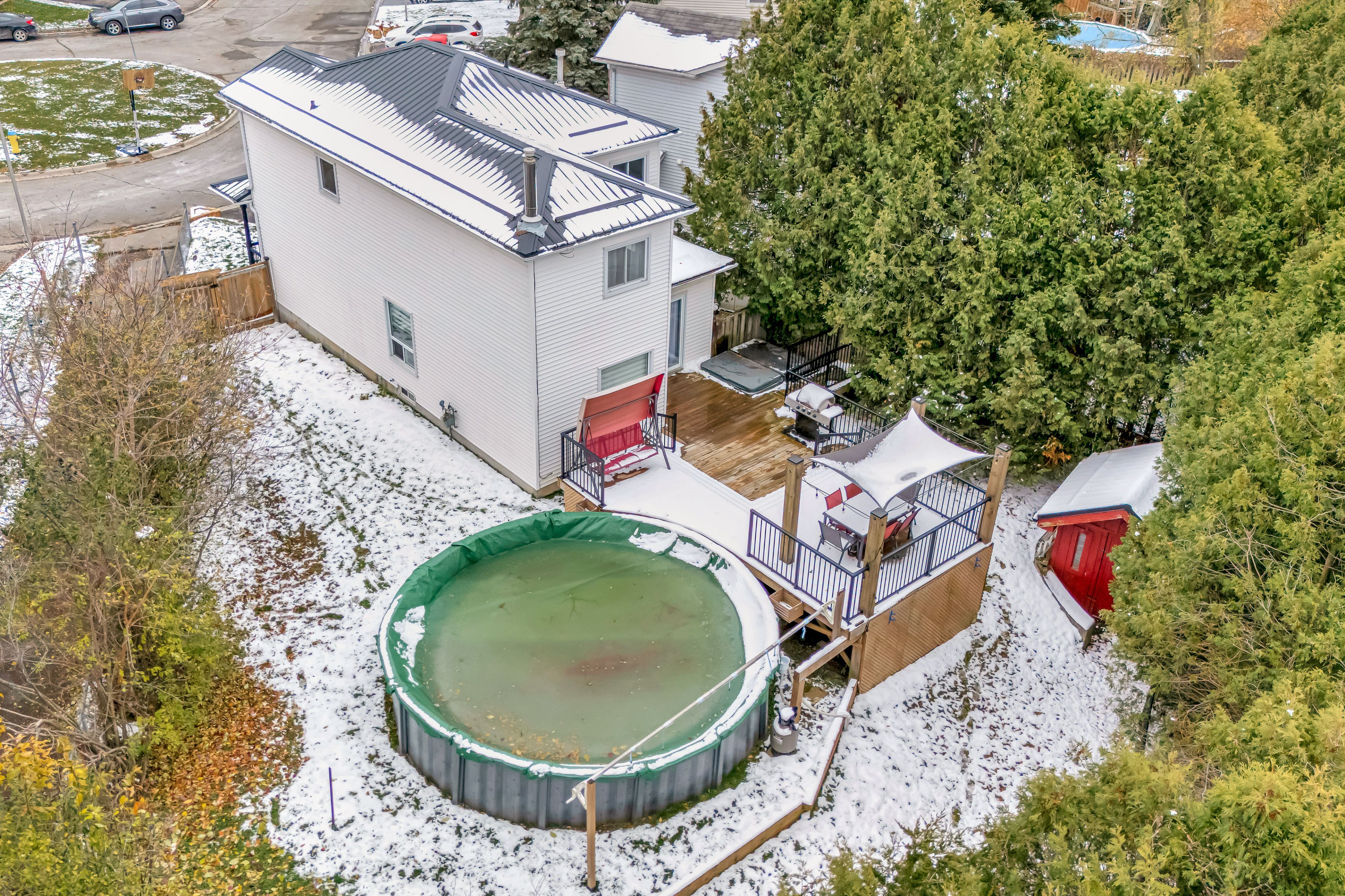 Charming port hope 3 bedroom, 2 bath, 2-storey home situated in a great family neighbourhood. The main floor features an updated kitchen with quartz counters and a bright eat-in dining area with walkout to the rear deck, plus a cozy living room with gas fireplace and convenient 2pc bath. Upstairs offers two secondary bedrooms and a newly renovated main bath showcasing a luxurious soaker tub, double sinks with quartz counters, custom tiled glass shower (schluter waterproofed), luminous anti fog mirror and heated floors. Semi-ensuite access to the spacious primary bedroom with walk-in closet. The finished lower level provides a great rec room space-currently set up with a pool table (included)-plus built-in bench seating, laundry and utility areas. Outside features a new deck, hot tub, above-ground pool, and usable yard space, ideal for summer entertaining. Attached one-car garage with myq wifi opener adds convenience and functionality. Pathway access to hewson park just steps away. Updates: metal roof (2023 on garage & over kitchen; main roof 2025), deck (2020), above-ground pool (2020), ac (2018), main bath renovation (2024), basement finishing (2018). All completed with necessary permits. Move-in ready and easy to show in this welcoming family location!