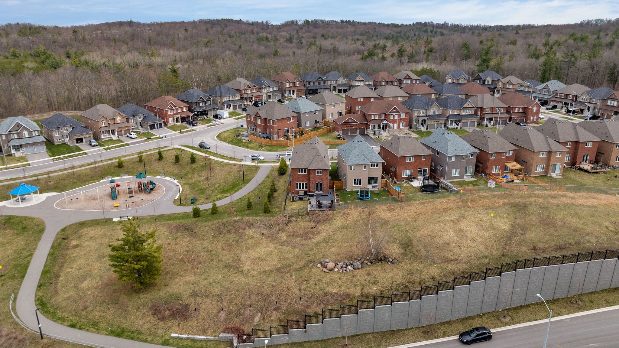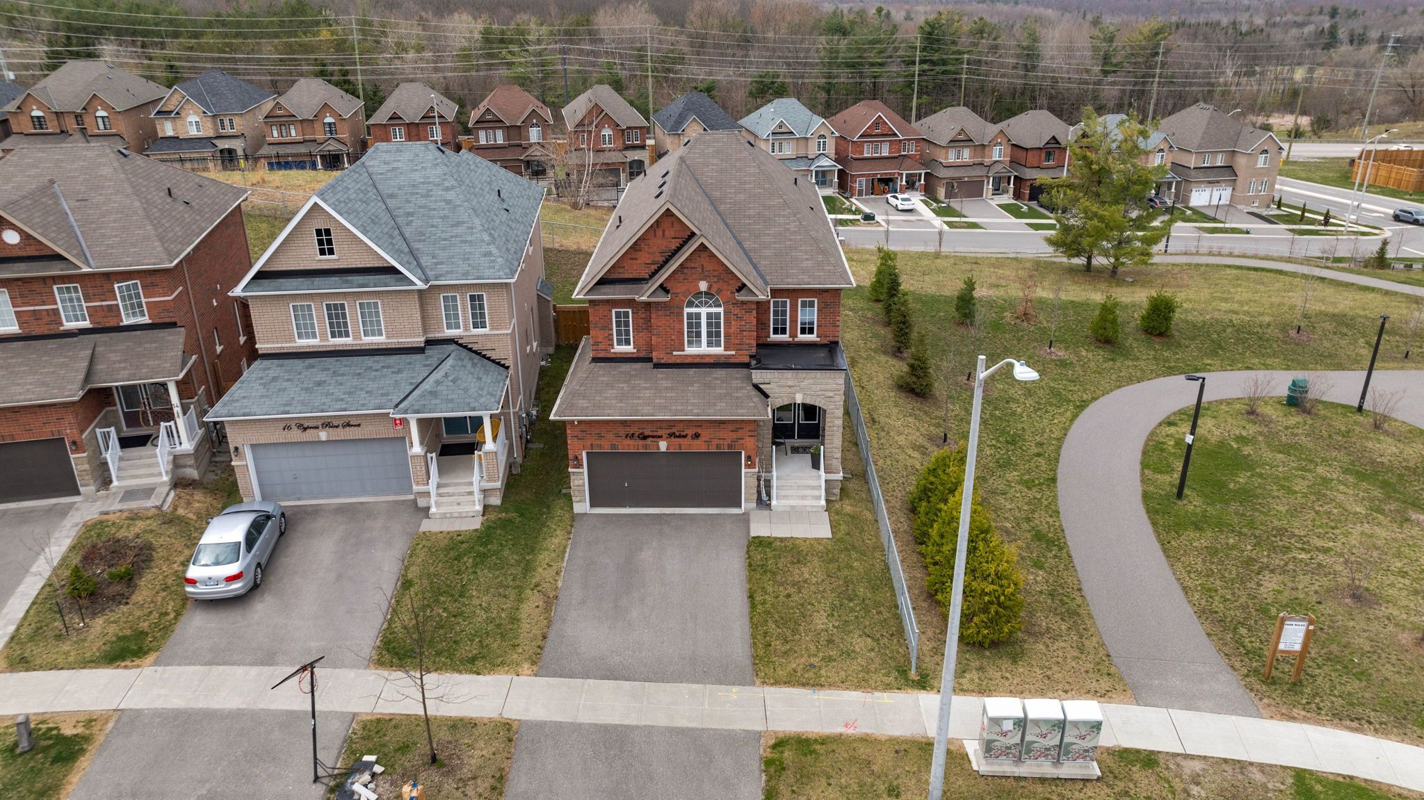 Welcome to 18 cypress point street located within a small enclave of homes in one of barrie's newer communities - pineview greens estates. This well-appointed family home offers stylish design, many upgrades, generous living space. Situated in a family centric neighbourhood, siding onto a park and open space, having direct neighbours on only one side - provides an extra level of privacy. With over 2,400 sq. Ft., this two story detached 3-bedroom royal park home is very well appointed with high-end design and functional detail at every turn. Welcoming front entrance via the covered front porch leads you into a grand foyer with 18' ceilings, 2pc guest bath, main floor laundry room, direct inside access to double garage. Step inside to find the stylish kitchen ready to delight the family's chef - tasteful white cabinetry, under mount lighting, centre island w/sink, stunning backsplash, s/s range hood, quartz countertops, s/s appliances, plenty of storage. This functional layout flows seamlessly into the convenient eating area, then extends your living space outdoors to your private fenced rear yard via upgraded patio doors. 9' ceilings, over-sized window package completely bathe this space with the warmth of natural light. Easy maintenance tile and hardwood flooring throughout. Open concept floor plan - kitchen - living room - dining room + incredible banquette with beverage centre - is perfect for entertaining. Custom coffered ceilings. Living room flows to the formal dining space for family time, special meals with guests. Beautiful oak staircase leads to the private level with large bedrooms. Primary with a sitting area, massive closet and oversized 5pc spa-like ensuite with glass shower, soaker tub. Two additional bedrooms with jack & jill main bath. This home offers plenty of functional storage. Full, unfinished basement for your own plans and design (cantina, r/i bath). Step outdoors to appreciate the beautiful unistone patio in the rear fully fenced yard.