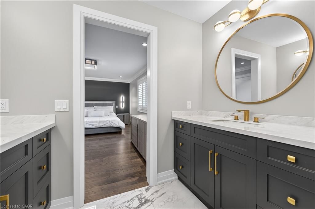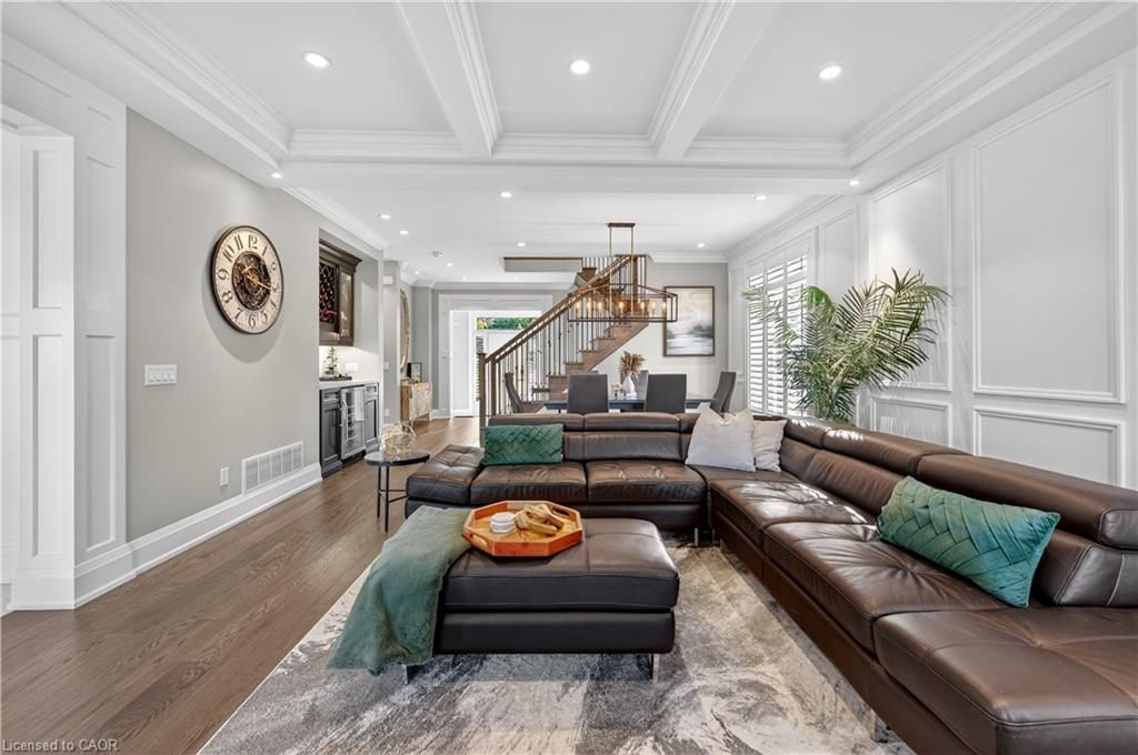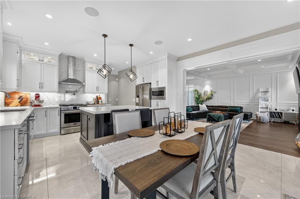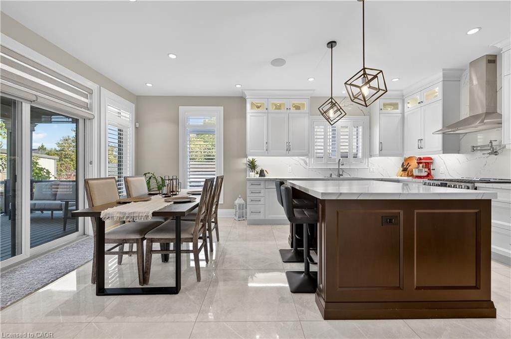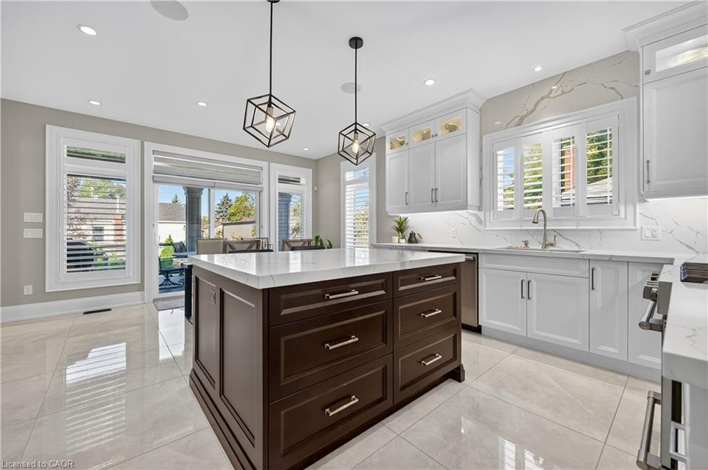 Prepare to be impressed by this meticulously crafted, fully custom 3-bedroom, 2. 5-bathroom residence offering 2,531 sq ft of luxurious living on a generous 50x108 ft lot. From the moment you arrive, the home's full brick and stone façade, arched windows, and covered porch speak to the quality and pride of ownership throughout. Inside, every detail is elevated - engineered hardwood and porcelain tile span the entire home. Solid wood interior doors, coffered ceilings, pot lights (including on all 4 sides of the home's exterior), and crown moulding define each space with sophistication. The kitchen is an entertainer's dream, complete with custom cabinetry, quartz countertops, high-end appliances, in-ceiling speakers, and a spacious island. It opens effortlessly to a dining area and large living room anchored by a floor-to-ceiling stone gas fireplace and built-in wet bar. The primary suite is a sanctuary, offering a large walk-in closet with custom cabinetry and a dedicated makeup station. The ensuite bath includes a double vanity, and a private water closet. Upstairs bathrooms also feature quartz surfaces and private toilet rooms for added convenience. A wide staircase enhances flow, and thoughtful extras include central vac with in-wall hose systems on every level, closet lighting throughout, and california shutters. Step outside to a covered back porch and fully fenced backyard where freshly planted cedars promise enhanced privacy in the seasons to come. The unfinished basement - with its own private side entrance and insulated subfloor - offers endless possibilities. With a double-car garage and four-car driveway, this property checks every box for luxury, comfort, and long-term livability.
