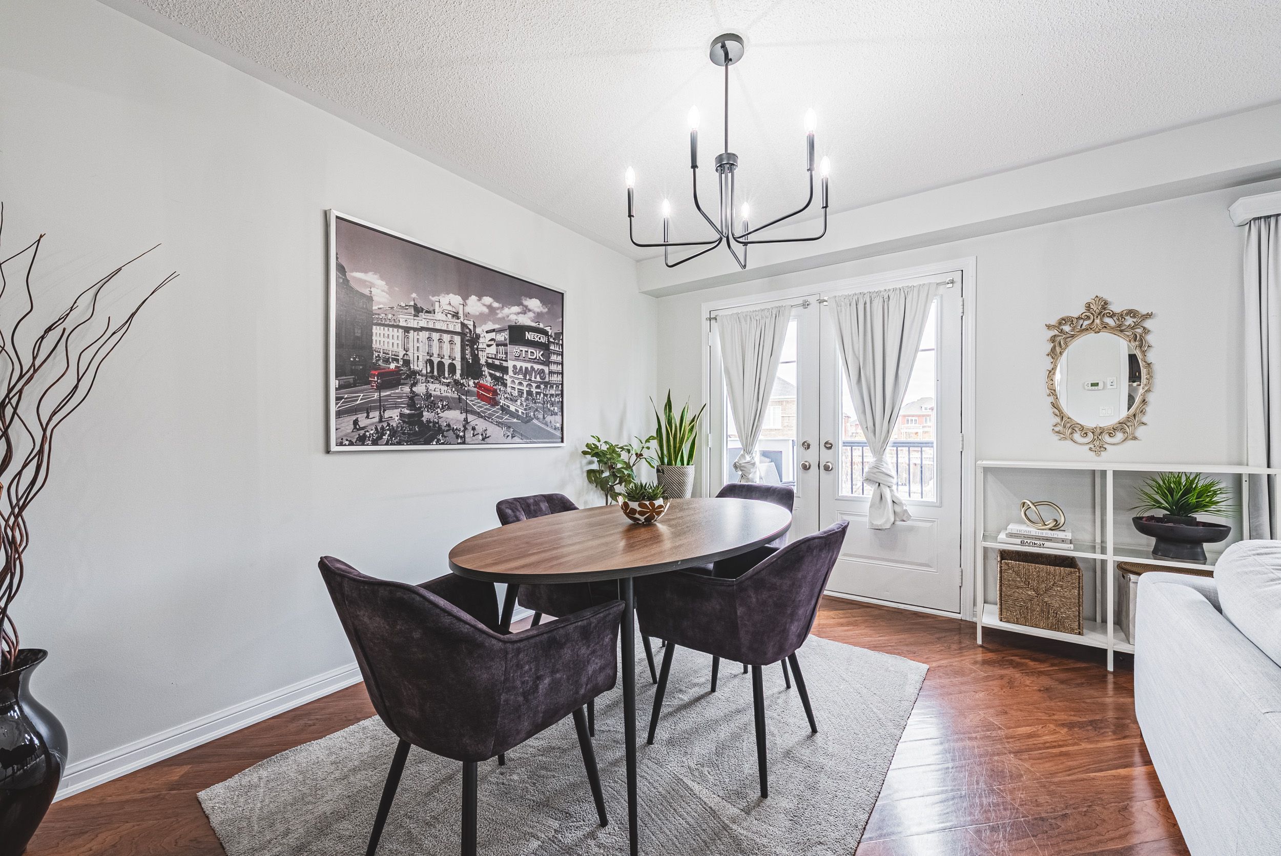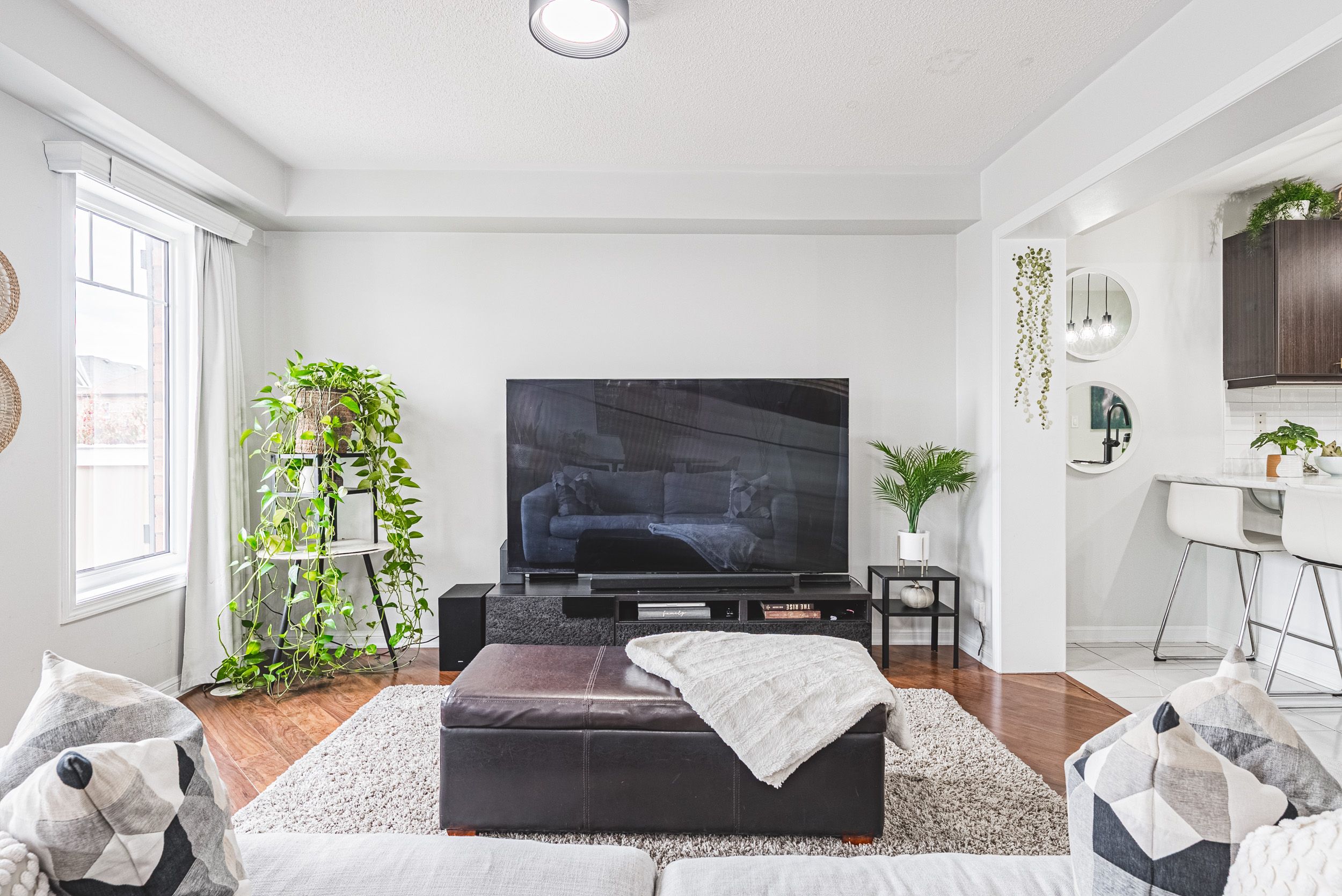 • Bright open-concept living and dining area with large windows.
