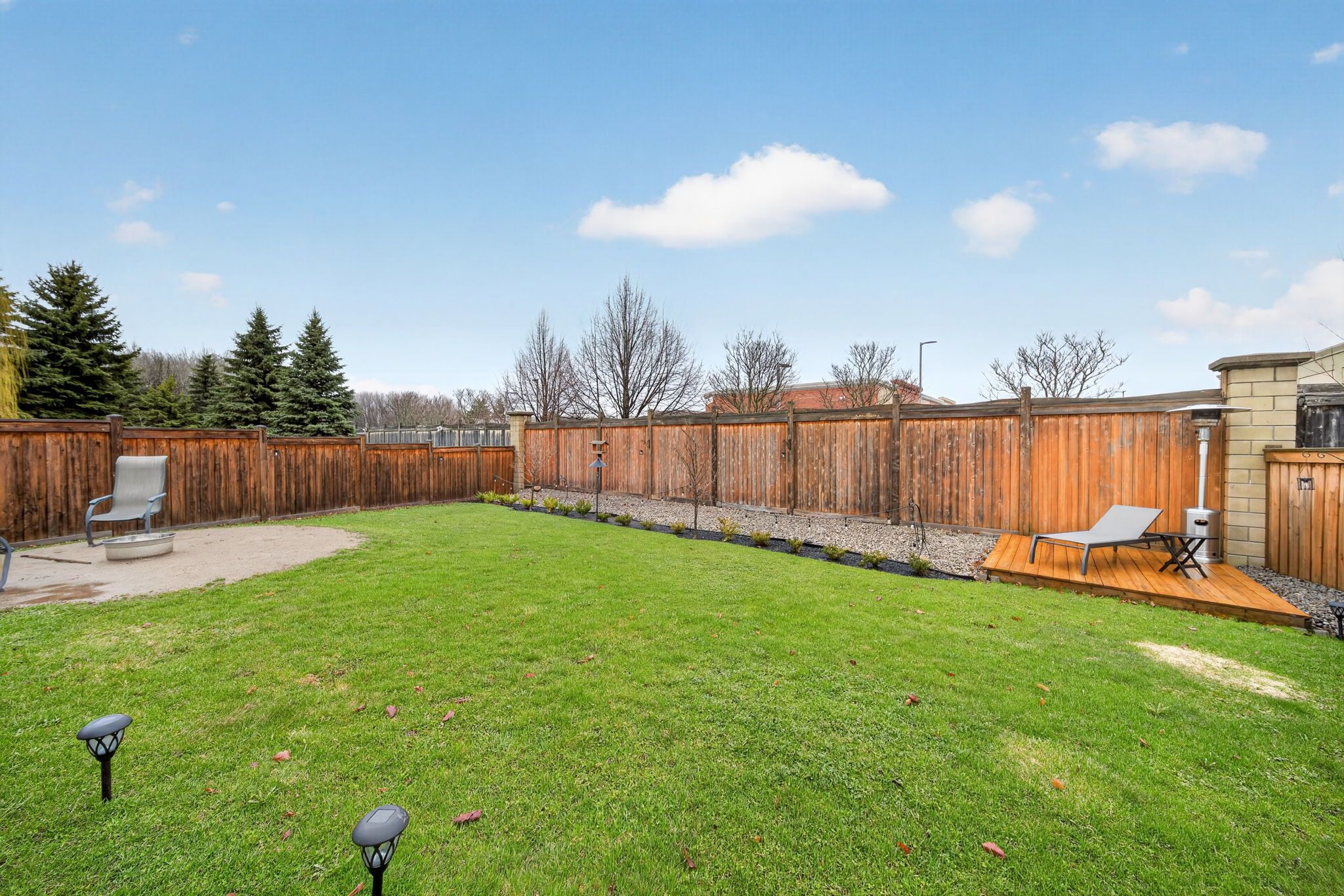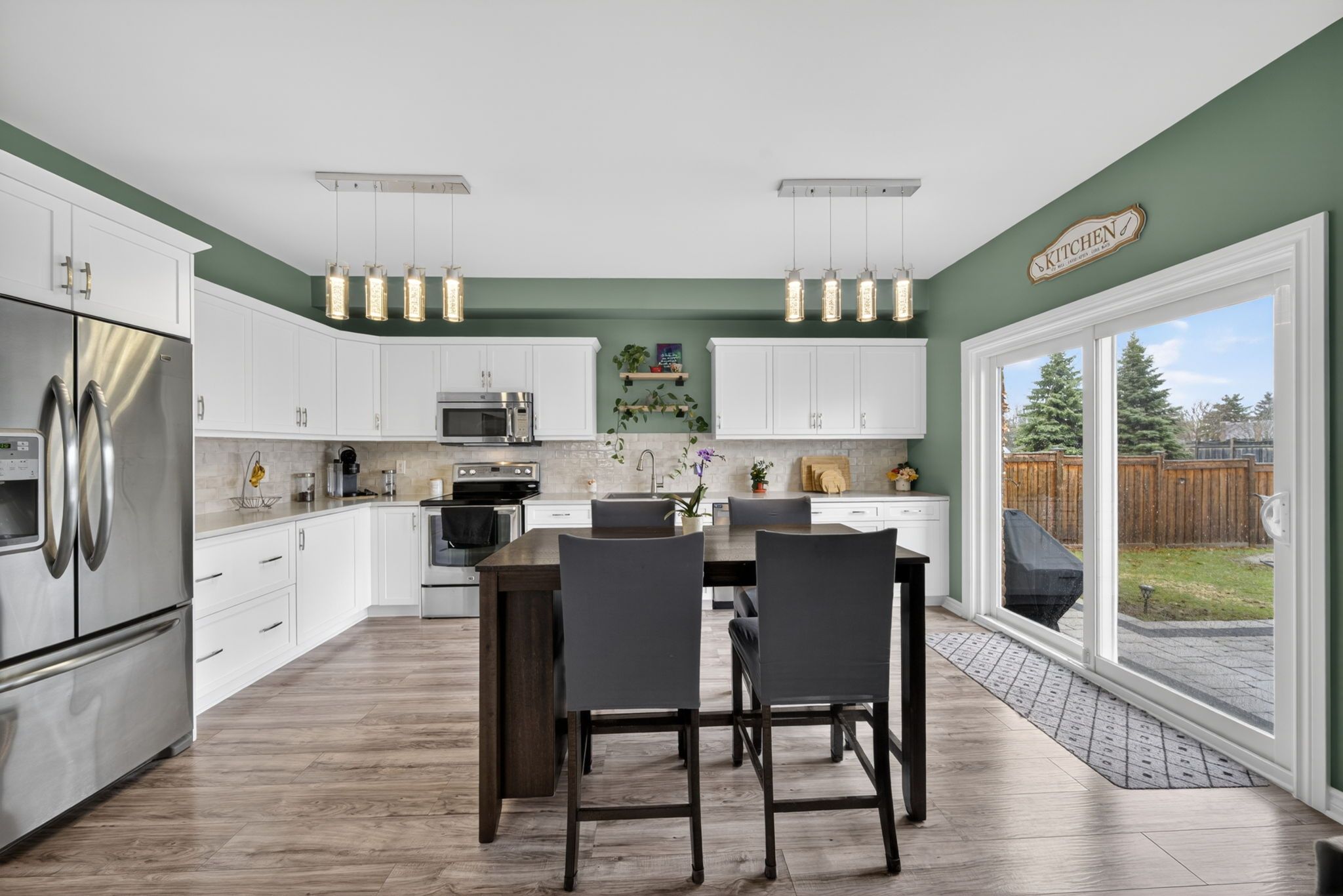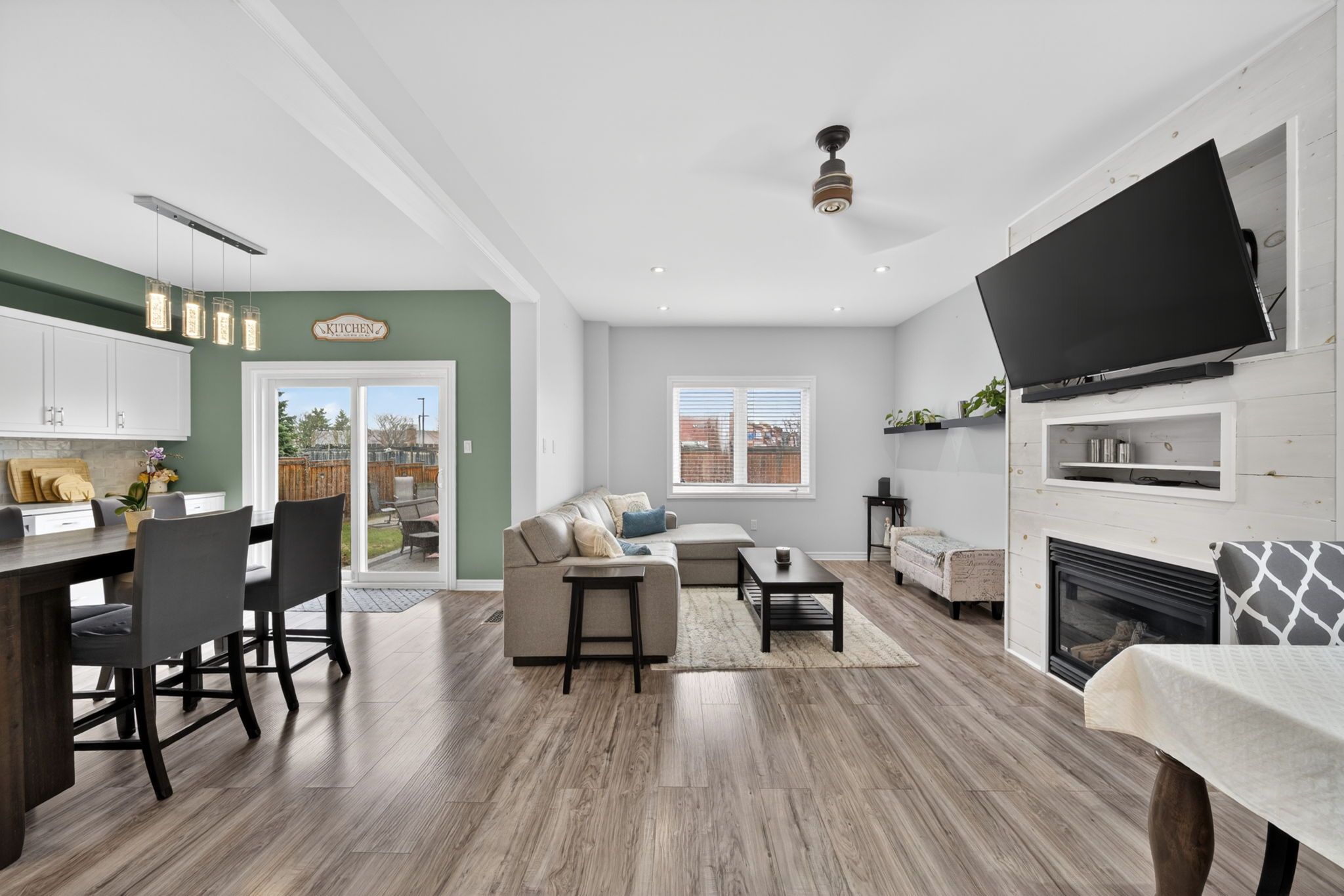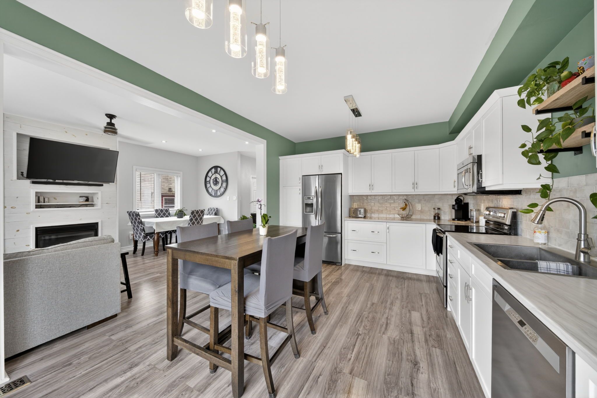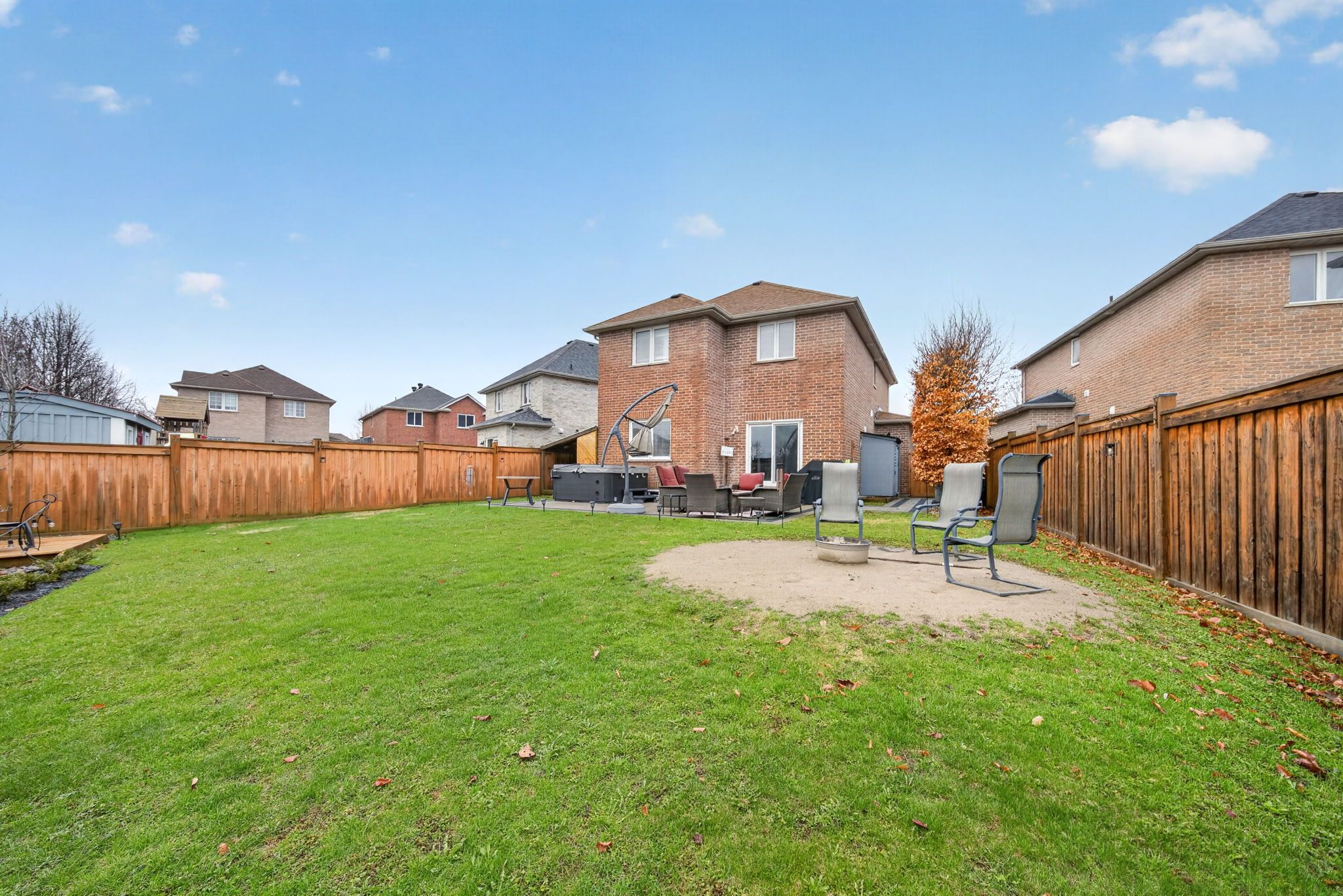 Welcoming front porch invites you to this charming detached home offering 4 bedrooms and 3 bathrooms in a bright, open layout ideal for family living and entertaining. The main floor features an eat-in kitchen that flows seamlessly into a combined living/dining area anchored by a cozy gas fireplace. Convenient main-level garage entry and a dedicated laundry room add everyday practicality. Step through the walk-out to a private, landscaped pie-shaped lot with a hot tub and custom fire pit-perfect for relaxing or hosting friends. Generous bedroom sizes and versatile living spaces provide room for a home office, playroom or guest suite. Large unfinished basement for your added value with 10'x 8'cold storage & rough in for washroom. Enjoy his family-friendly neighbourhood close to schools, parks, community centres and the lake, this home blends comfortable indoor living with outstanding outdoor amenities.