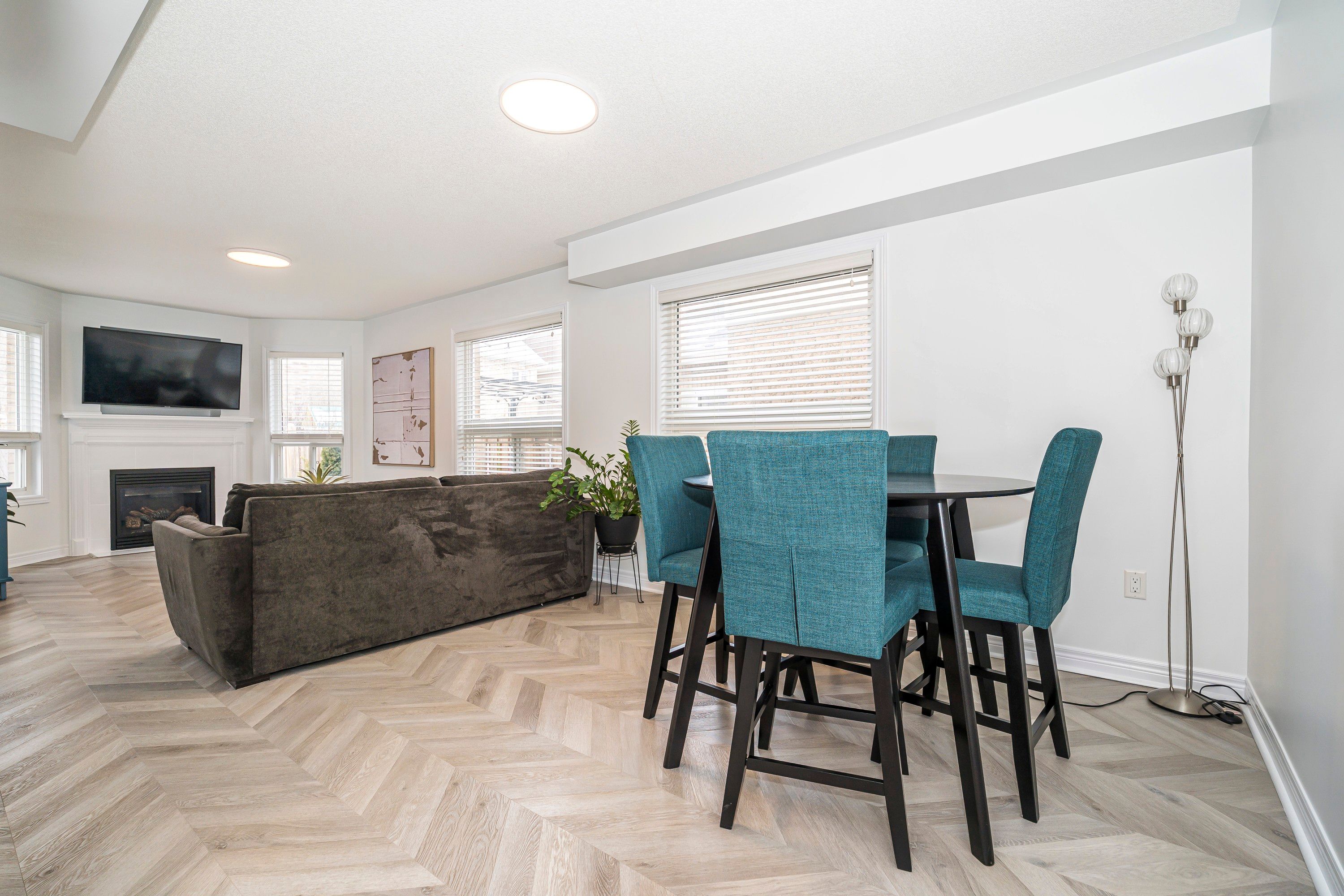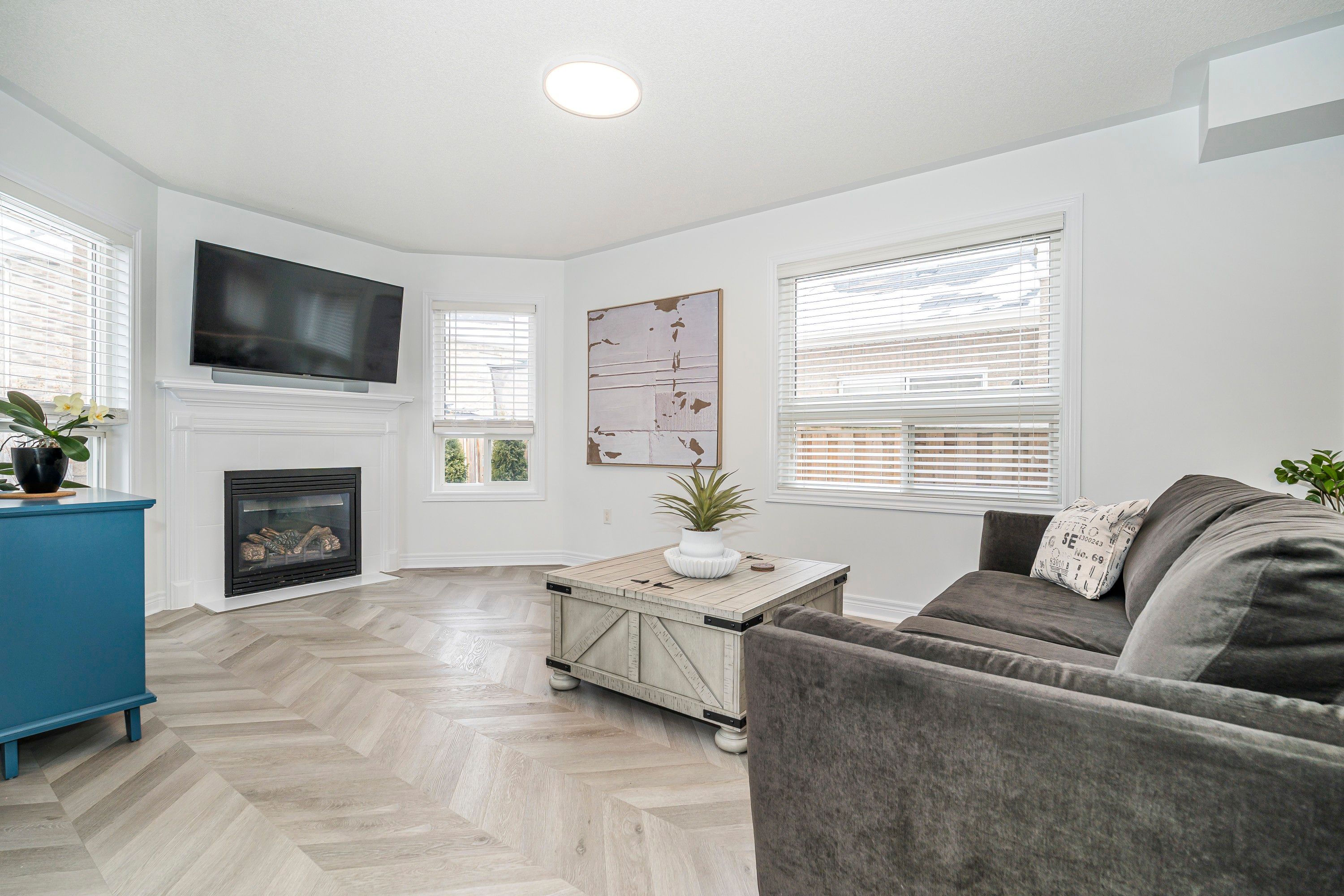 • Spacious great room featuring a cozy gas fireplace and large windows.