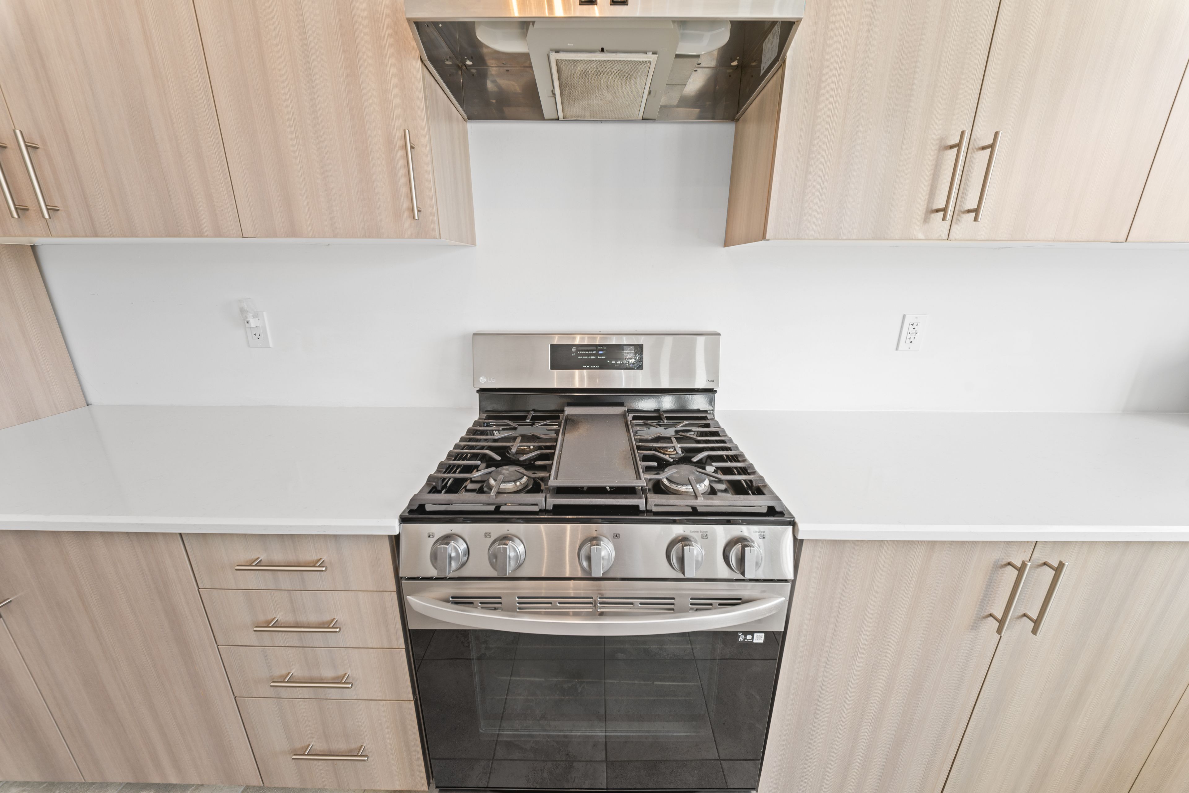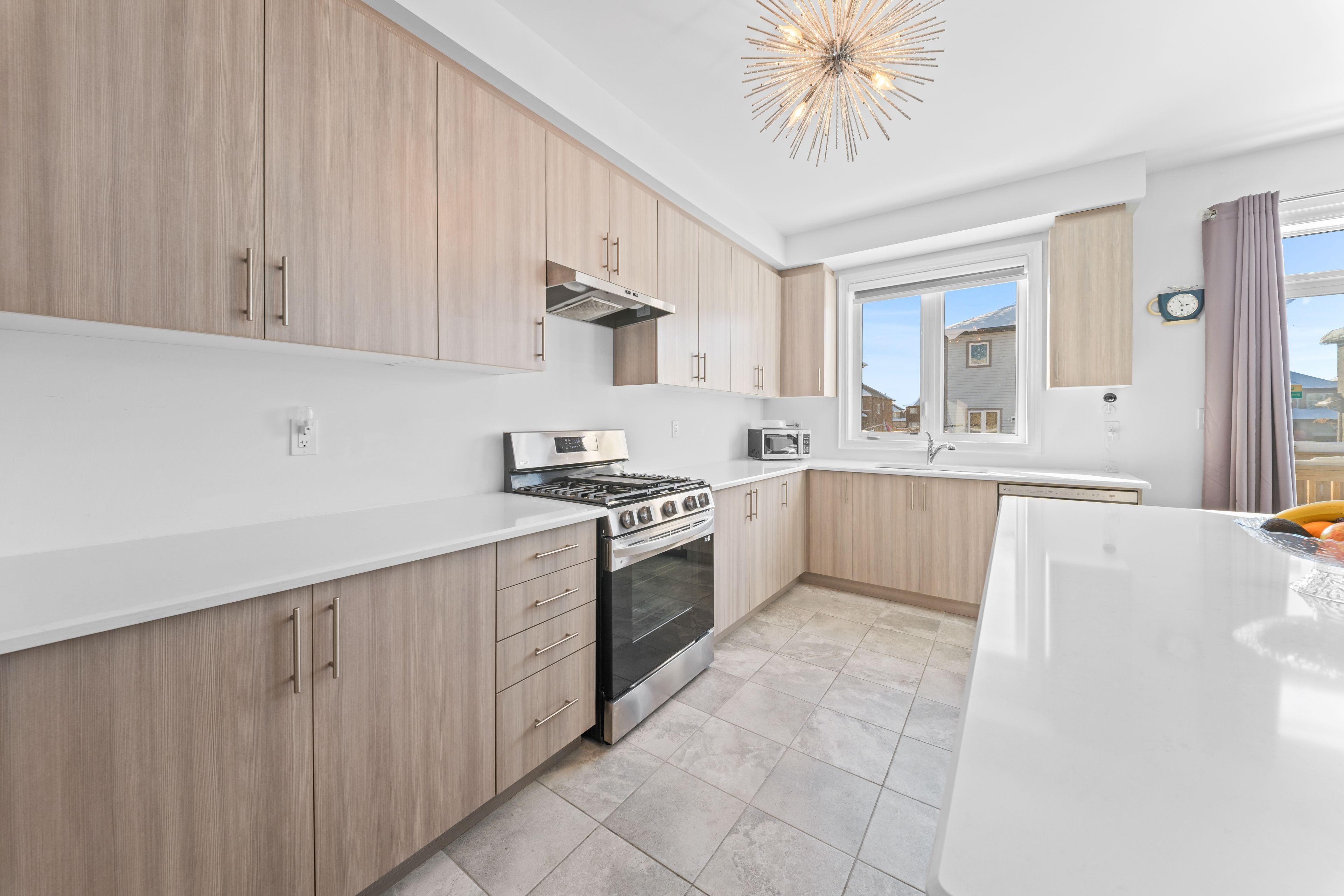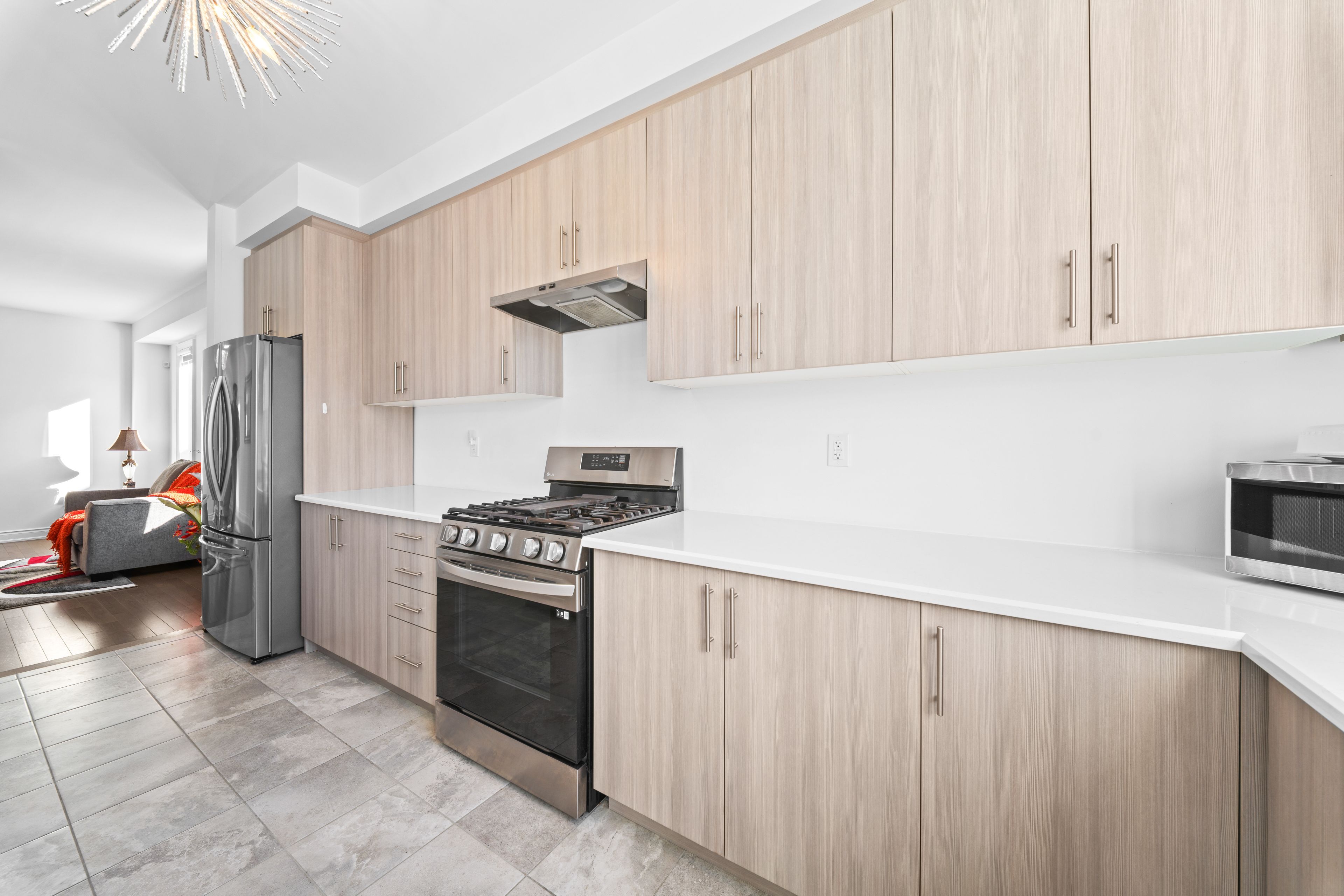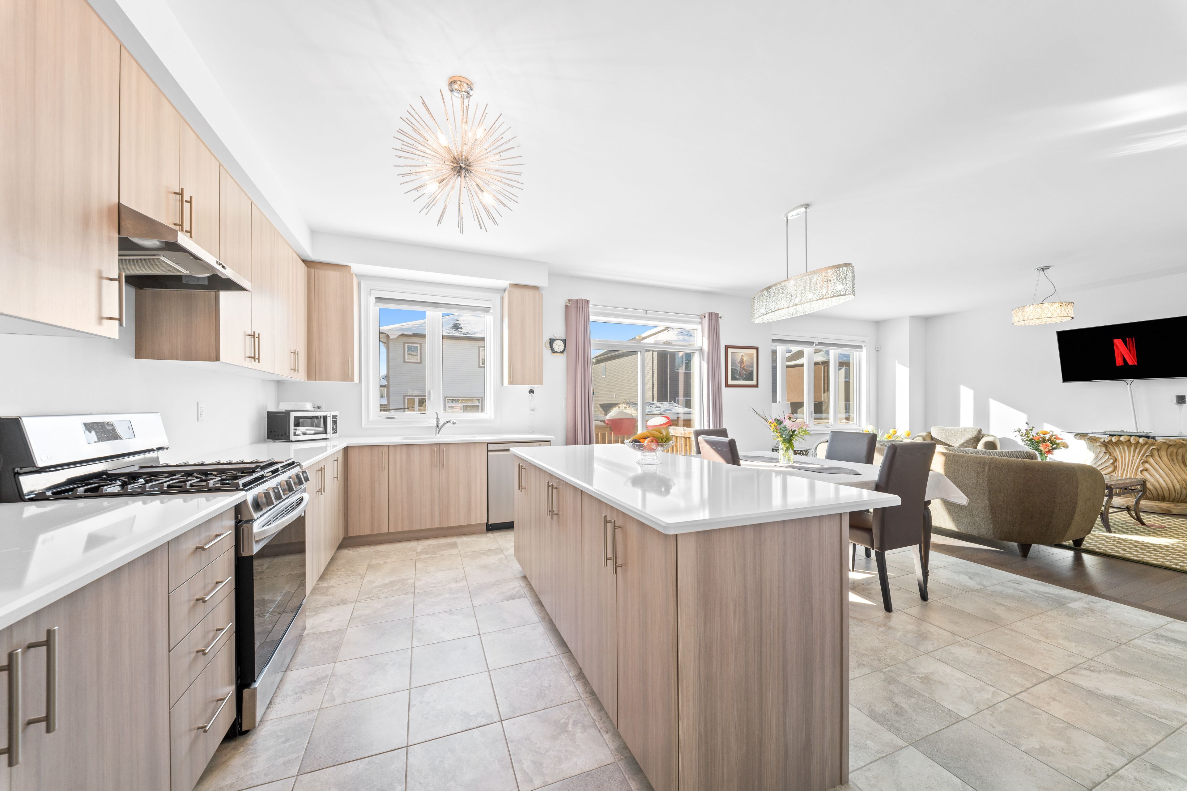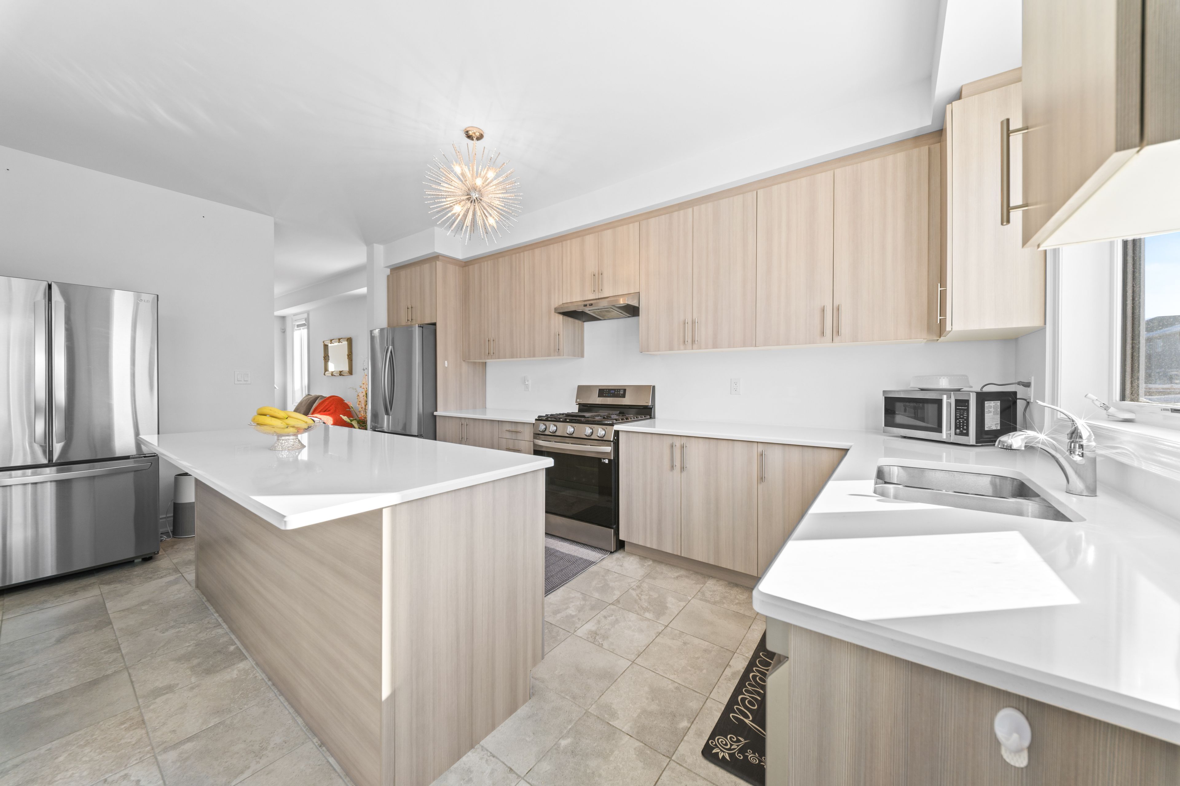 • Contemporary kitchen with quartz surfaces and oversized island for gatherings.