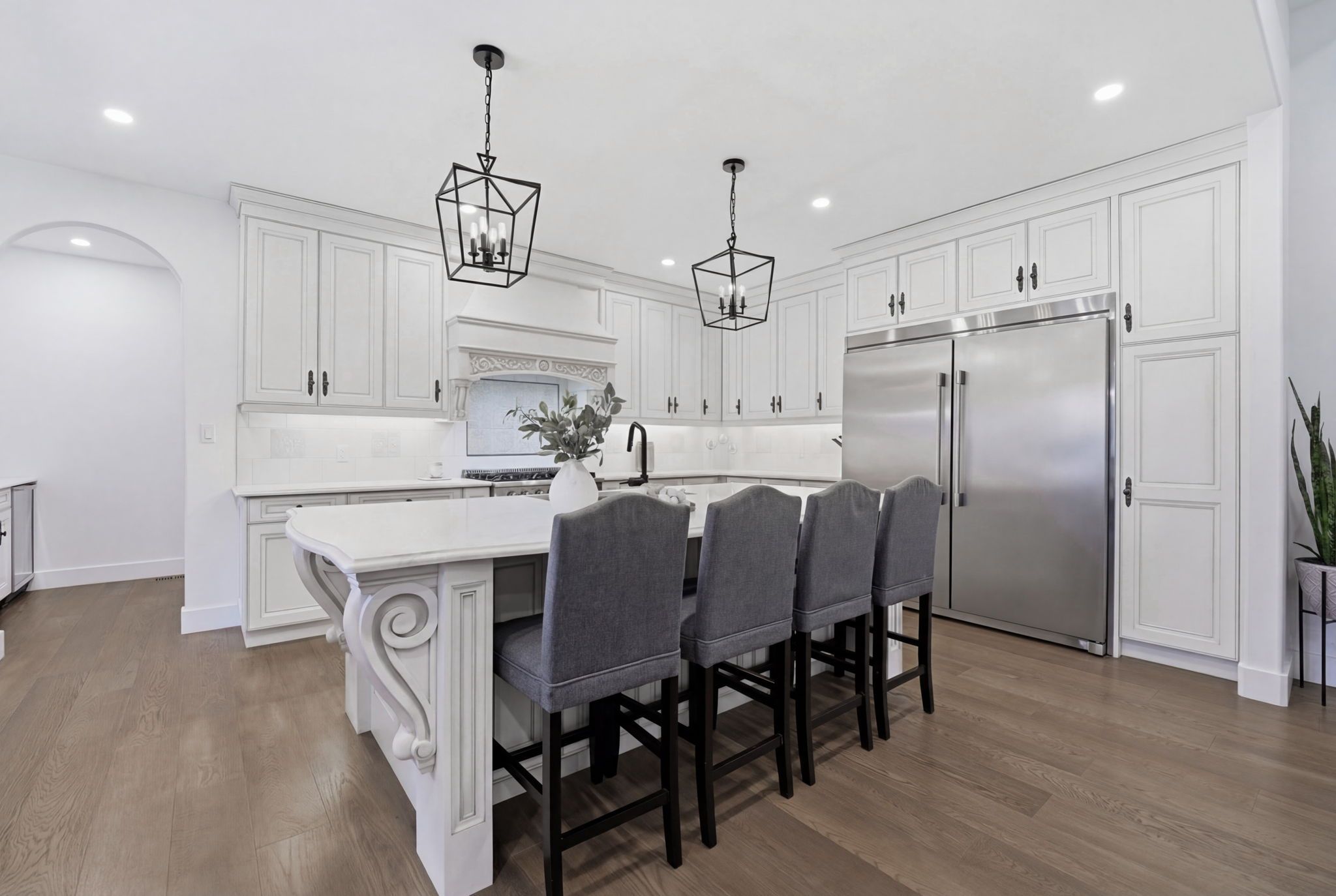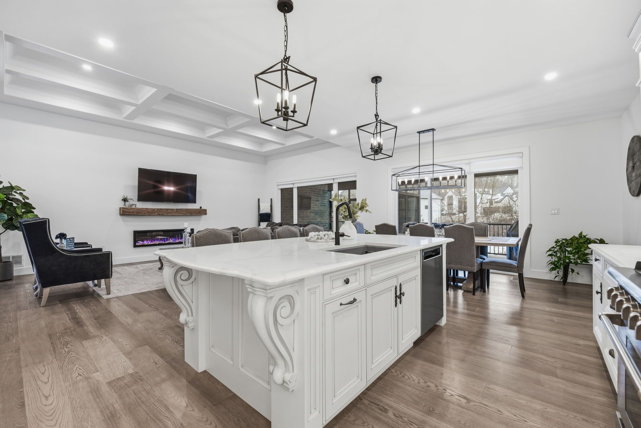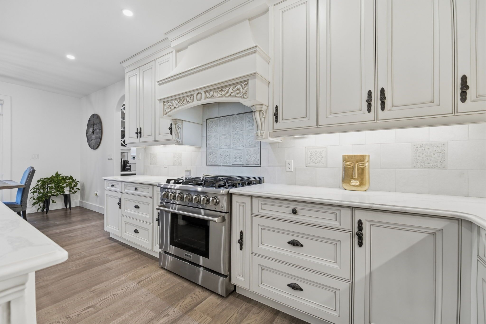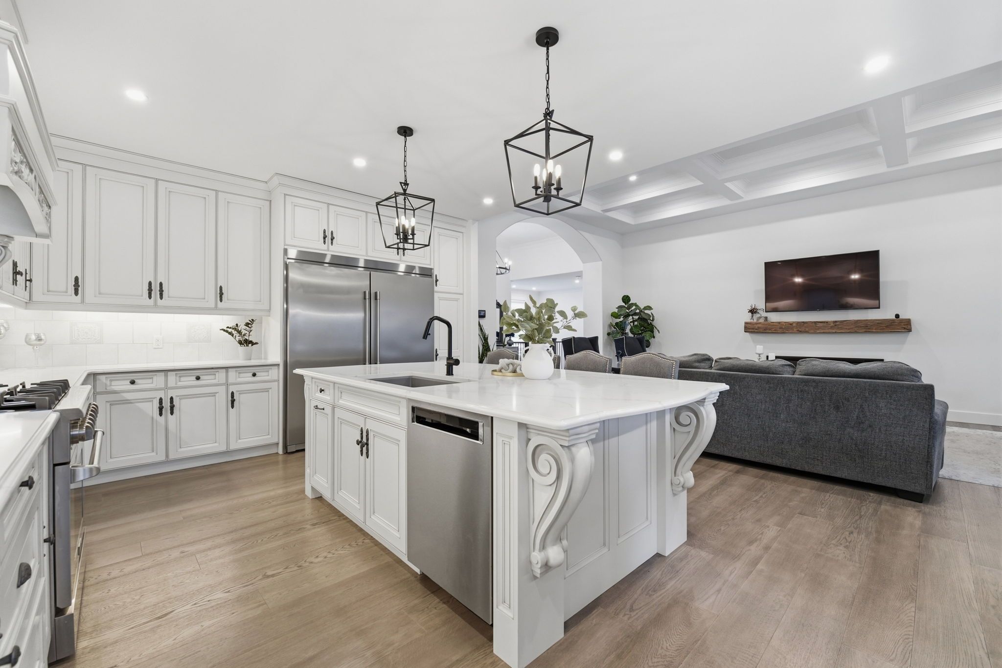 • Chef-inspired kitchen featuring quartz countertops, large island, and built-in appliances.
